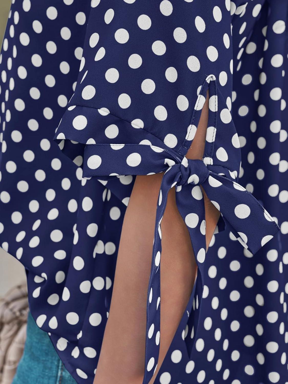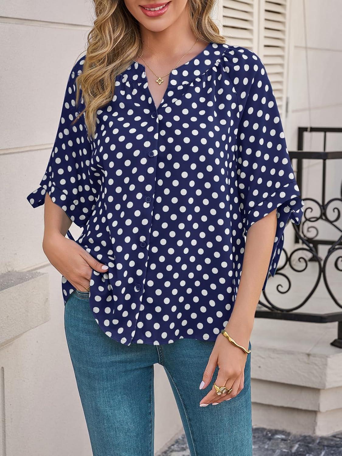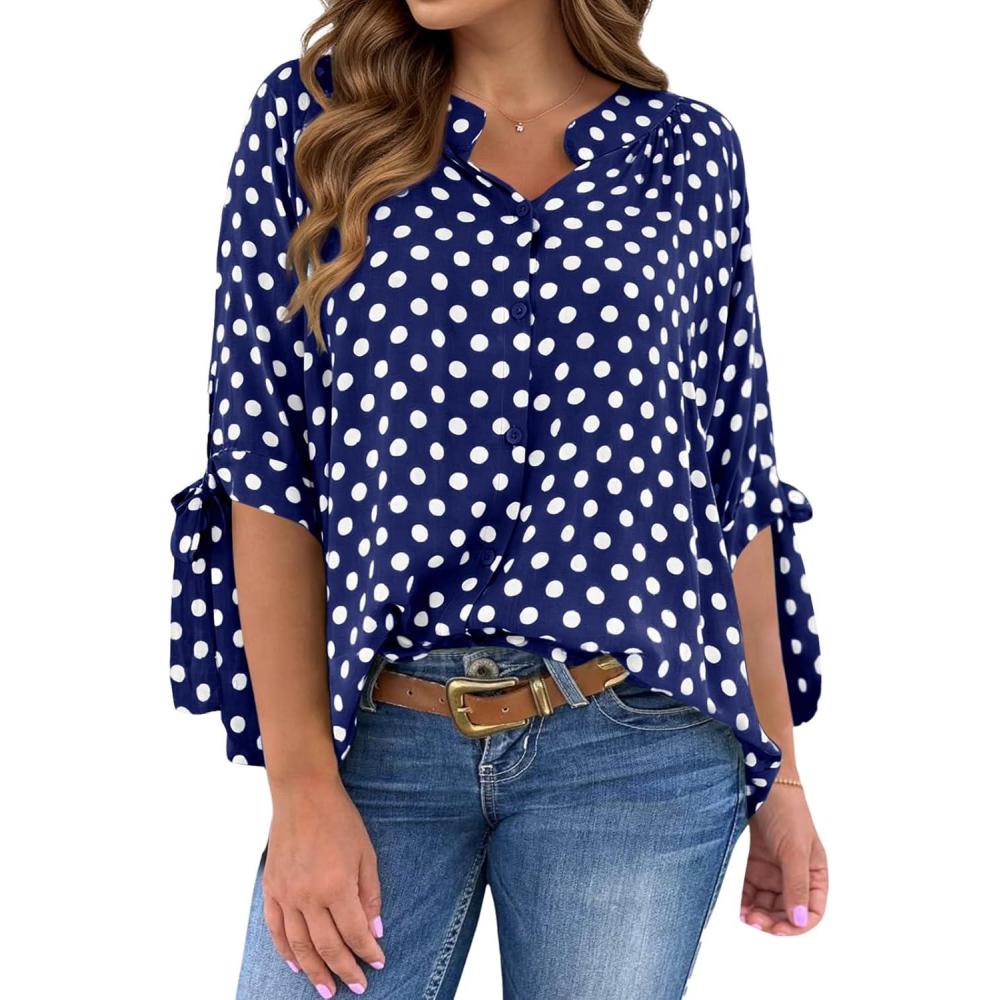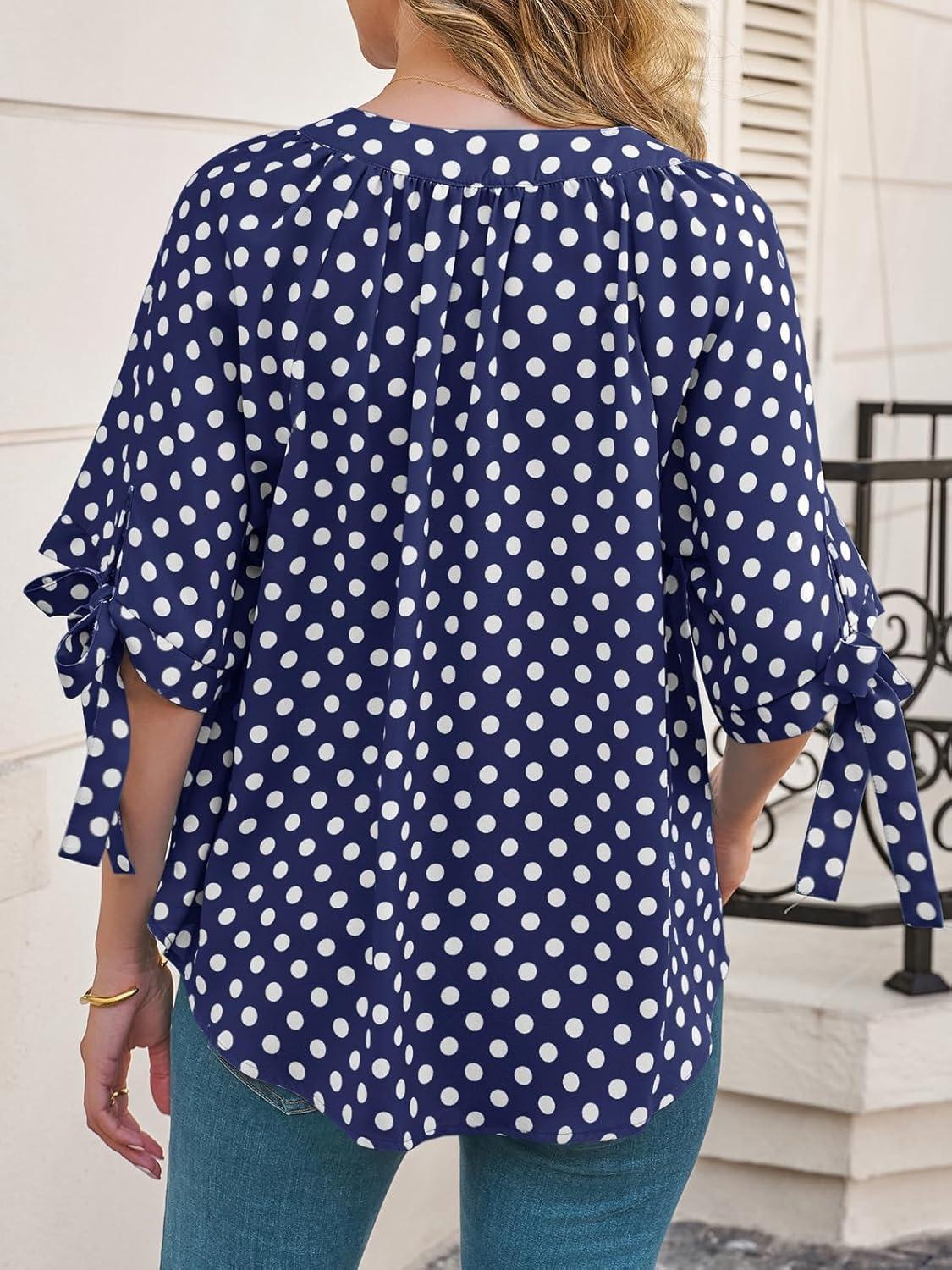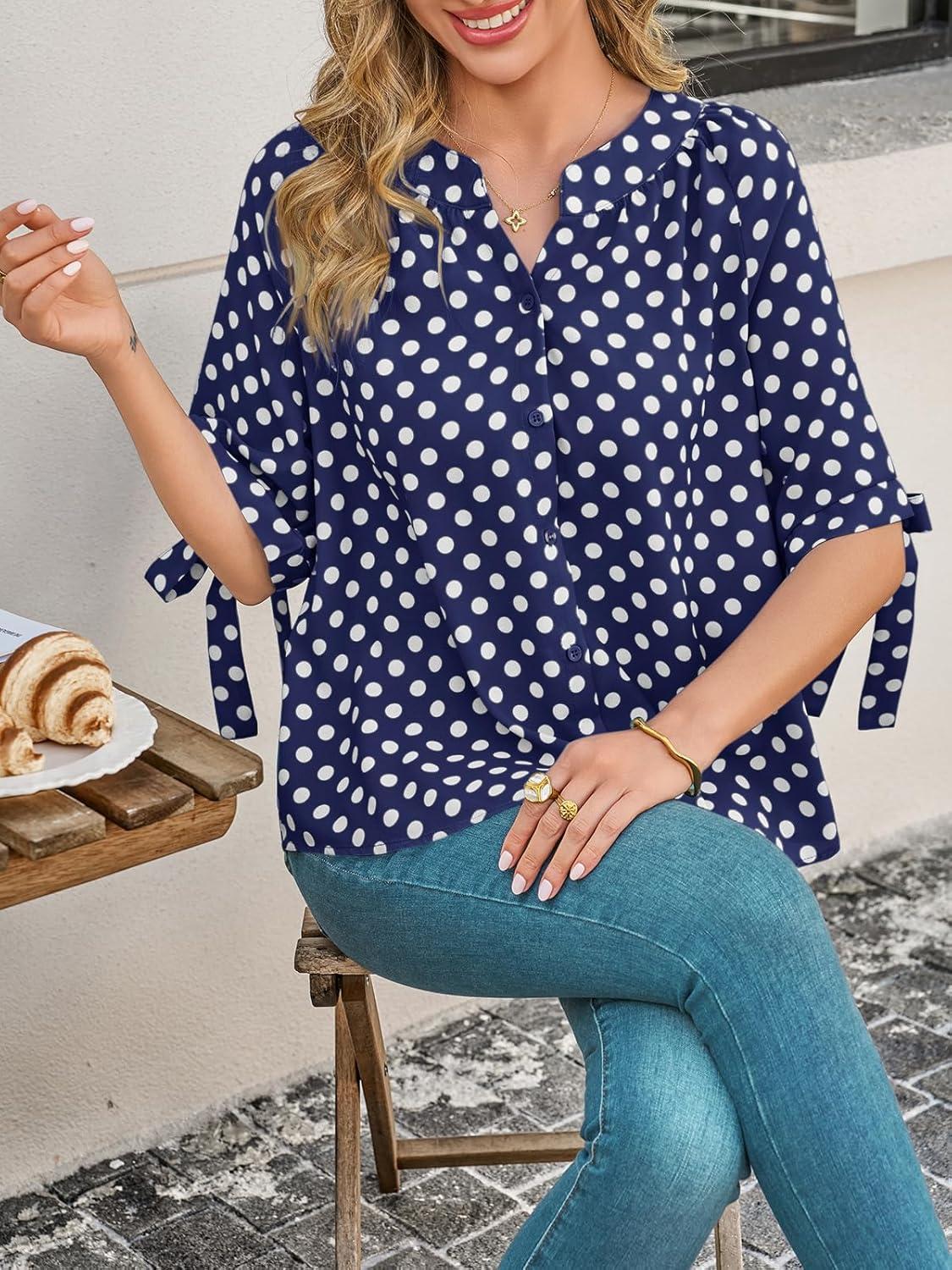 Cicy Bell Womens Polka Dot Blouse V Neck Bow Tie Cuff Half Sleeve Tunic Loose Fit Summer Casual Button Down Pleated Tops(Navy)