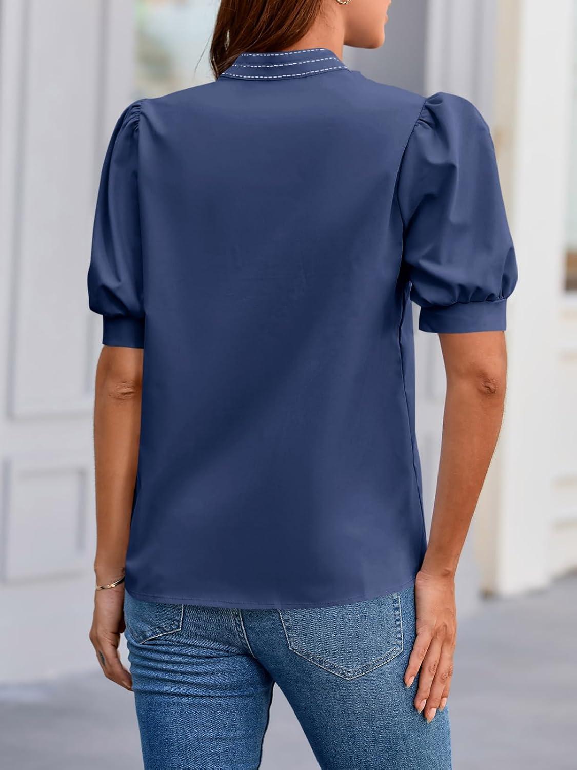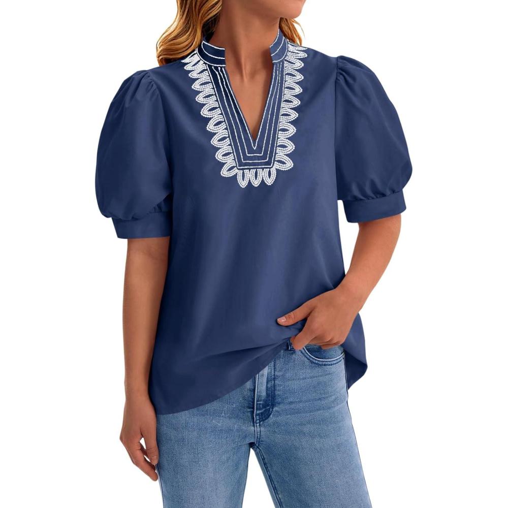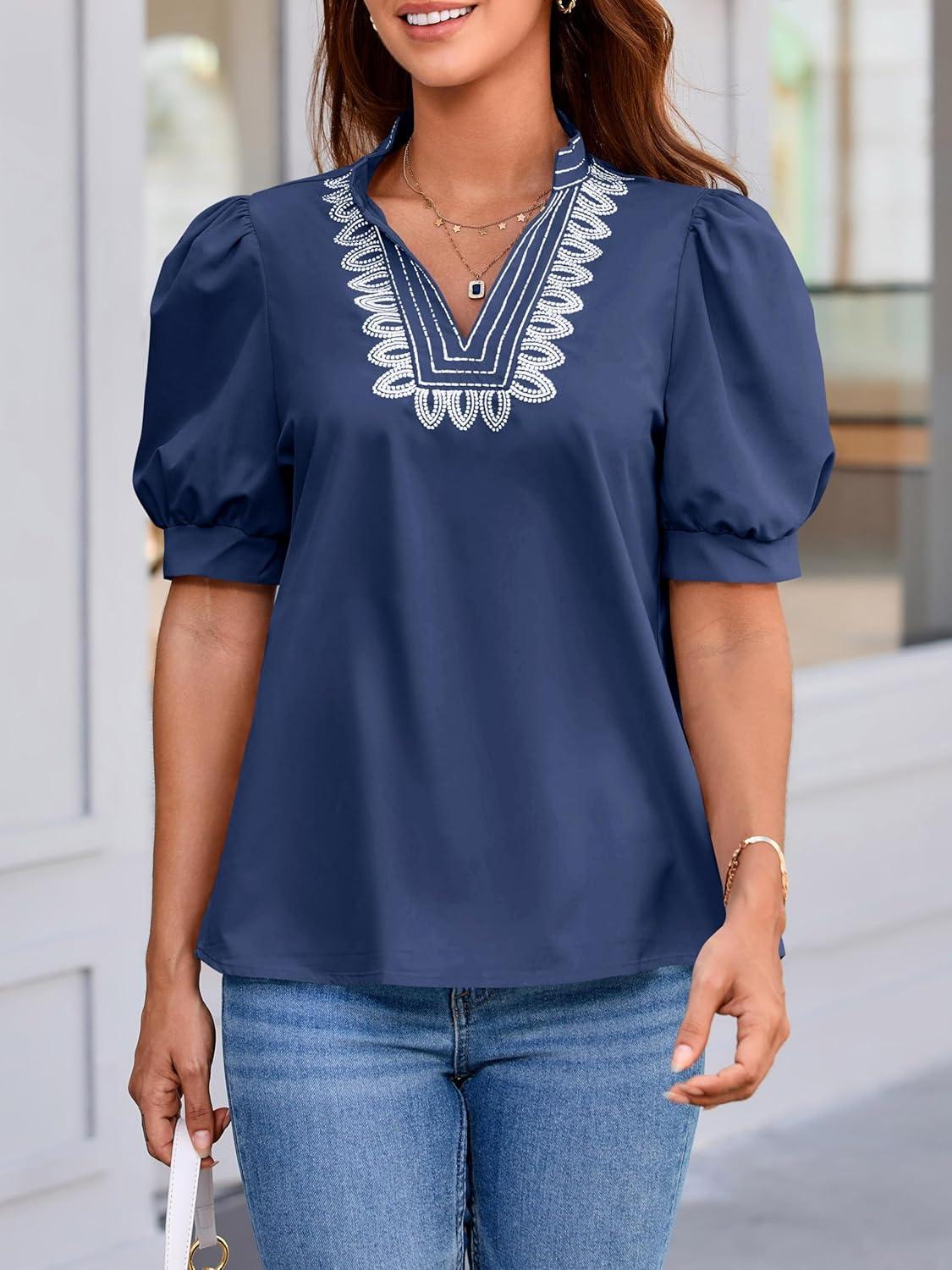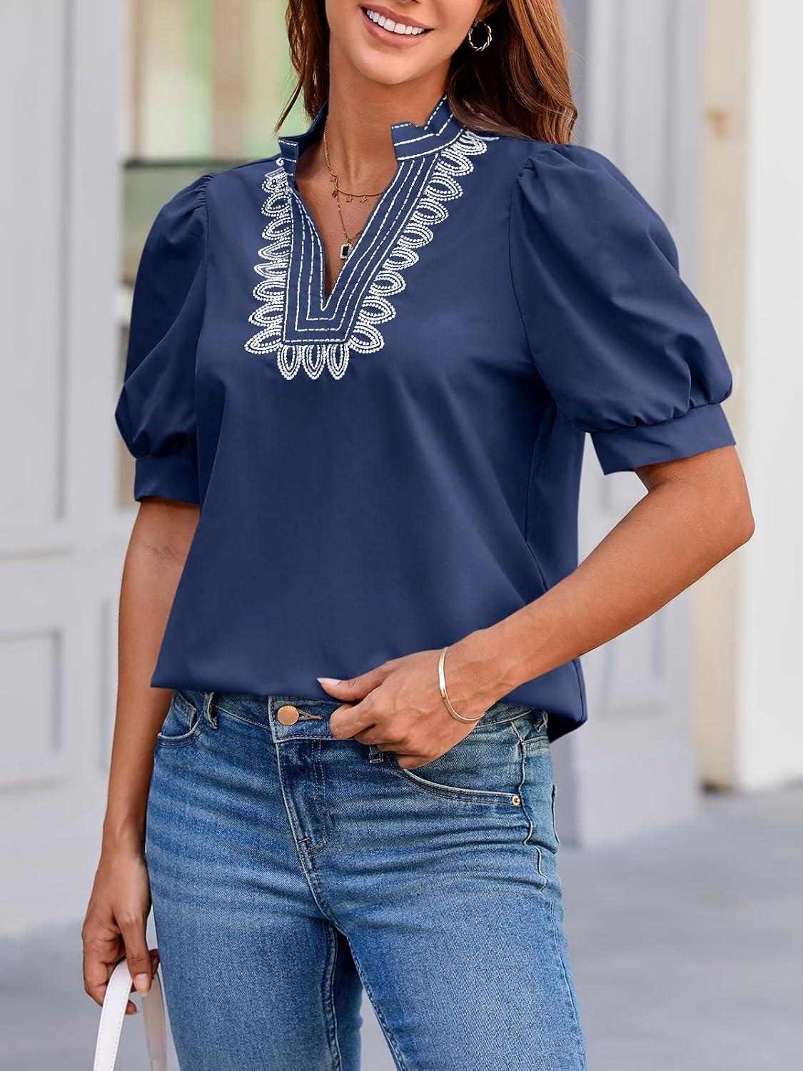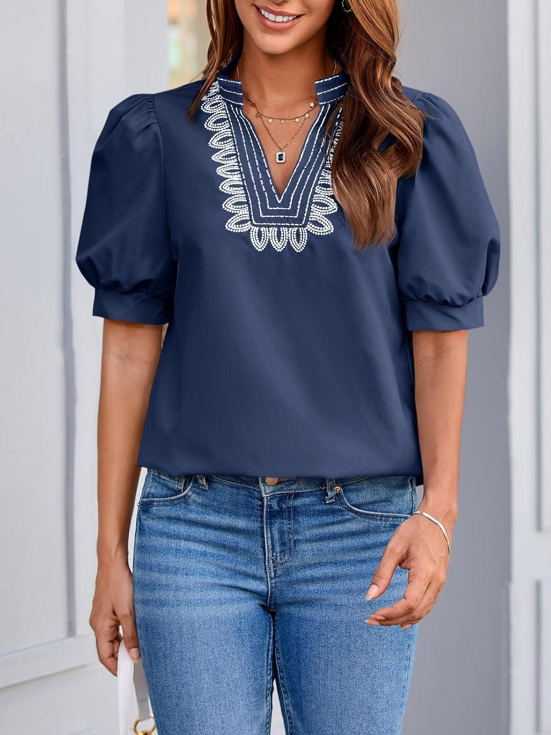 Cicy Bell Womens Puff Short Sleeve Blouses Summer Casual Dressy Embroidered V Neck Tops Loose Fit Tee Shirts(Navy)