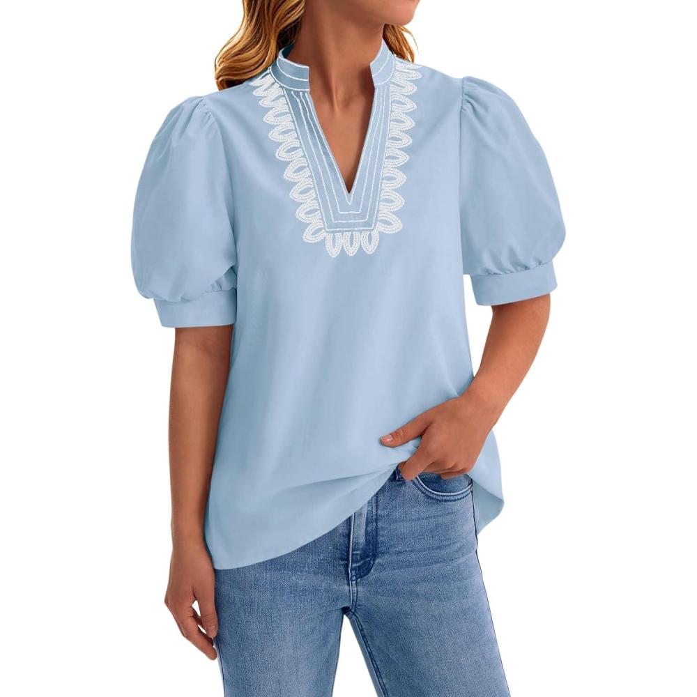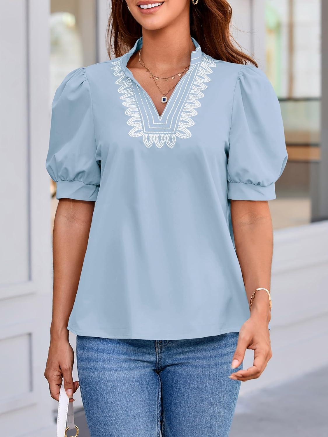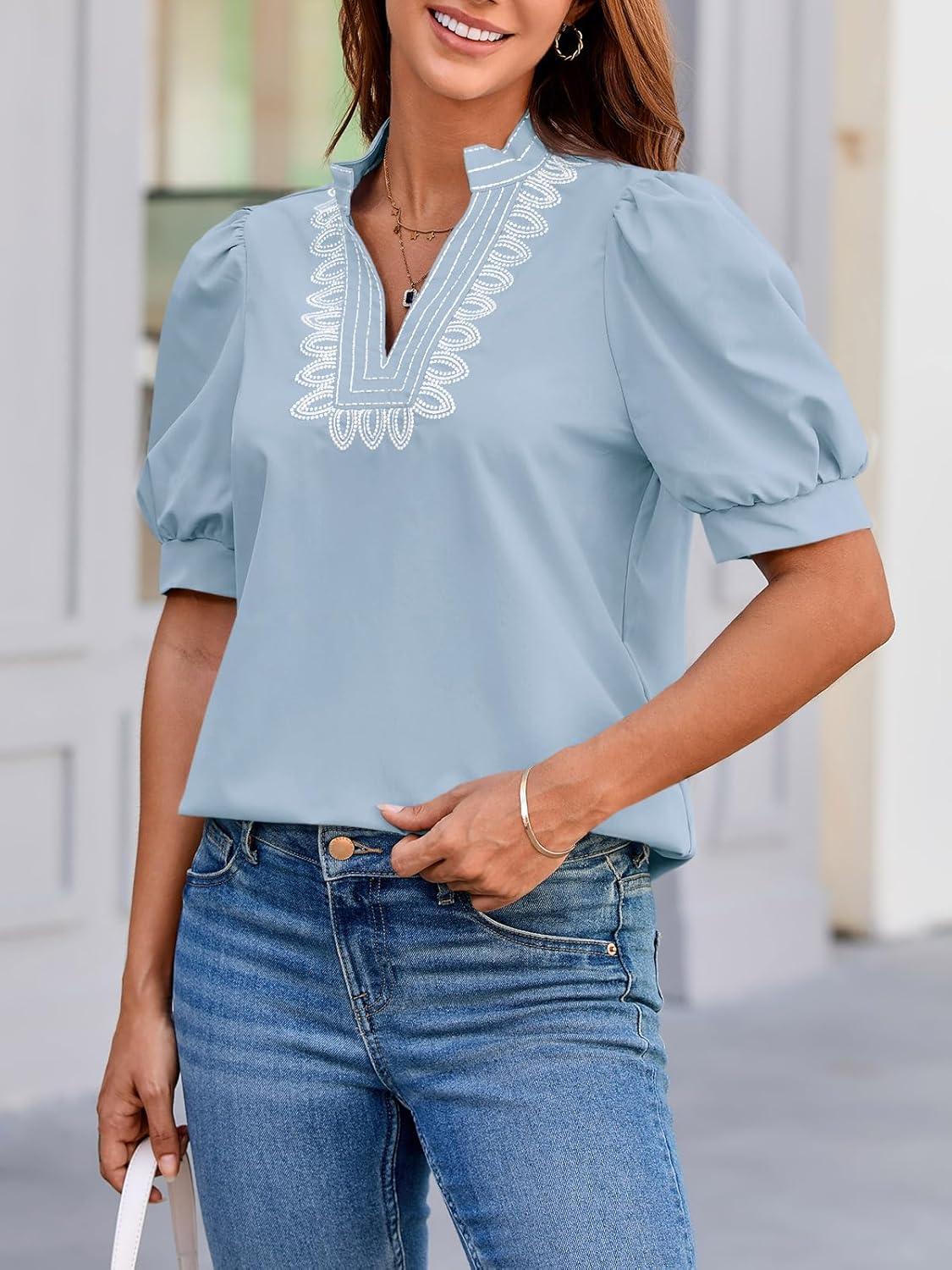 Cicy Bell Womens Puff Short Sleeve Blouses Summer Casual Dressy Embroidered V Neck Tops Loose Fit Tee Shirts(Sky Blue)