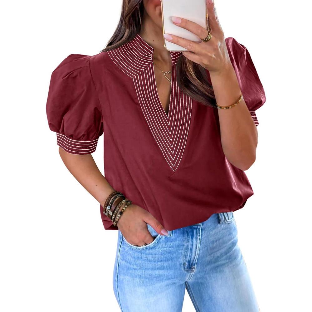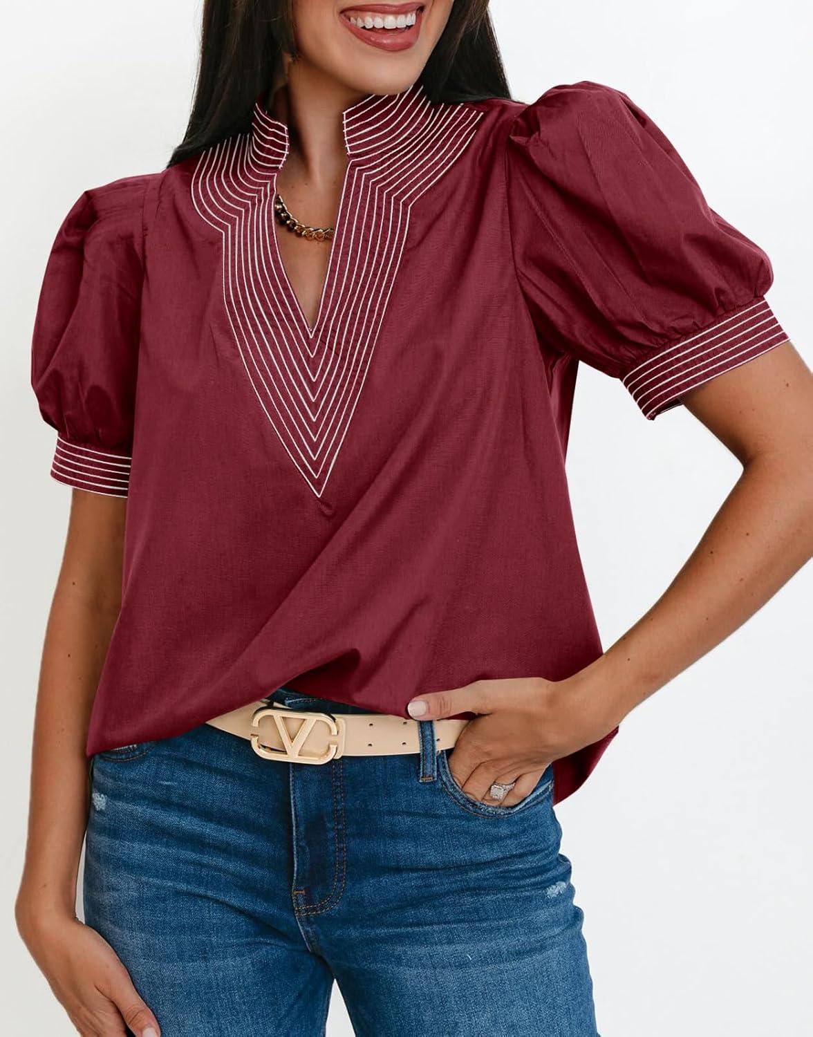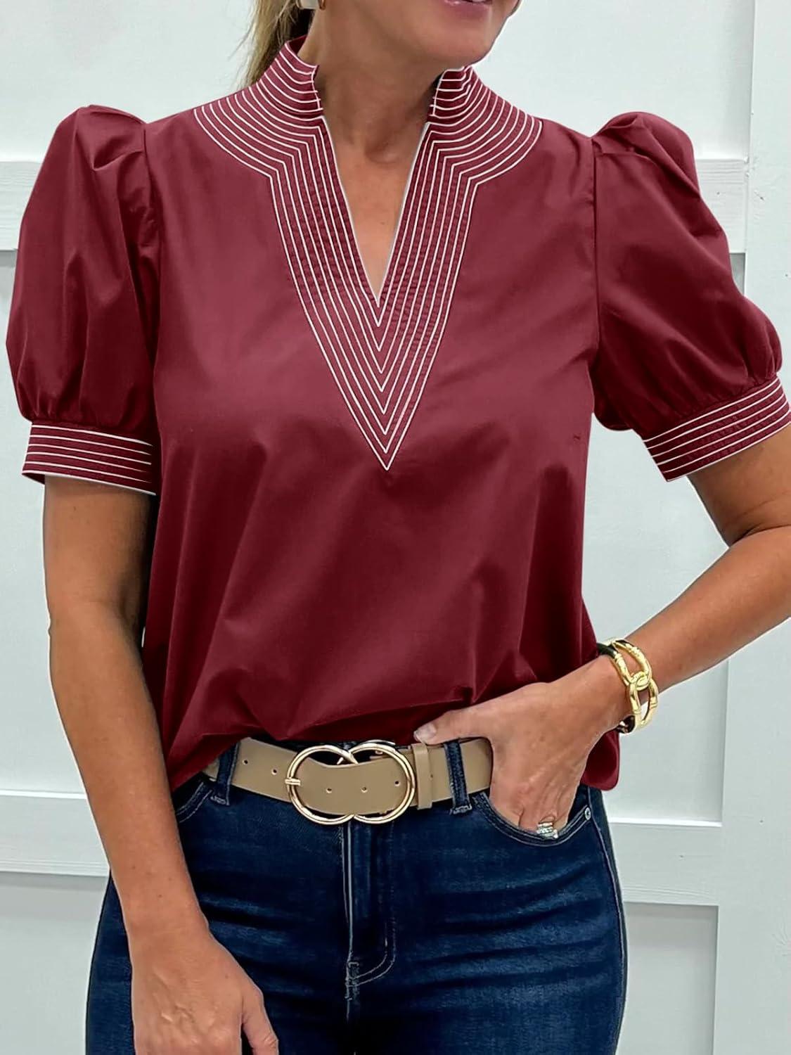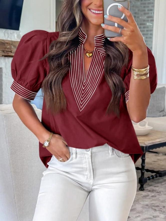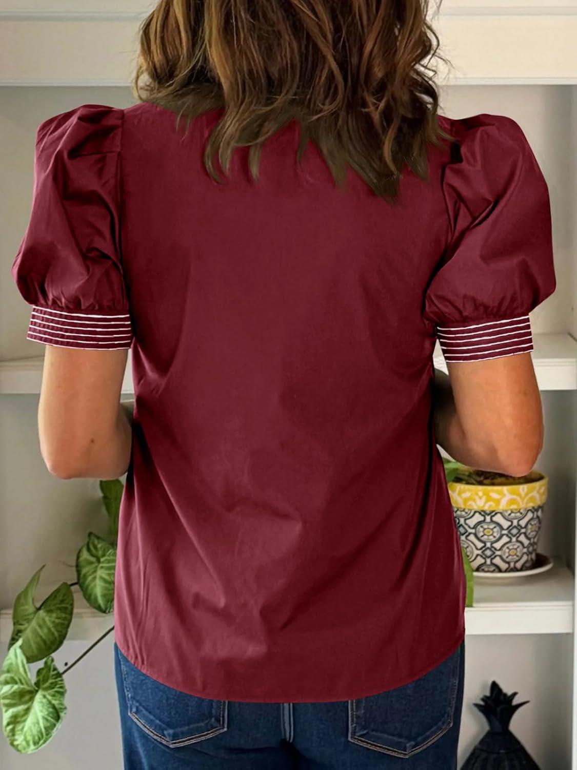 Cicy Bell Womens Puff Short Sleeve Blouses Summer Casual Dressy V Neck Contrast Stitch Tops Loose Fit Shirts(Burgundy)