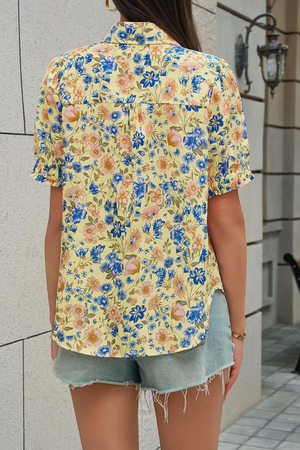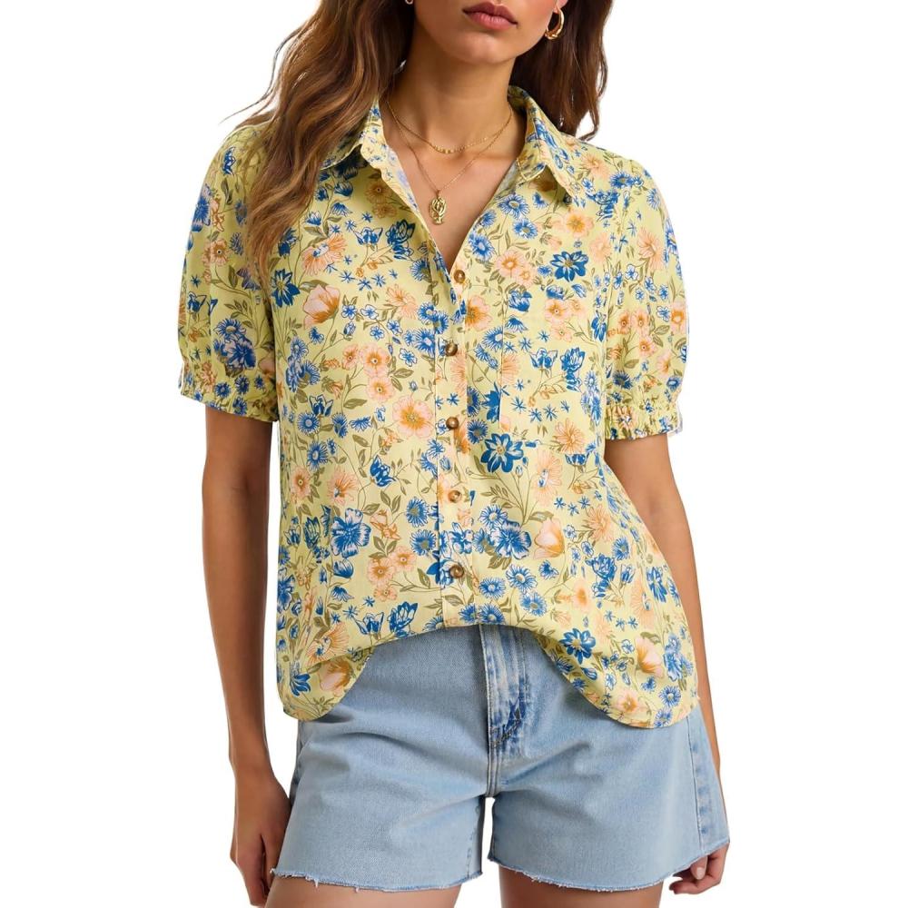 Cicy Bell Womens Puff Short Sleeve Button Down Shirts Summer Casual Collared V Neck Blouse Linen Loose Fit Work Tops(Blue Yellow)