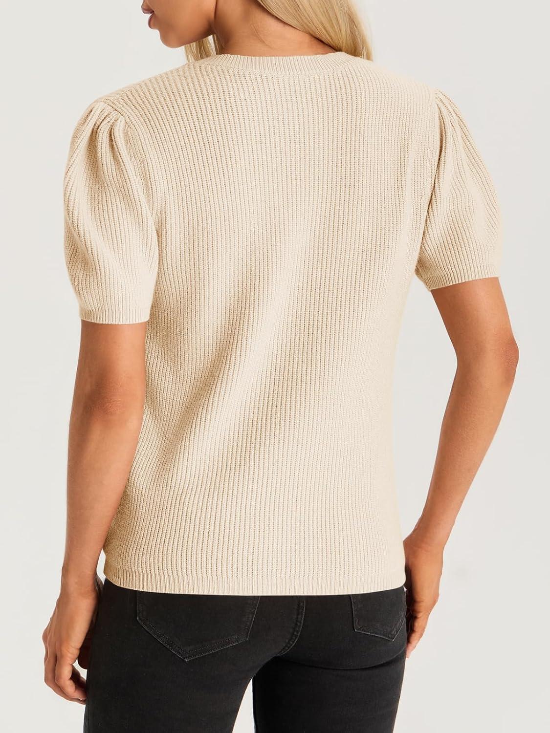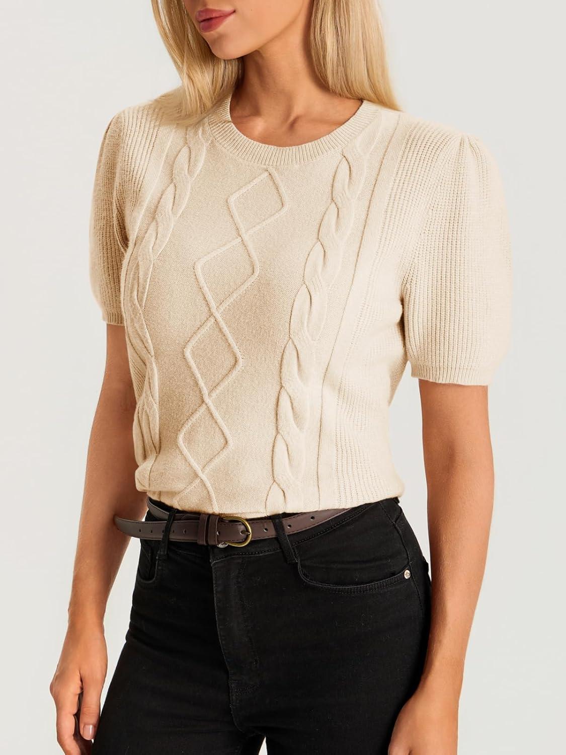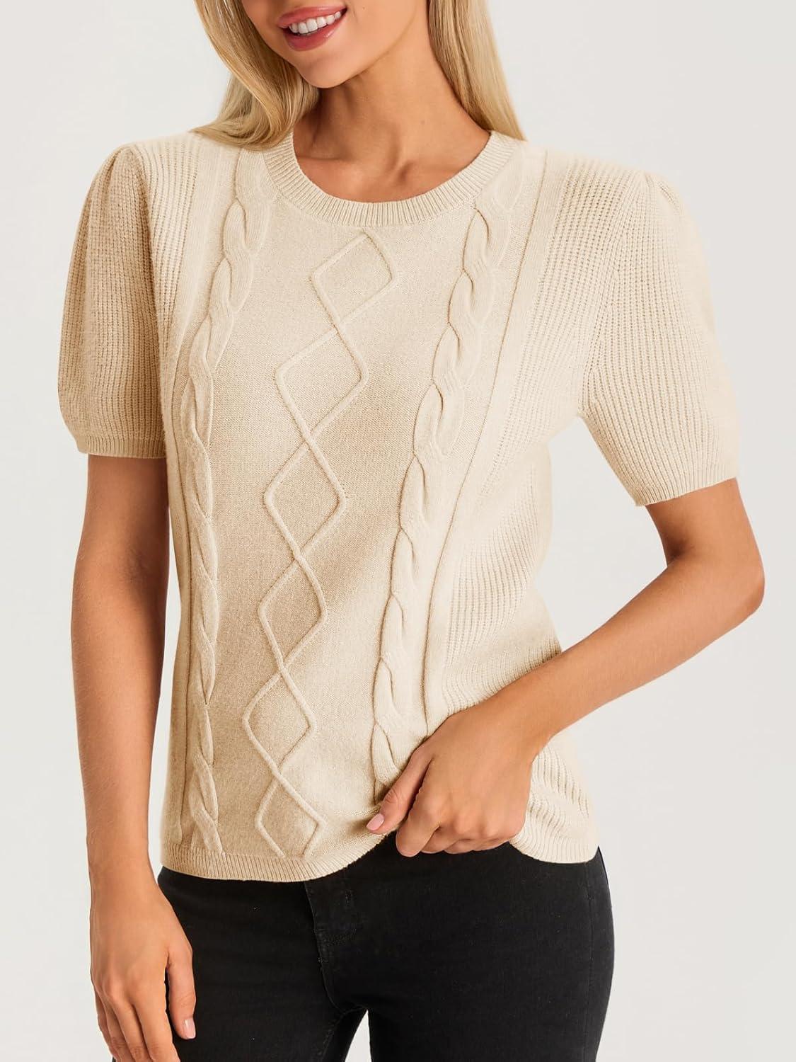 Cicy Bell Womens Puff Short Sleeve Sweater Tops Cable Knit Crew Neck 2026 Spring Shirts Lightweight Dressy Casual Sweaters(Khaki)