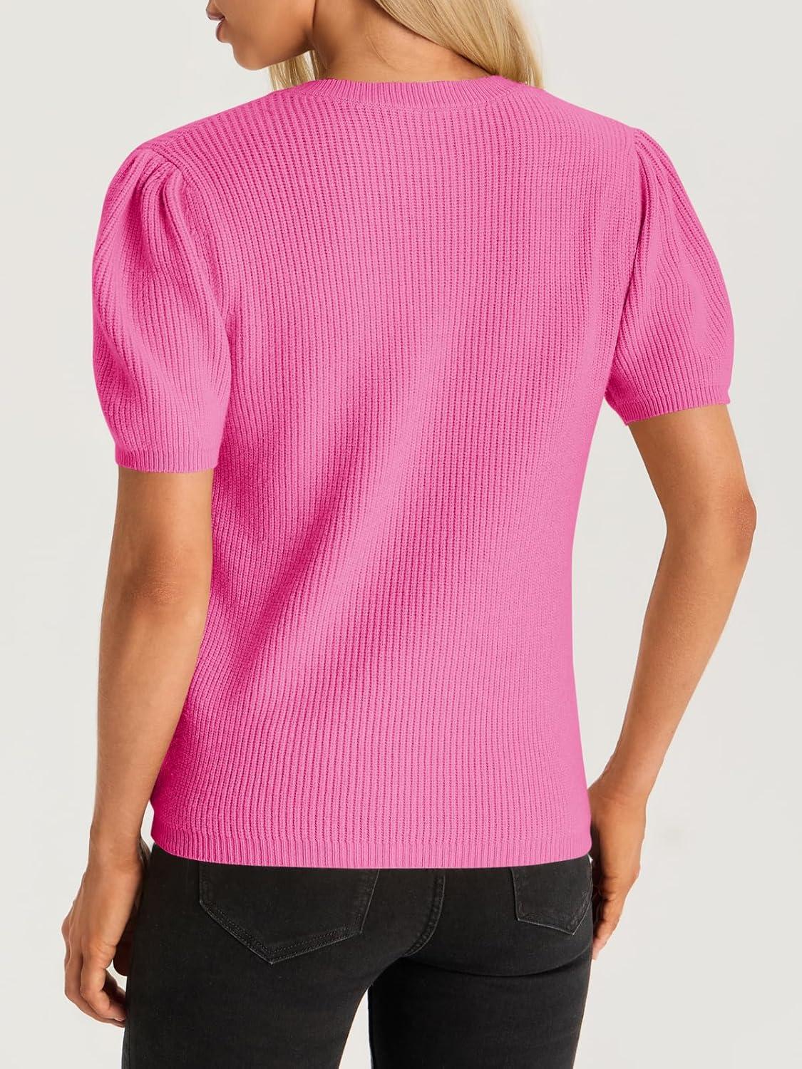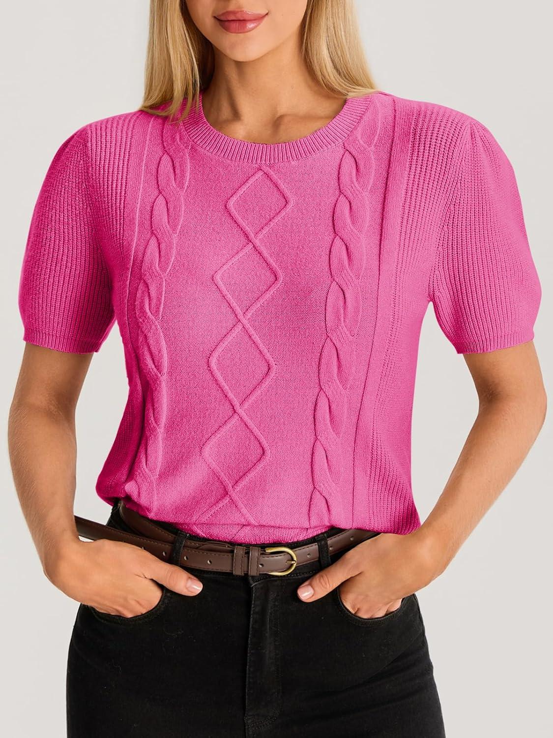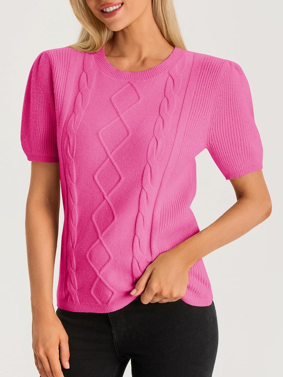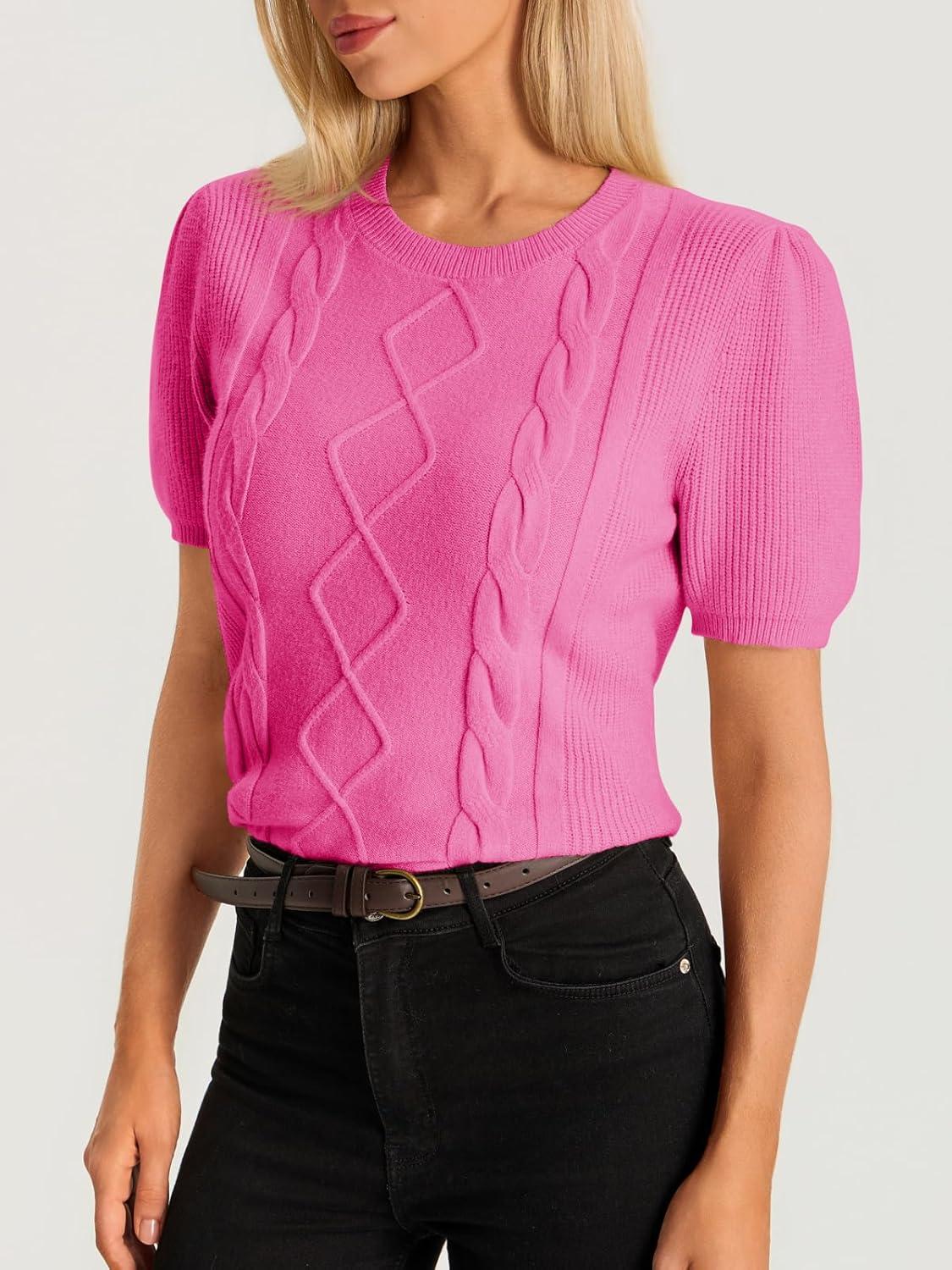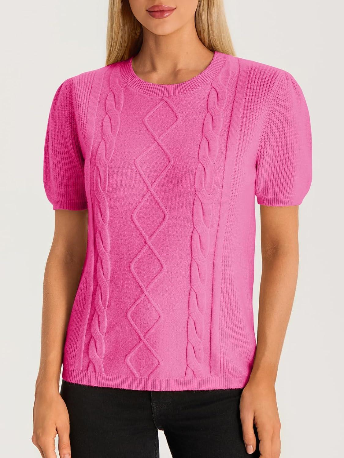 Cicy Bell Womens Puff Short Sleeve Sweater Tops Cable Knit Crew Neck 2026 Spring Shirts Lightweight Dressy Casual Sweaters(Rose Red)