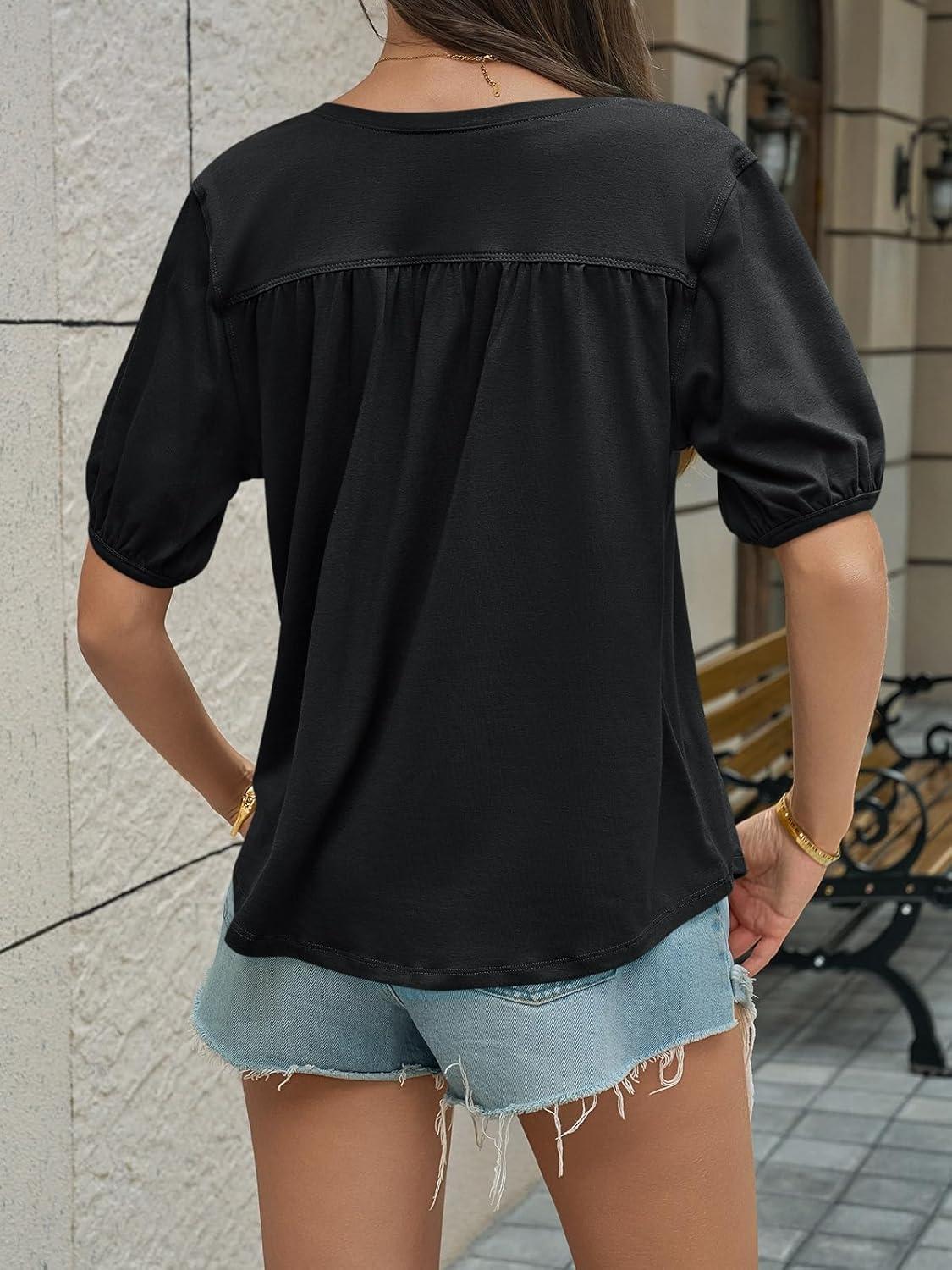 Cicy Bell Womens Puff Short Sleeve T-Shirts V Neck Summer Casual Pleated Tops Loose Fit Curved Hem Tees(Black)