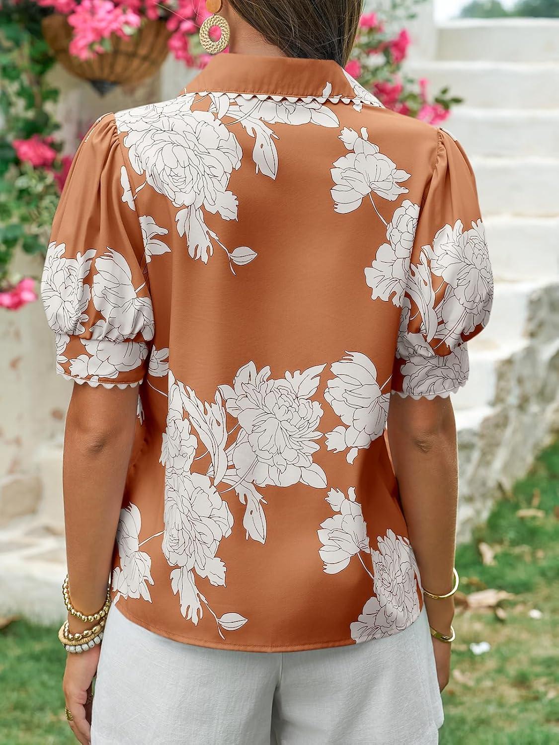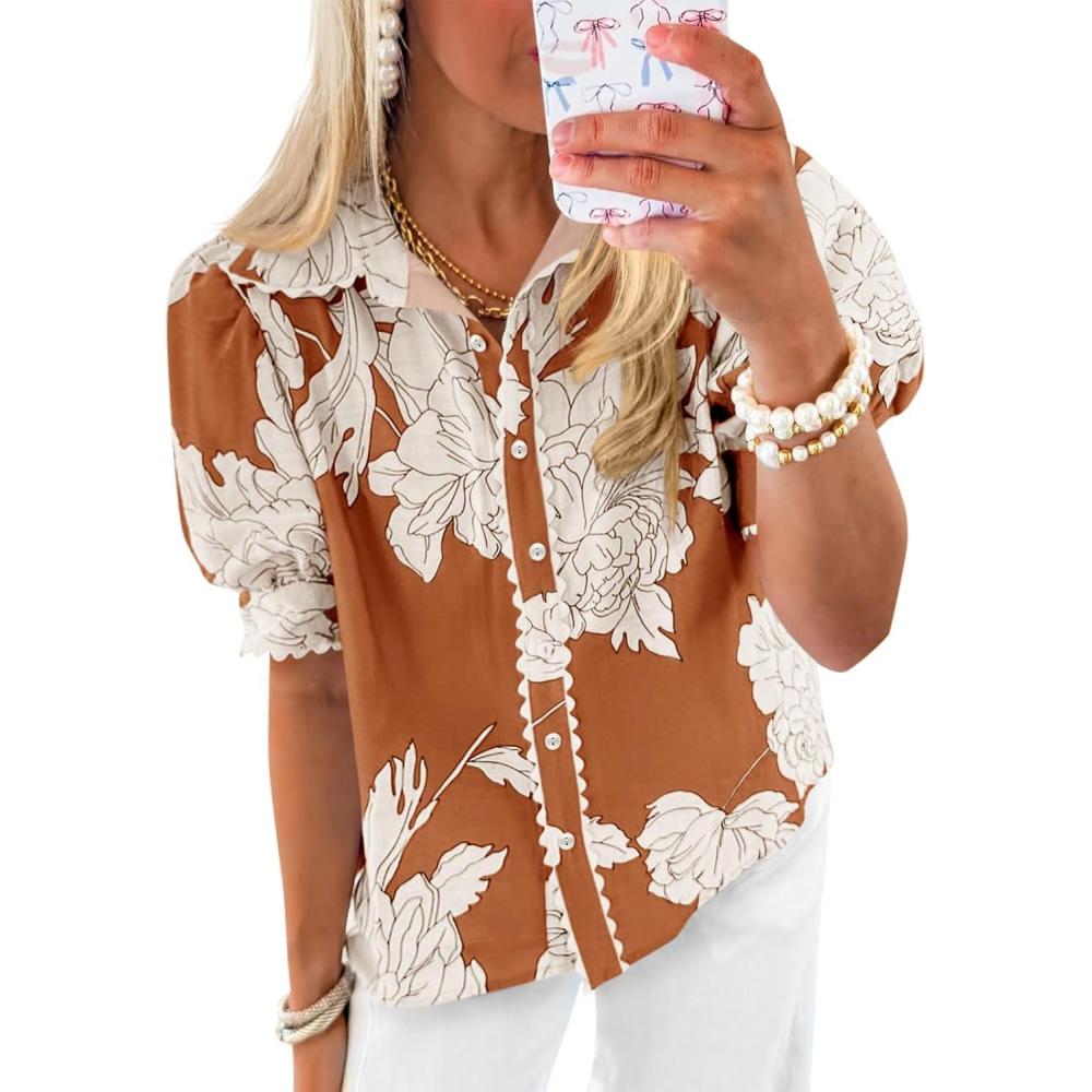 Cicy Bell Womens Puff Sleeve Button Down Shirts Floral Print Summer Casual Tops Boho Loose Fit Collared Blouse(Brown)