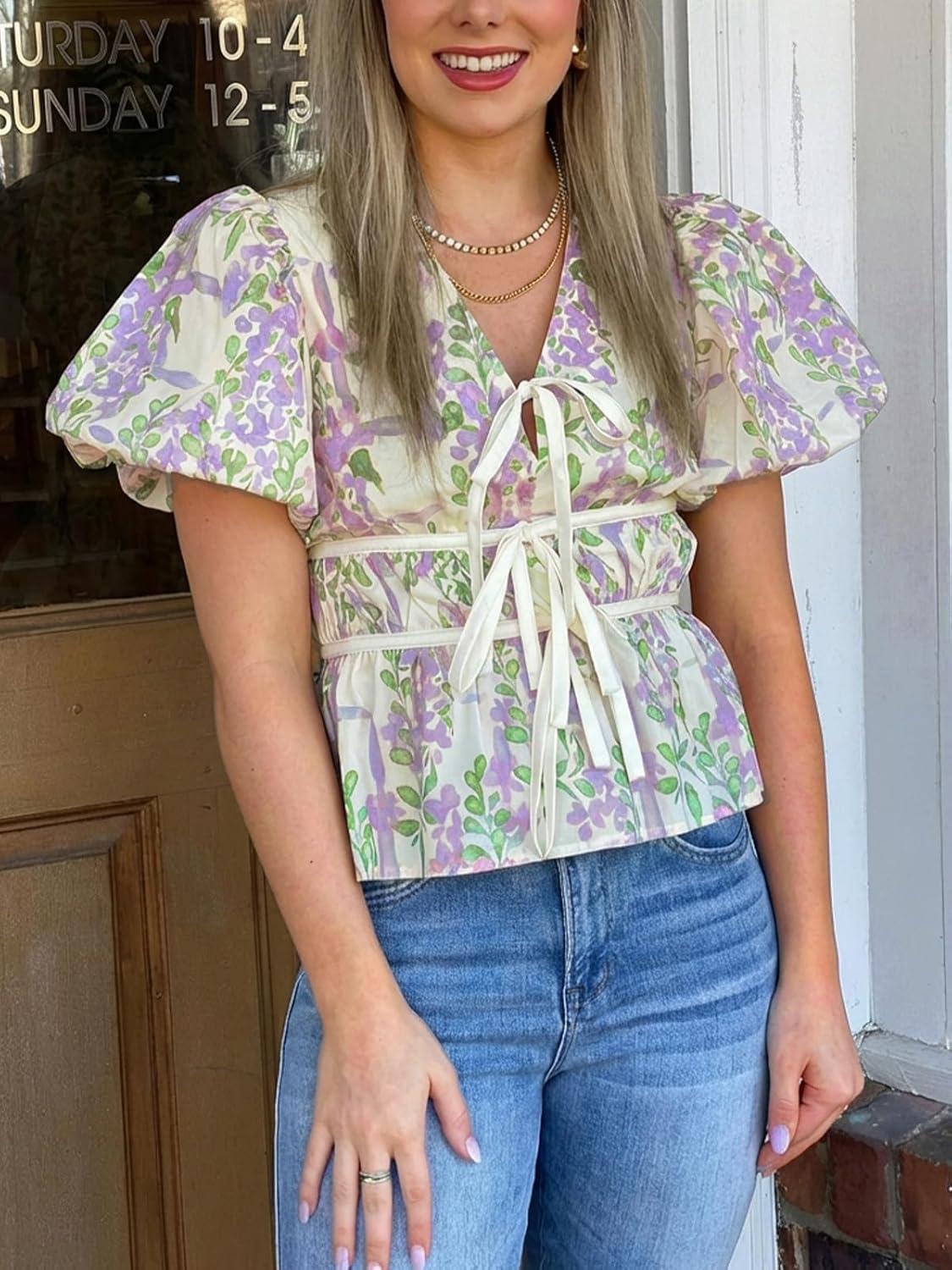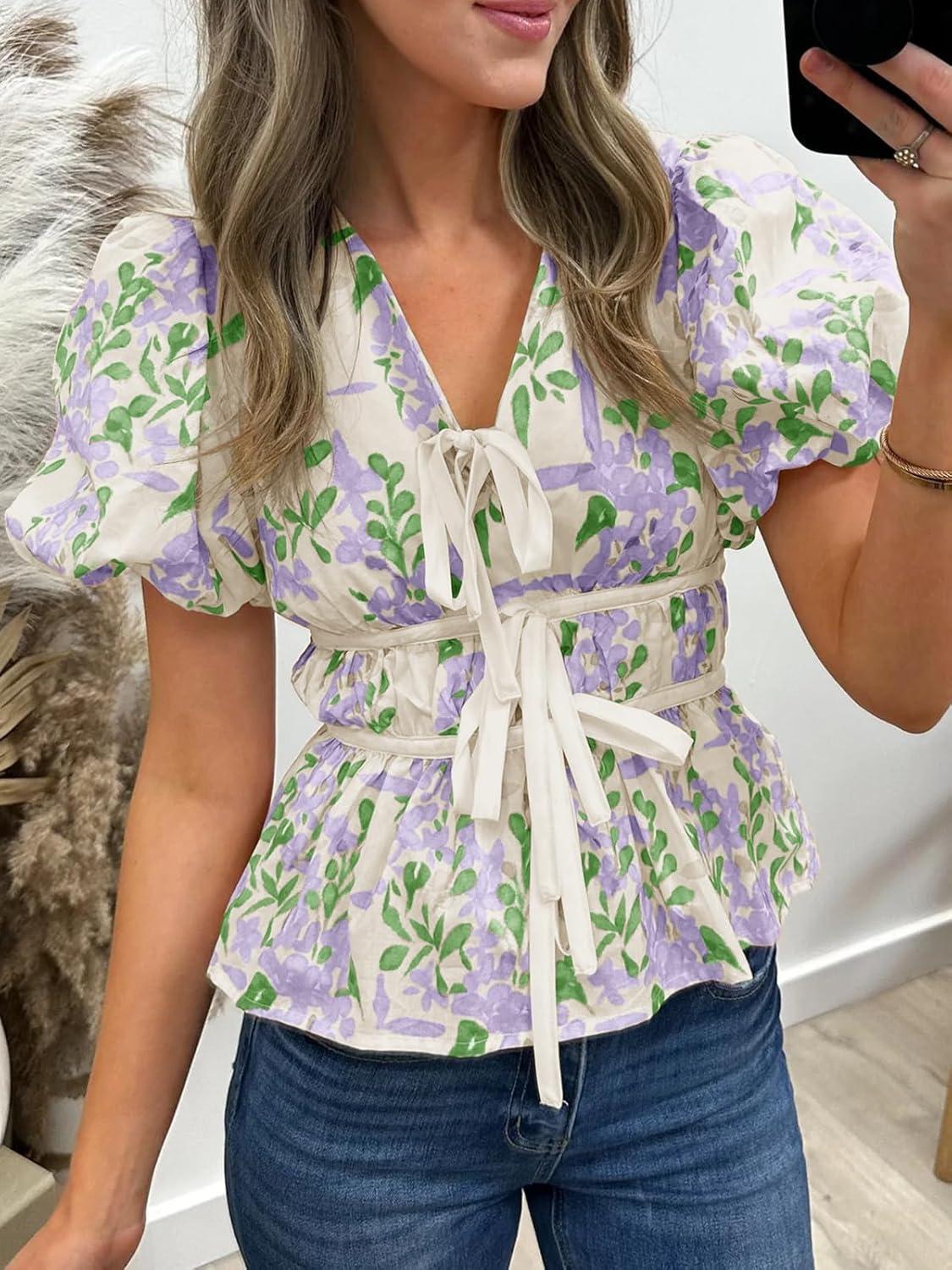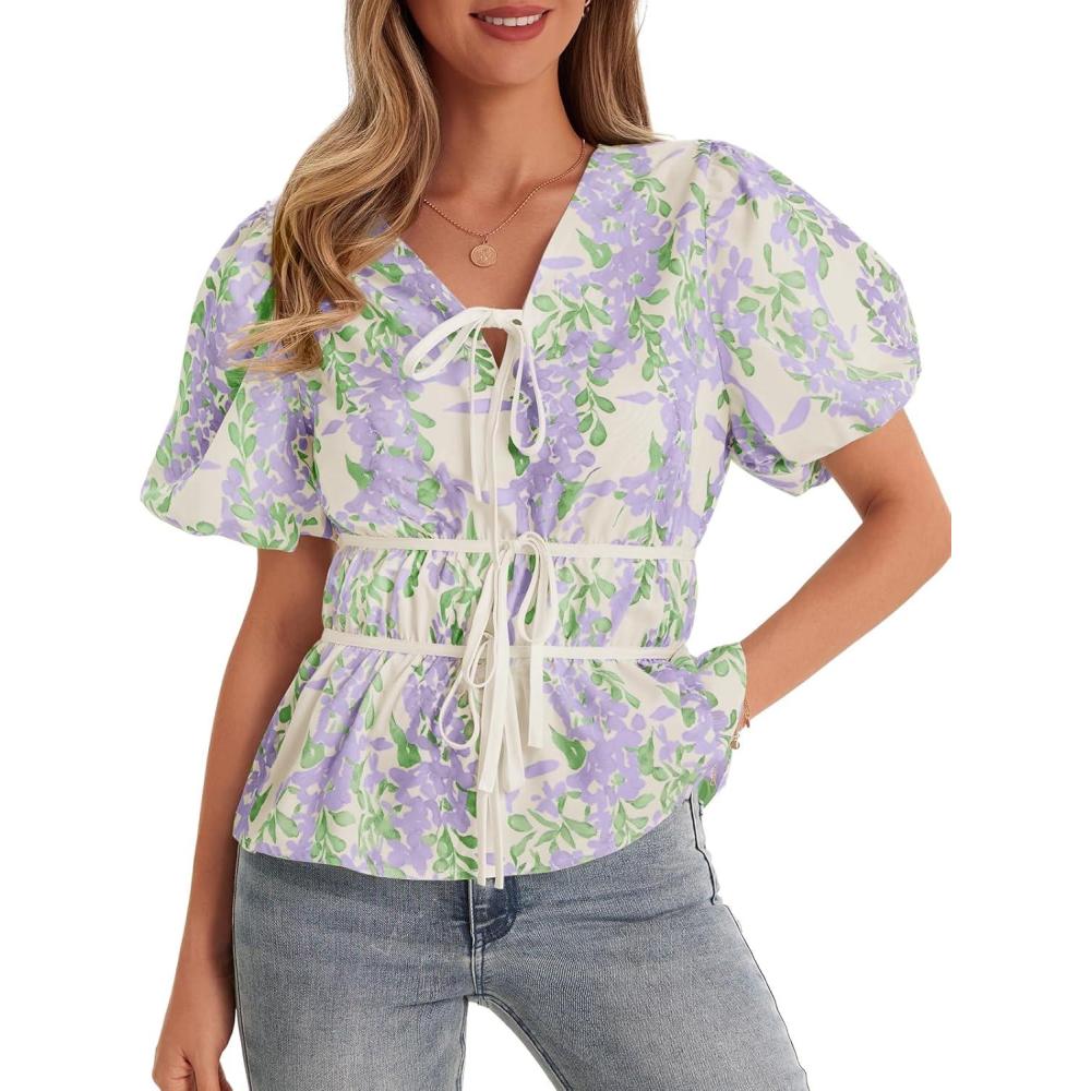 Cicy Bell Womens Puff Sleeve Tie Front Tops Summer Babydoll Peplum V Neck Blouse Casual Dressy Pleated Floral Print Shirts(Light Purple)