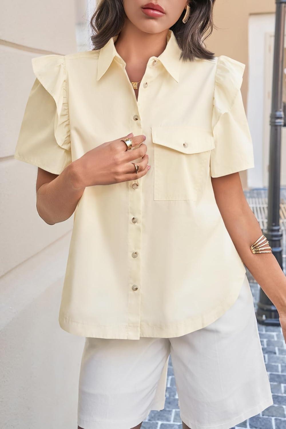 Cicy Bell Womens Ruffle Button Down Shirts Dressy Casual Short Puff Sleeve Cotton Tops Summer Loose Fit V Neck Blouses(Beige)