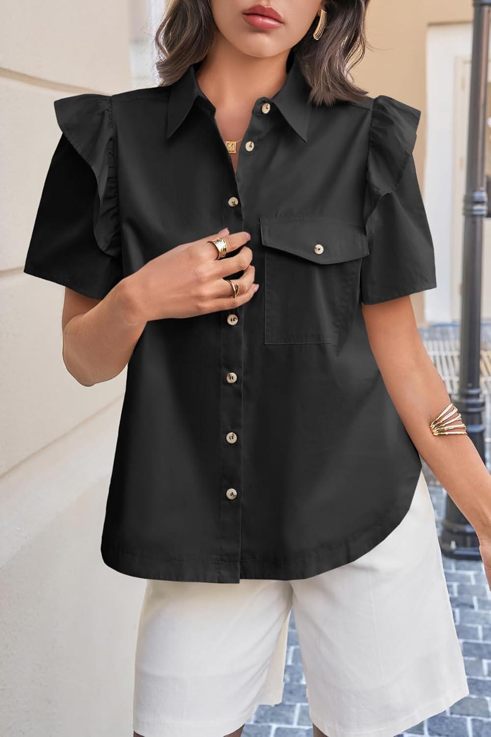 Cicy Bell Womens Ruffle Button Down Shirts Dressy Casual Short Puff Sleeve Cotton Tops Summer Loose Fit V Neck Blouses(Black)