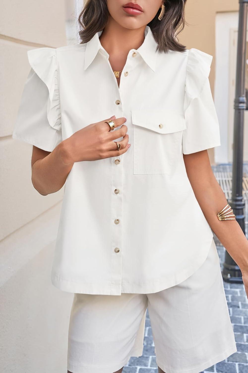 Cicy Bell Womens Ruffle Button Down Shirts Dressy Casual Short Puff Sleeve Cotton Tops Summer Loose Fit V Neck Blouses(White)