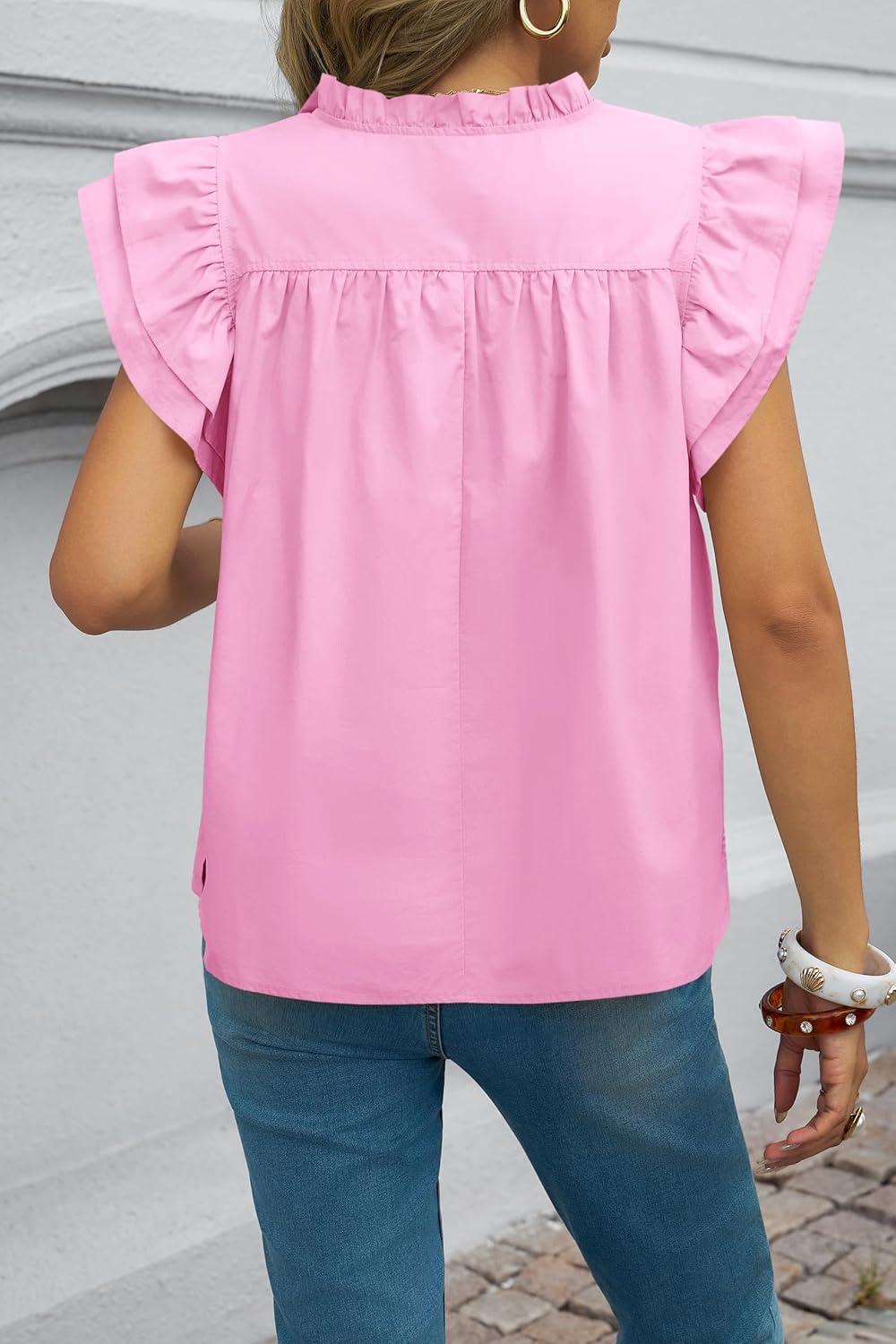 Cicy Bell Womens Ruffle Cap Sleeve Blouses V Neck Dressy Casual Tops Summer Sleeveless Cotton Shirts(Pink)