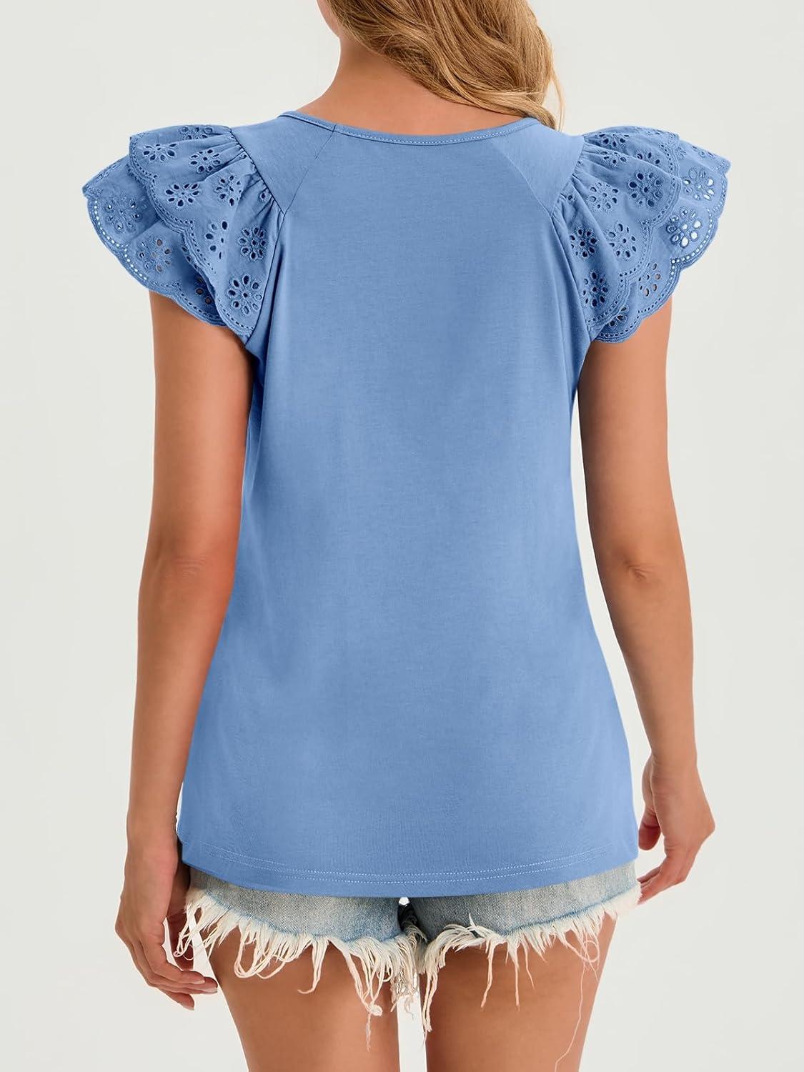 Cicy Bell Womens Ruffle Cap Sleeve T-Shirts Dressy Casual Summer Lace Tank Tops Crewneck Cute Basic Tee(Blue)