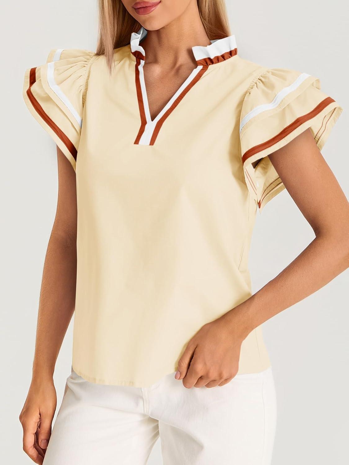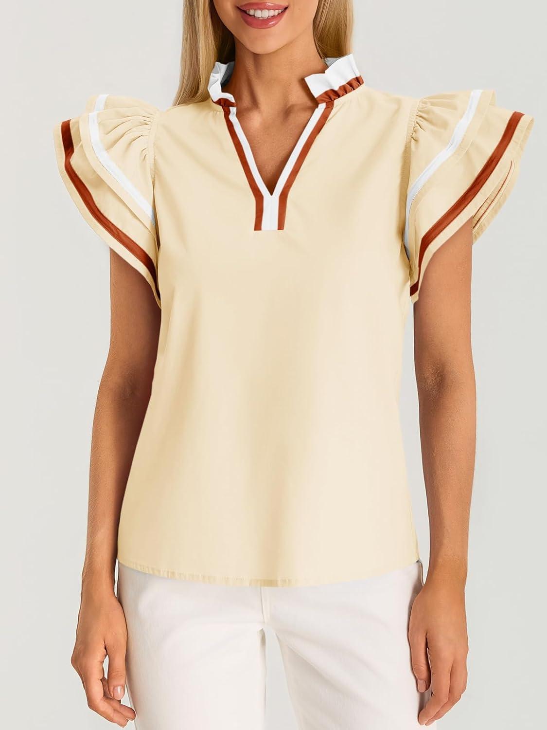 imageCicy Bell Womens Ruffle Color Block Tank Tops V Neck Dressy Casual Blouses Loose Fit Pleated Cotton ShirtsBeige