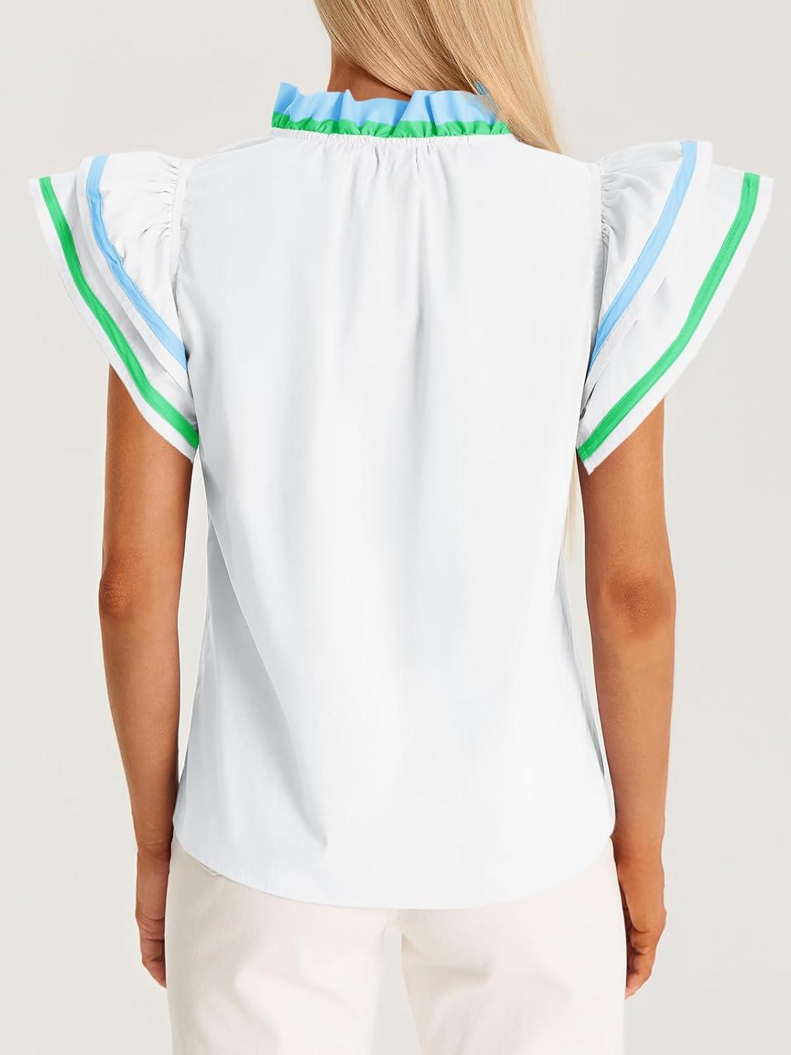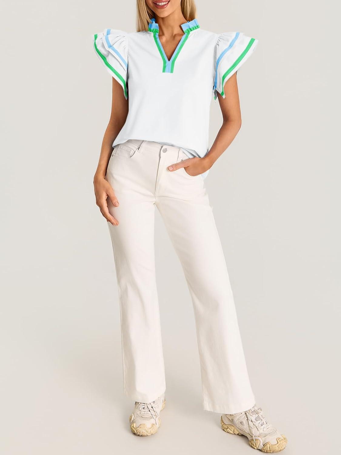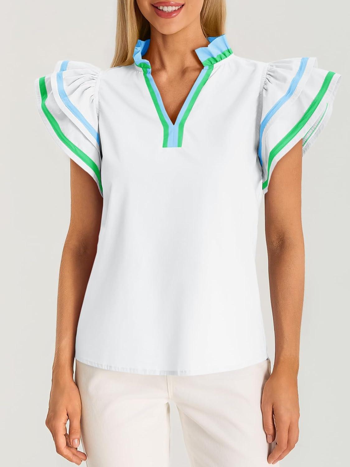 imageCicy Bell Womens Ruffle Color Block Tank Tops V Neck Dressy Casual Blouses Loose Fit Pleated Cotton ShirtsWhite