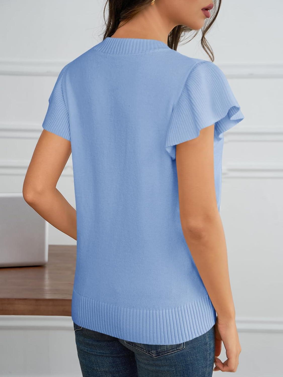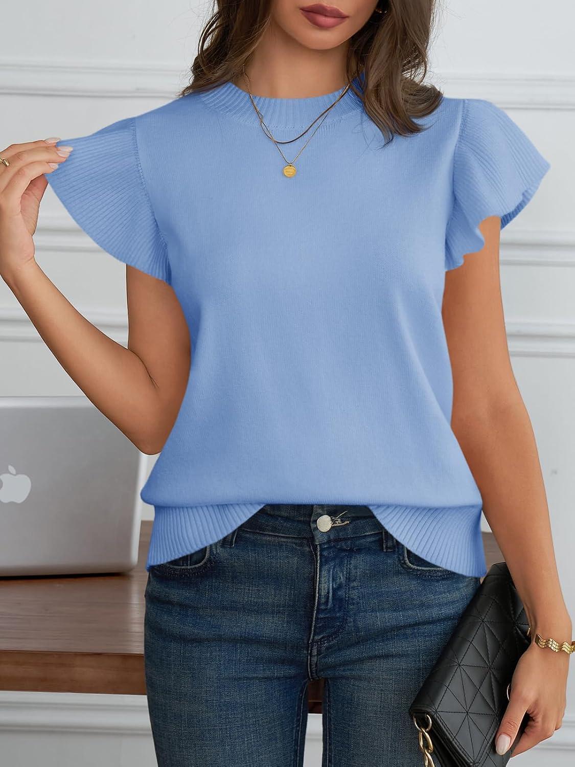 Cicy Bell Womens Ruffle Sleeve Cropped Sweaters Tops Ribbed Knit Lightweight Crewneck Pullover Casual Trendy T Shirts Blouses(Sky Blue)