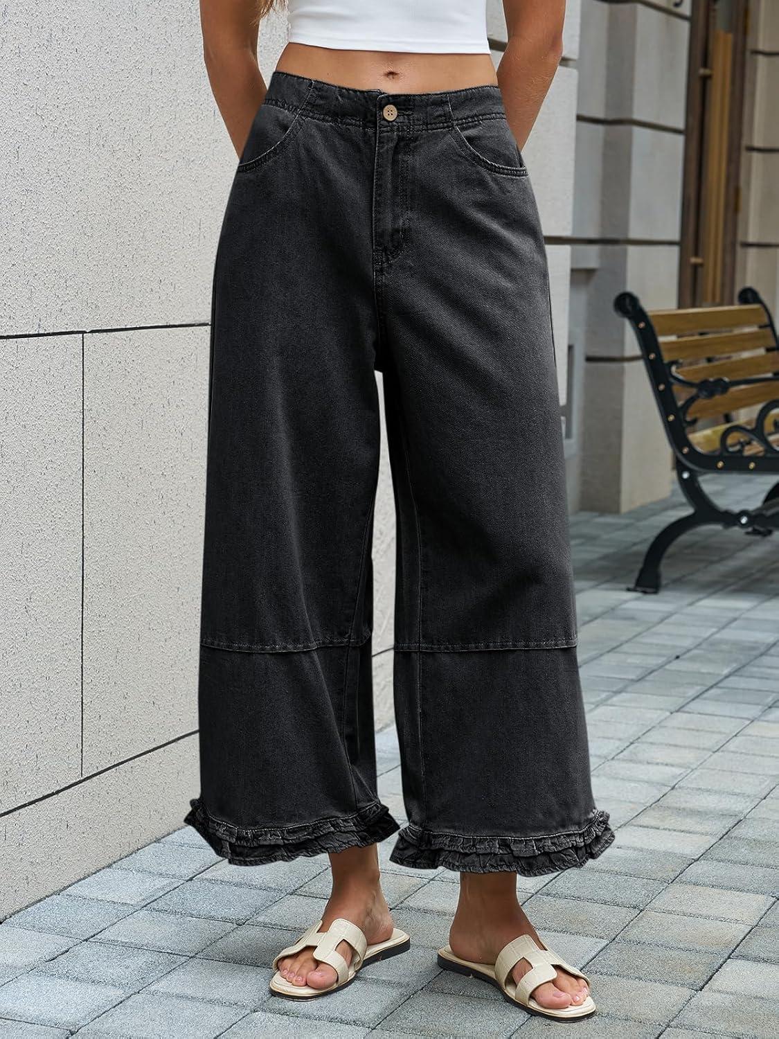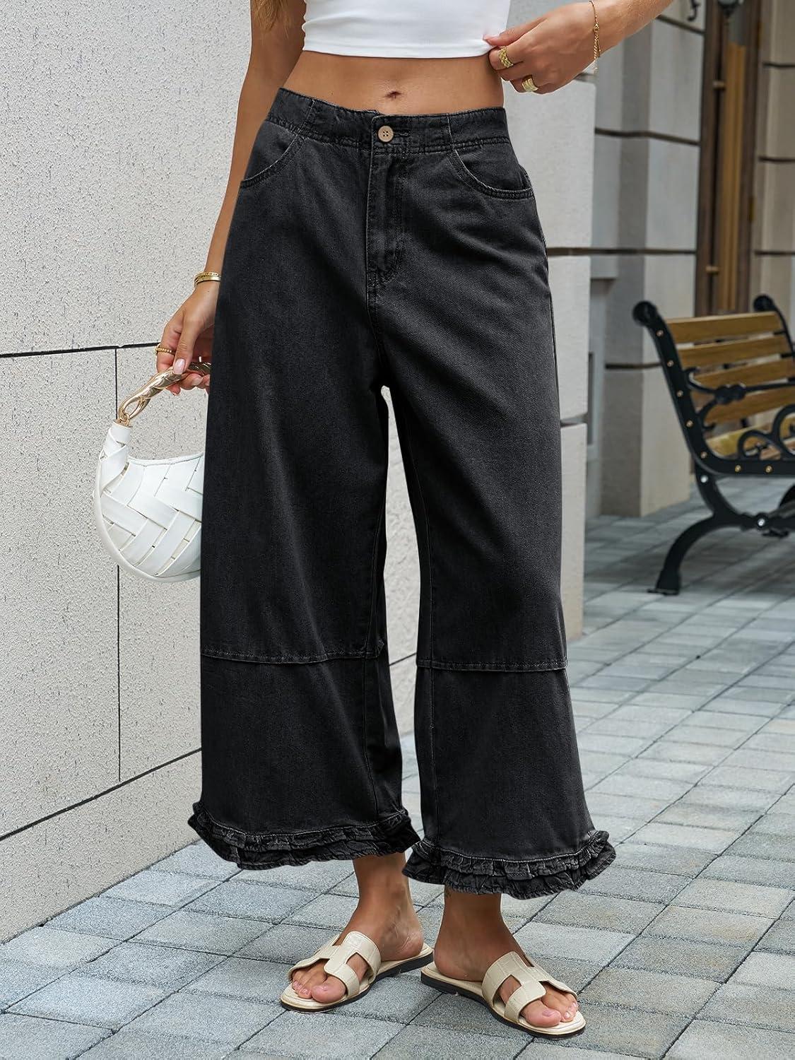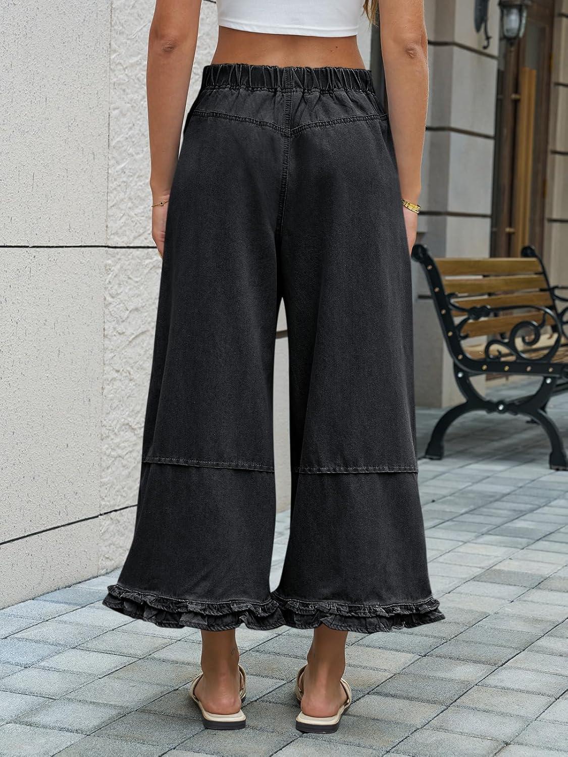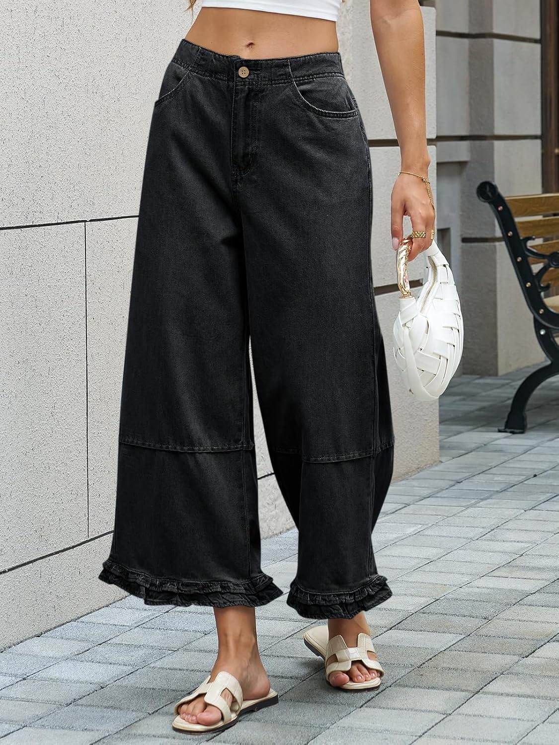 Cicy Bell Womens Ruffle Wide Leg Jeans Cropped Elastic High Waisted Baggy Denim Pants with Pockets(Black)