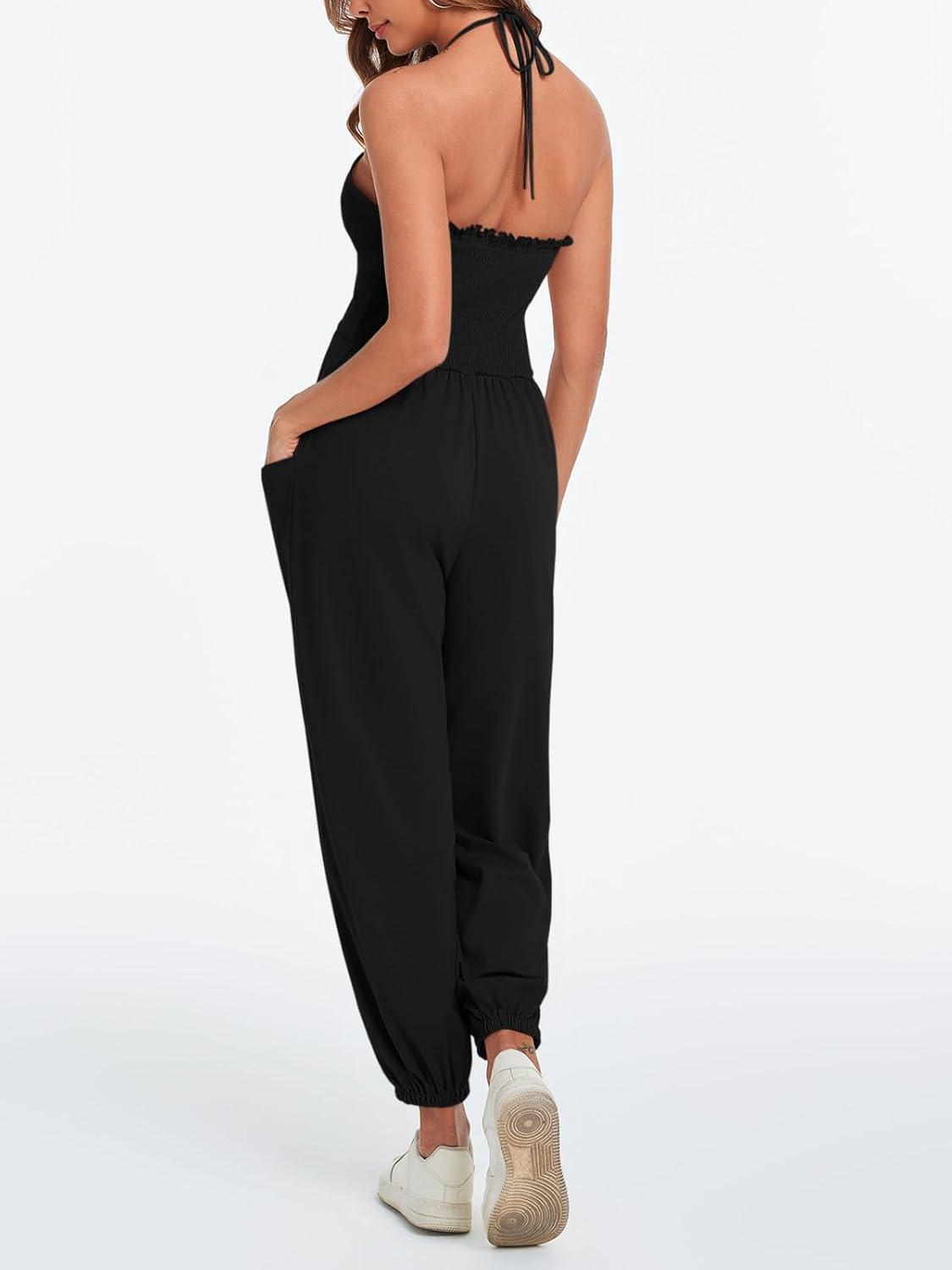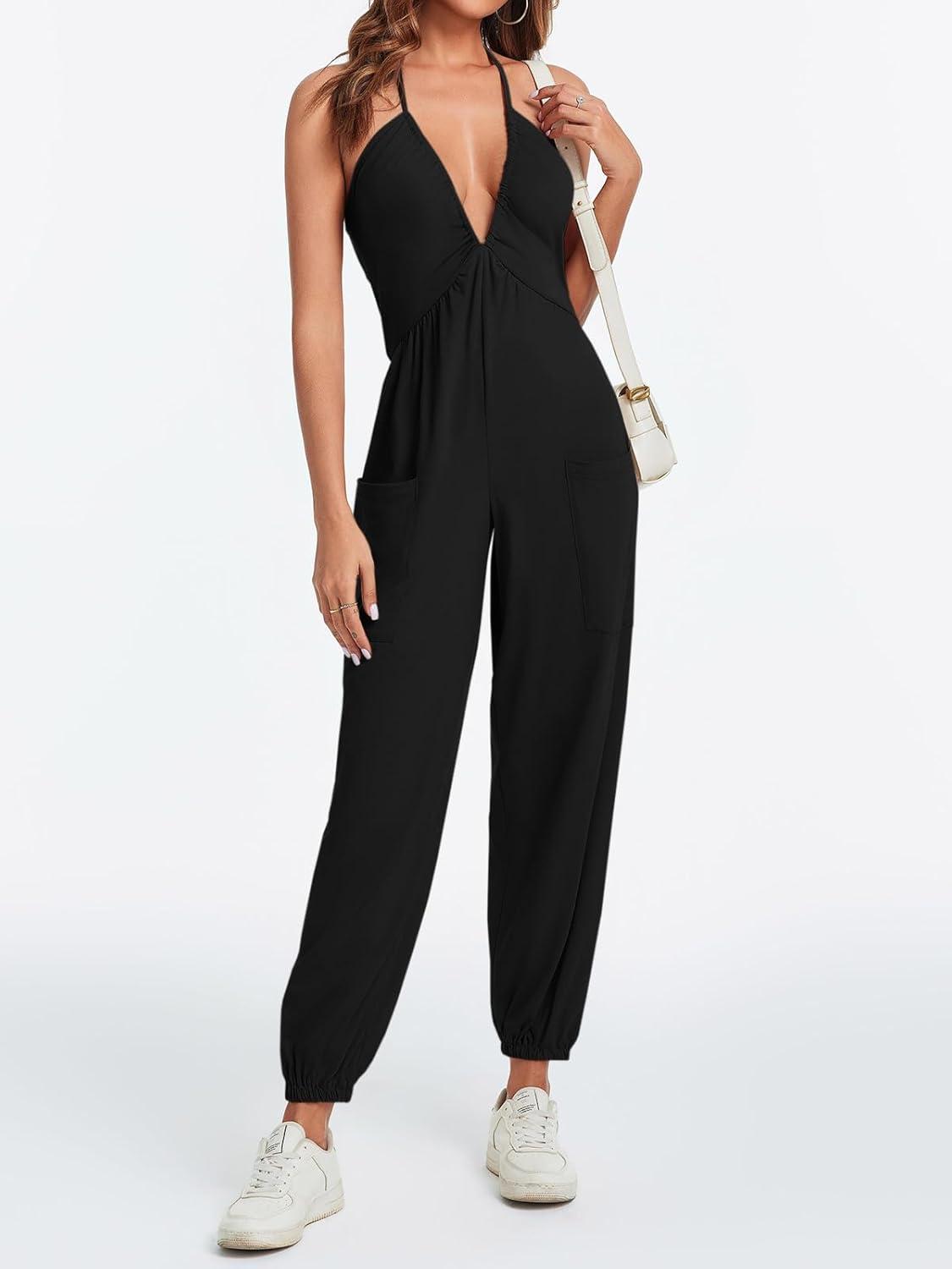 Cicy Bell Women's Sexy Halter Jumpsuits Casual Deep V Nevk Beach Jogger Long Pants Rompers(Black)