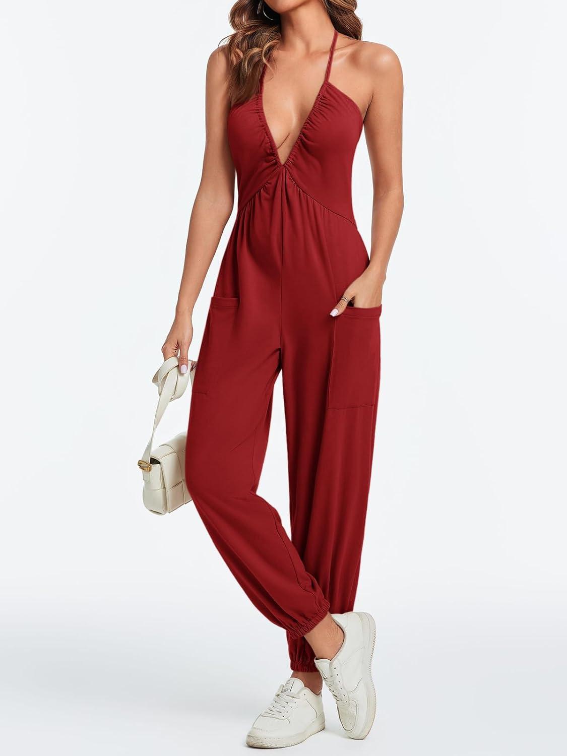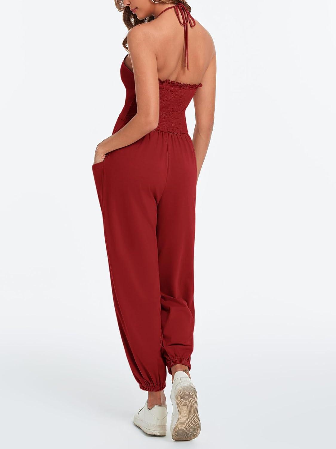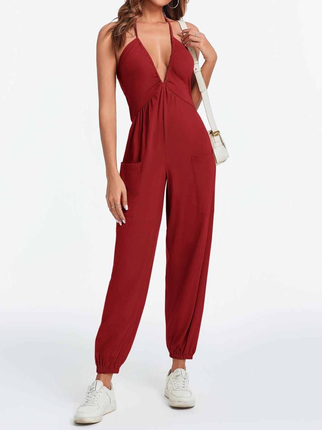 Cicy Bell Women’s Sexy Halter Jumpsuits Casual Deep V Nevk Beach Jogger Long Pants Rompers(Burgundy)
