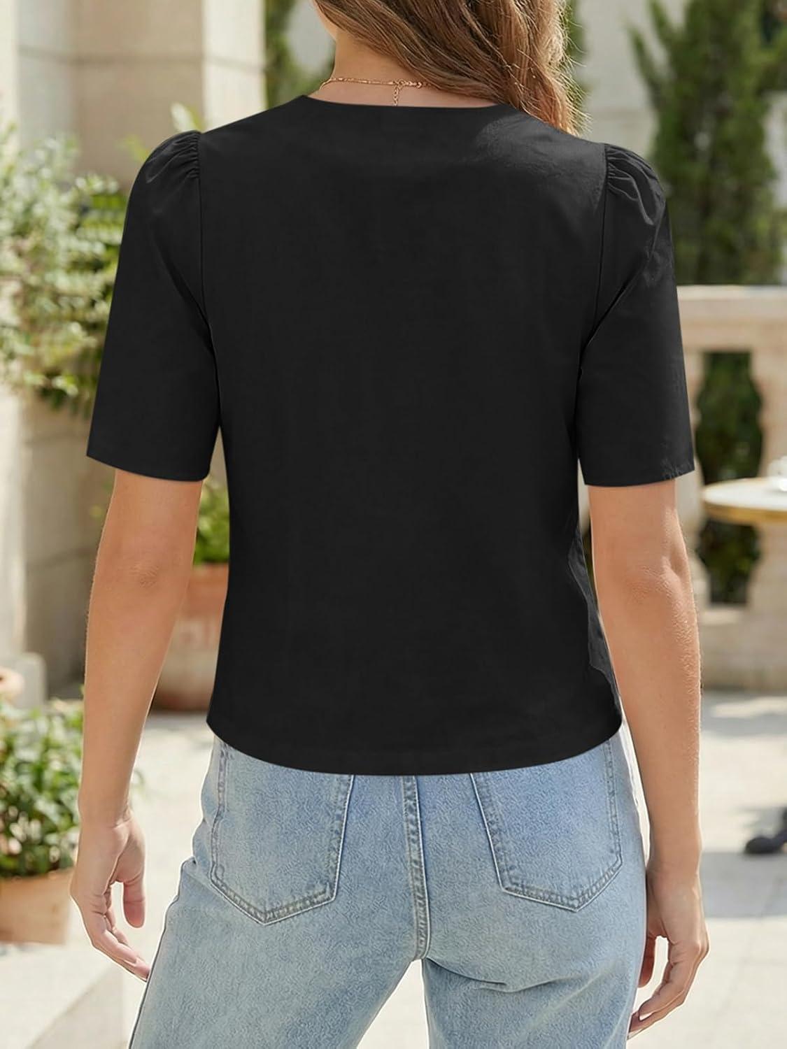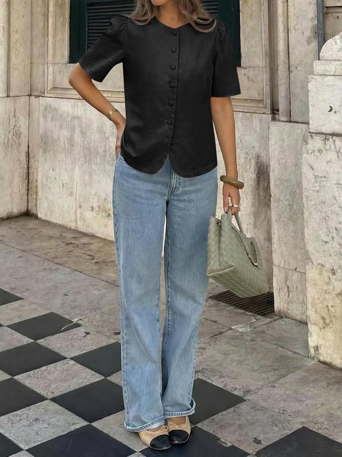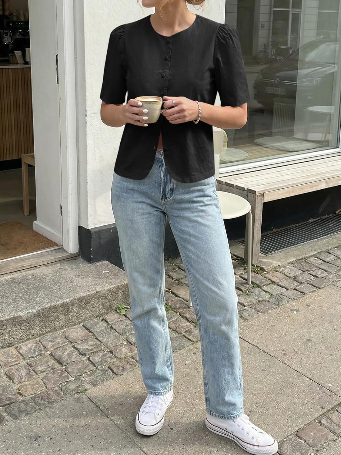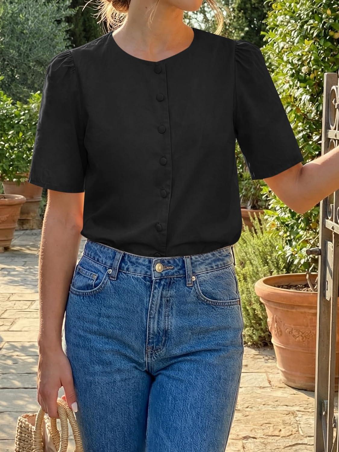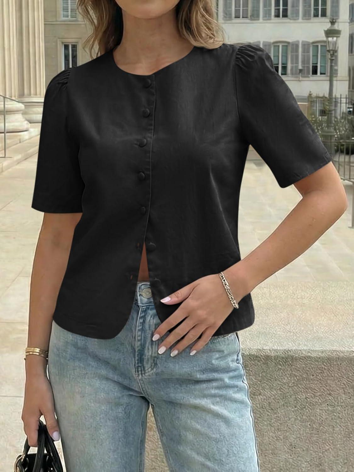 Cicy Bell Womens Short Puff Sleeve Button Down Shirts Dressy Casual Blouses Summer Round Neck Cotton Tops(Black)