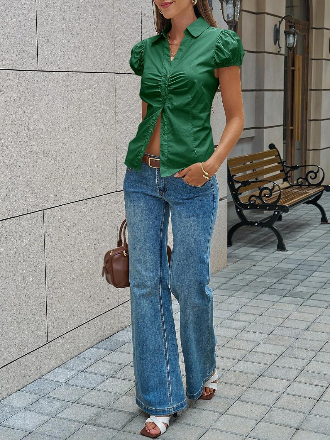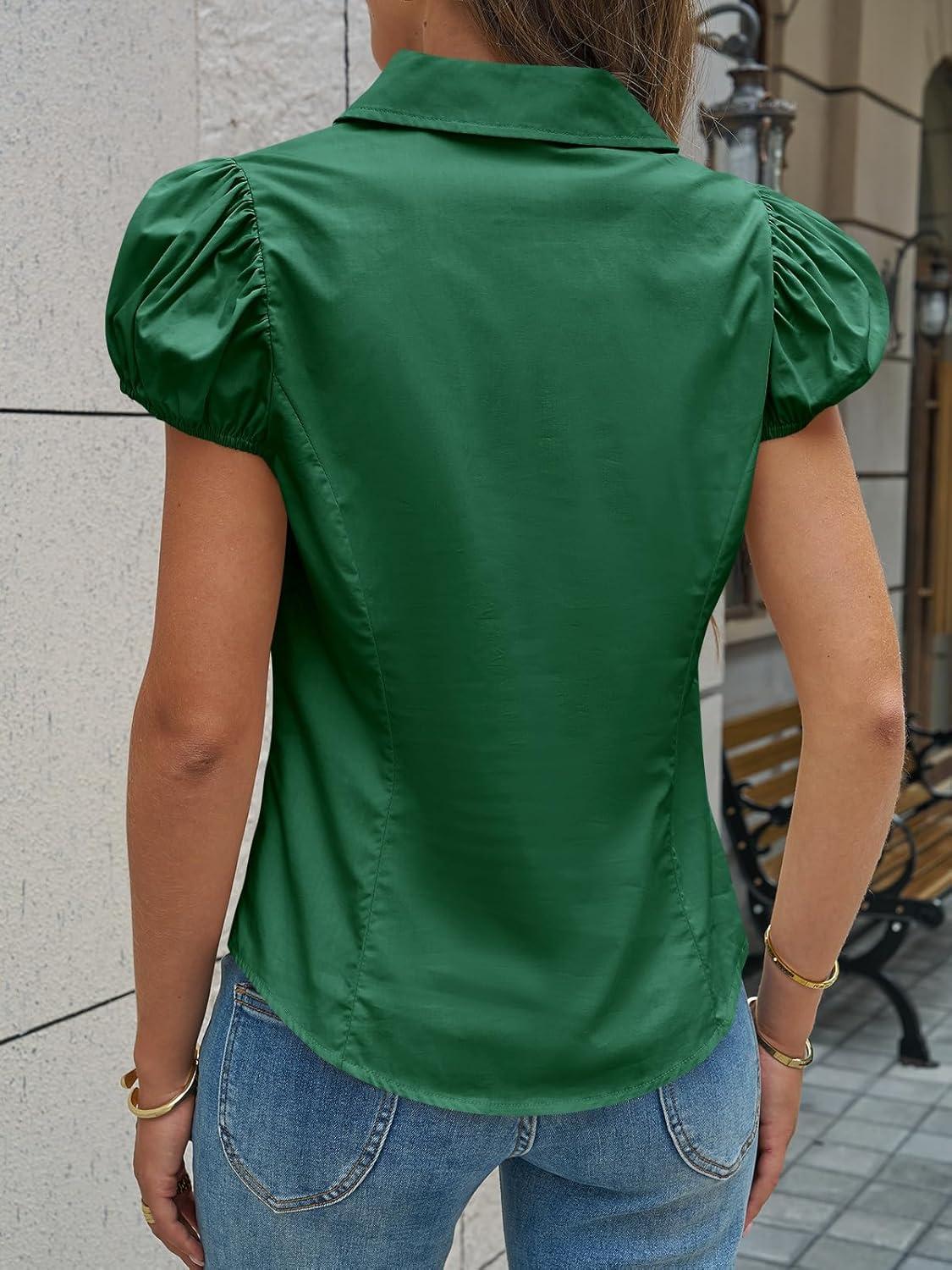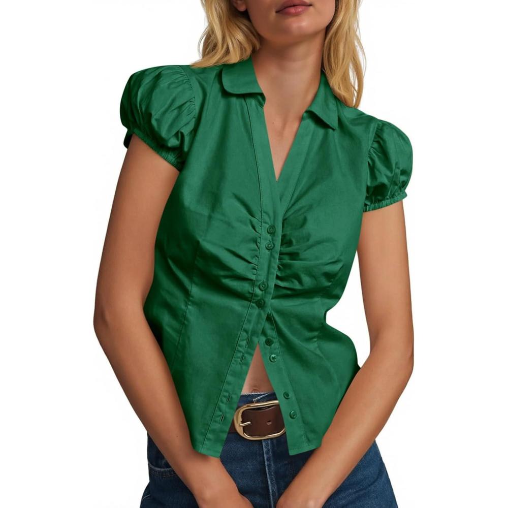 Cicy Bell Womens Short Puff Sleeve Button Down Shirts Summer V Neck Ruched Cotton Tops Casual Dressy Slim Fit Blouses(Deep Green)