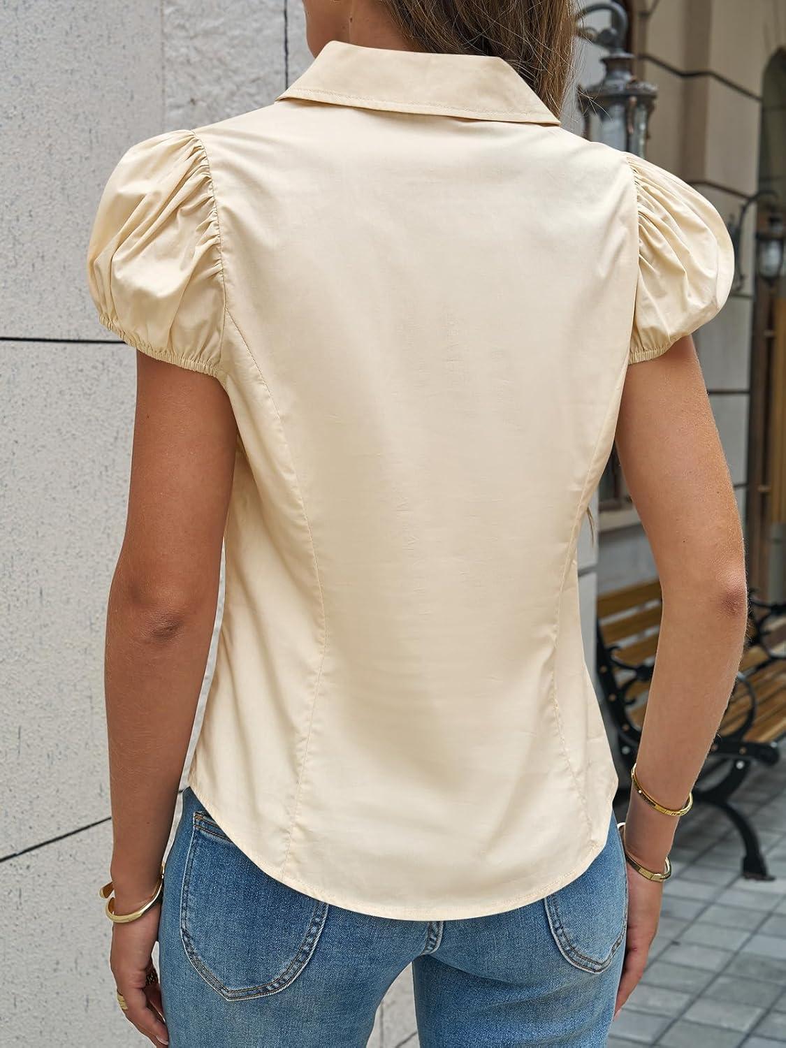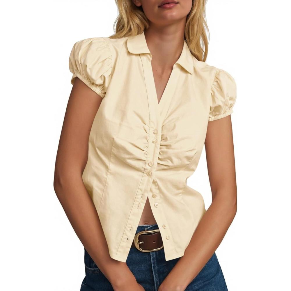 Cicy Bell Womens Short Puff Sleeve Button Down Shirts Summer V Neck Ruched Cotton Tops Casual Dressy Slim Fit Blouses(Light Khaki)