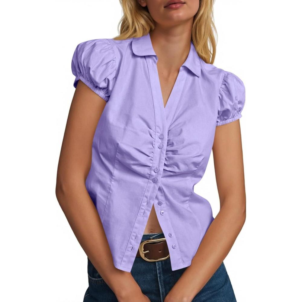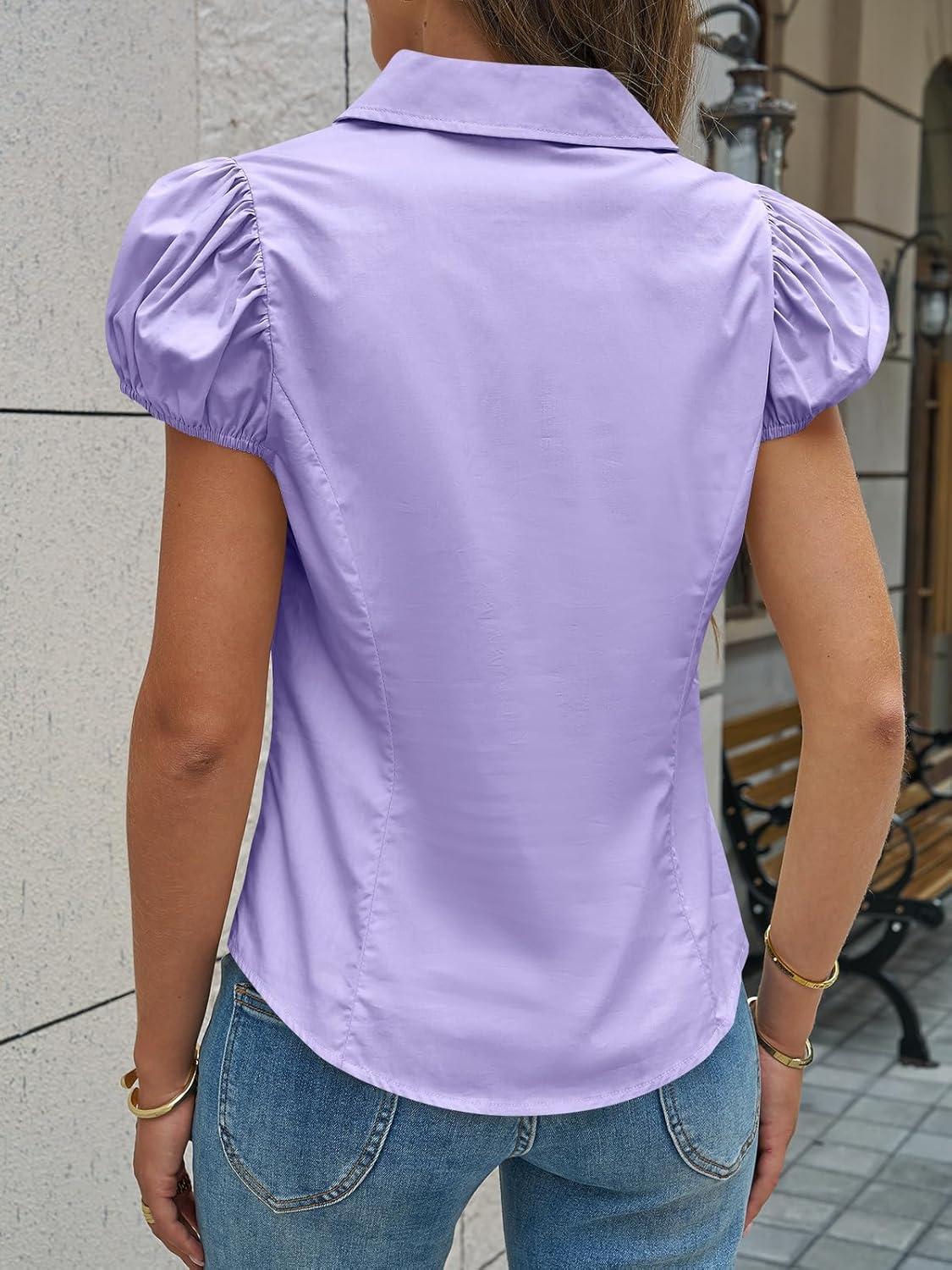 Cicy Bell Womens Short Puff Sleeve Button Down Shirts Summer V Neck Ruched Cotton Tops Casual Dressy Slim Fit Blouses(Light Purple)