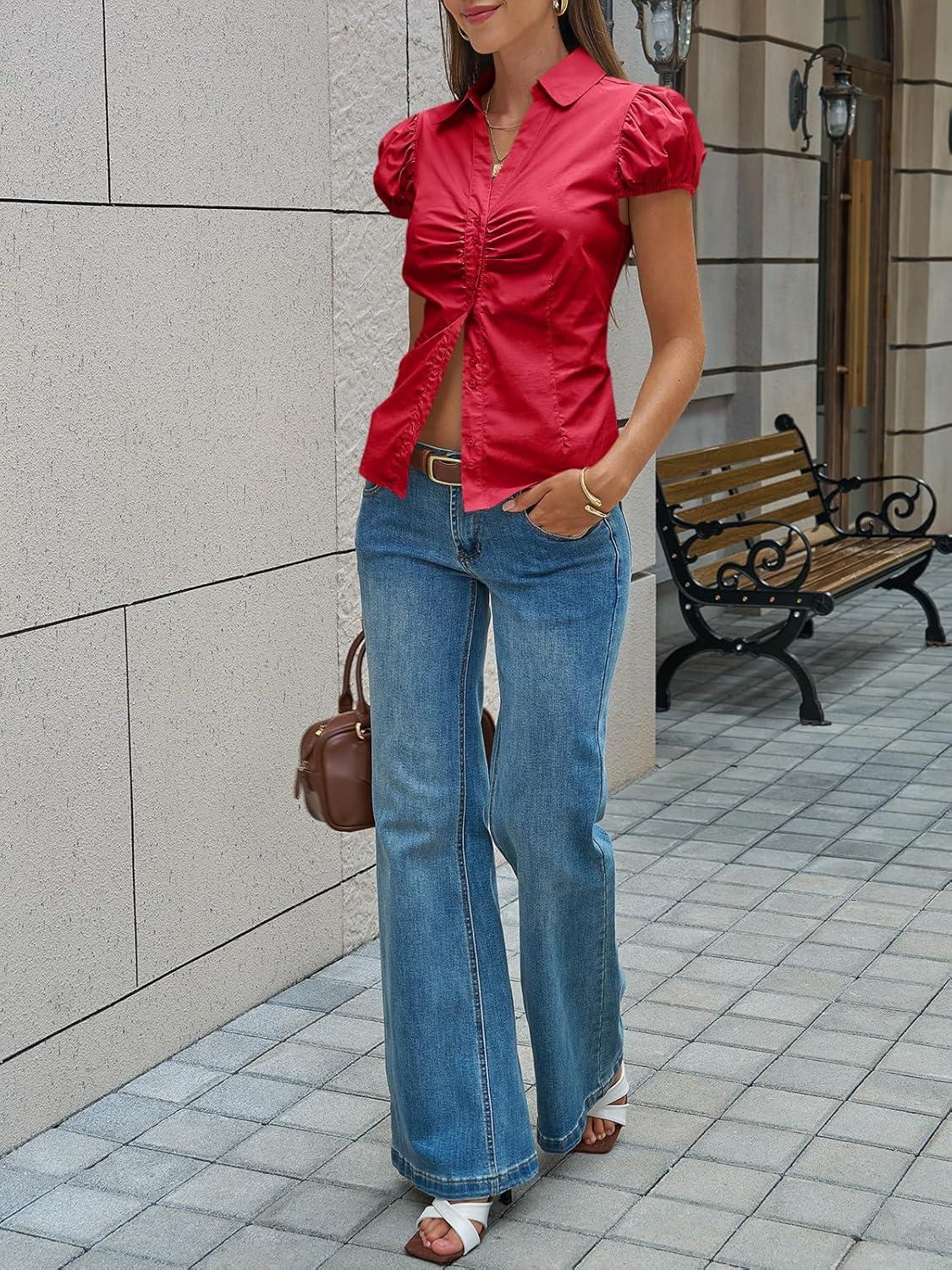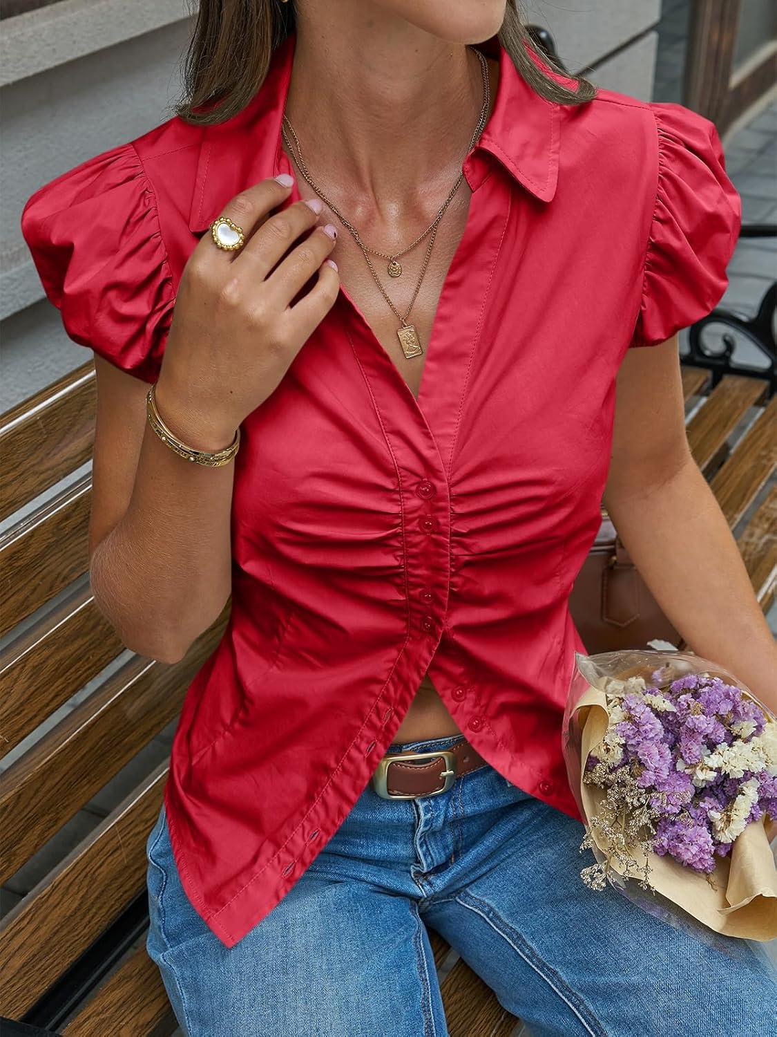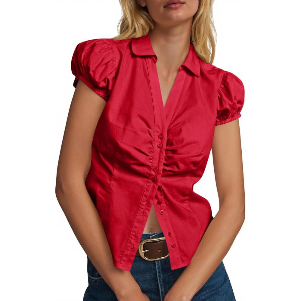Cicy Bell Womens Short Puff Sleeve Button Down Shirts Summer V Neck Ruched Cotton Tops Casual Dressy Slim Fit Blouses(Red)