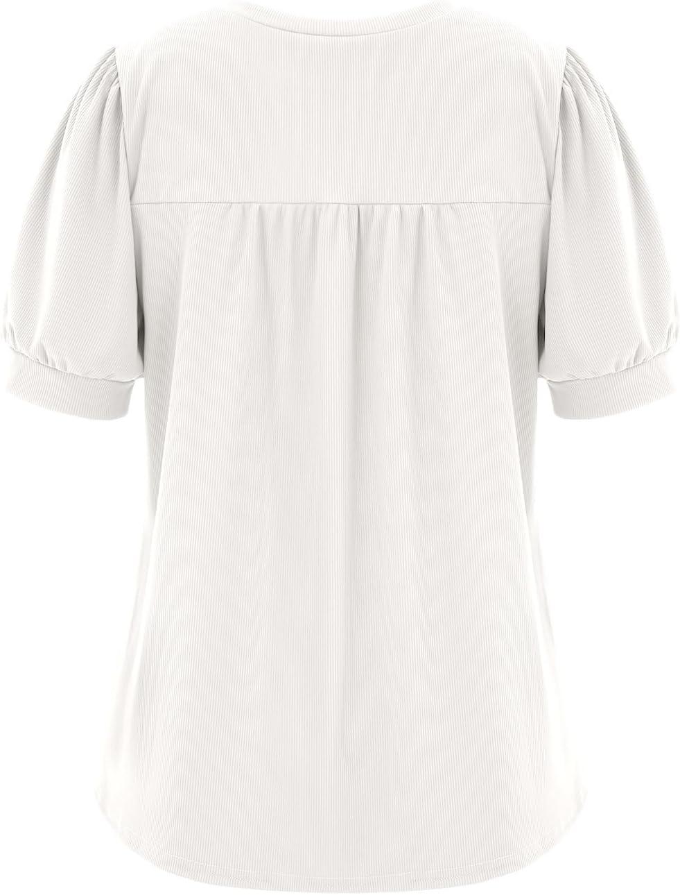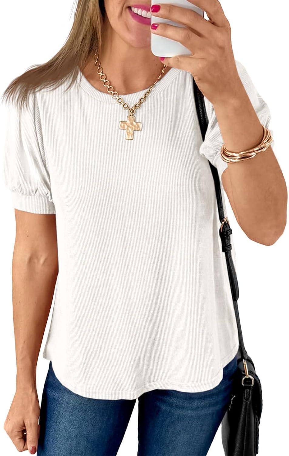 Cicy Bell Womens Short Puff Sleeve Tops Crew Neck Ribbed Summer T-Shirts Loose Fit Flowy Tunic Blouses(White)