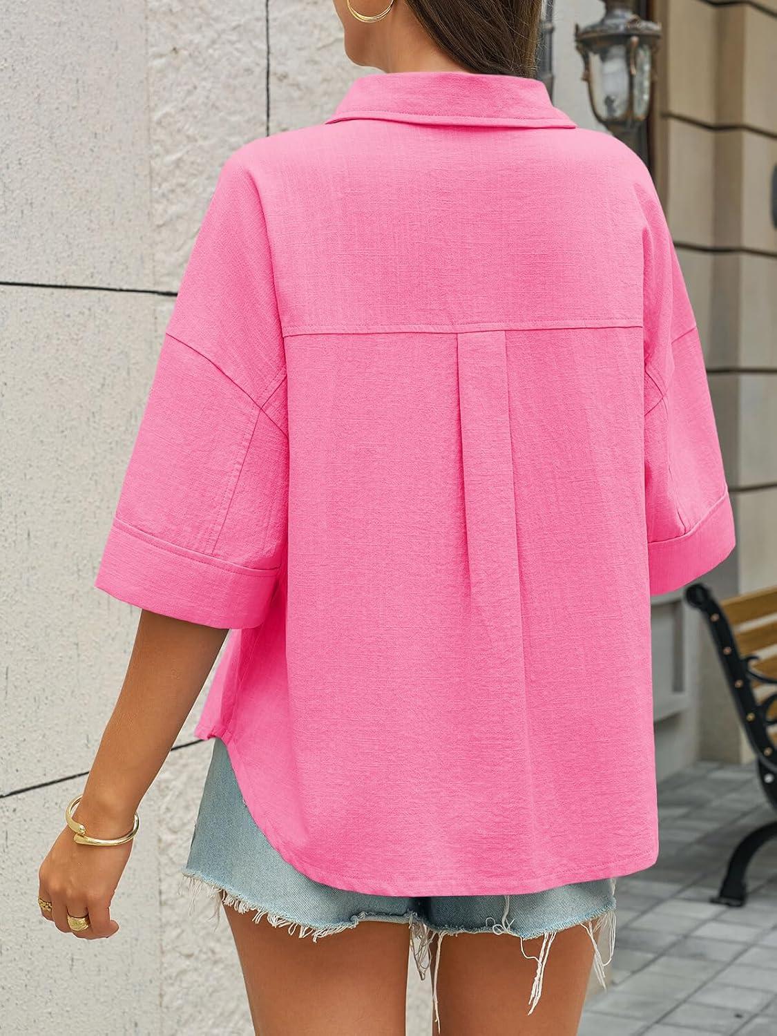 Cicy Bell Womens Short Sleeve Button Down Shirts V Neck Loose Fit Cotton Blouses Casual Summer Tops with Pockets(Bright Pink)