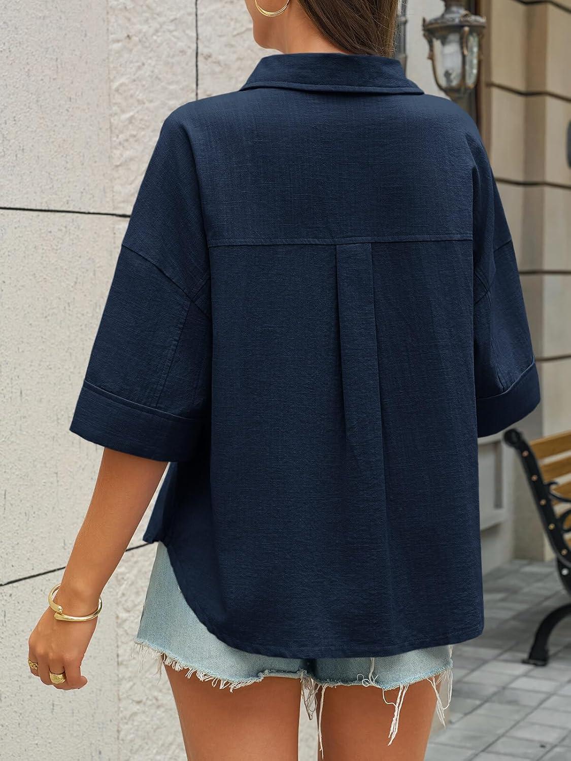 Cicy Bell Womens Short Sleeve Button Down Shirts V Neck Loose Fit Cotton Blouses Casual Summer Tops with Pockets(Dark Blue)