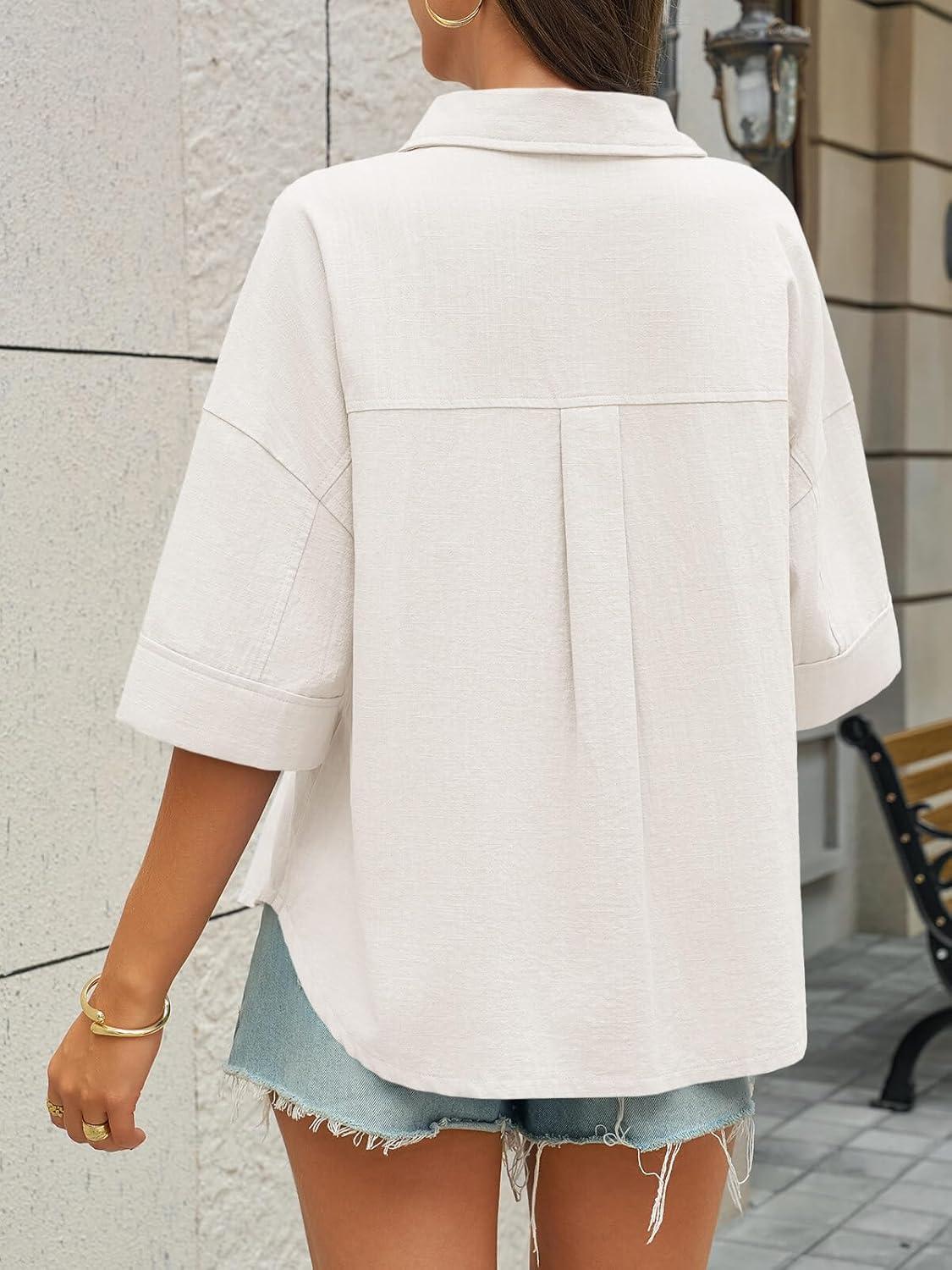 Cicy Bell Womens Short Sleeve Button Down Shirts V Neck Loose Fit Cotton Blouses Casual Summer Tops with Pockets(White)
