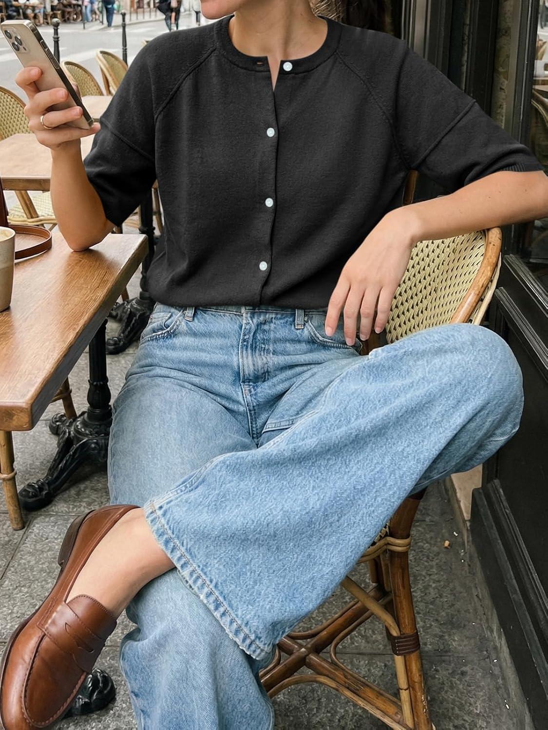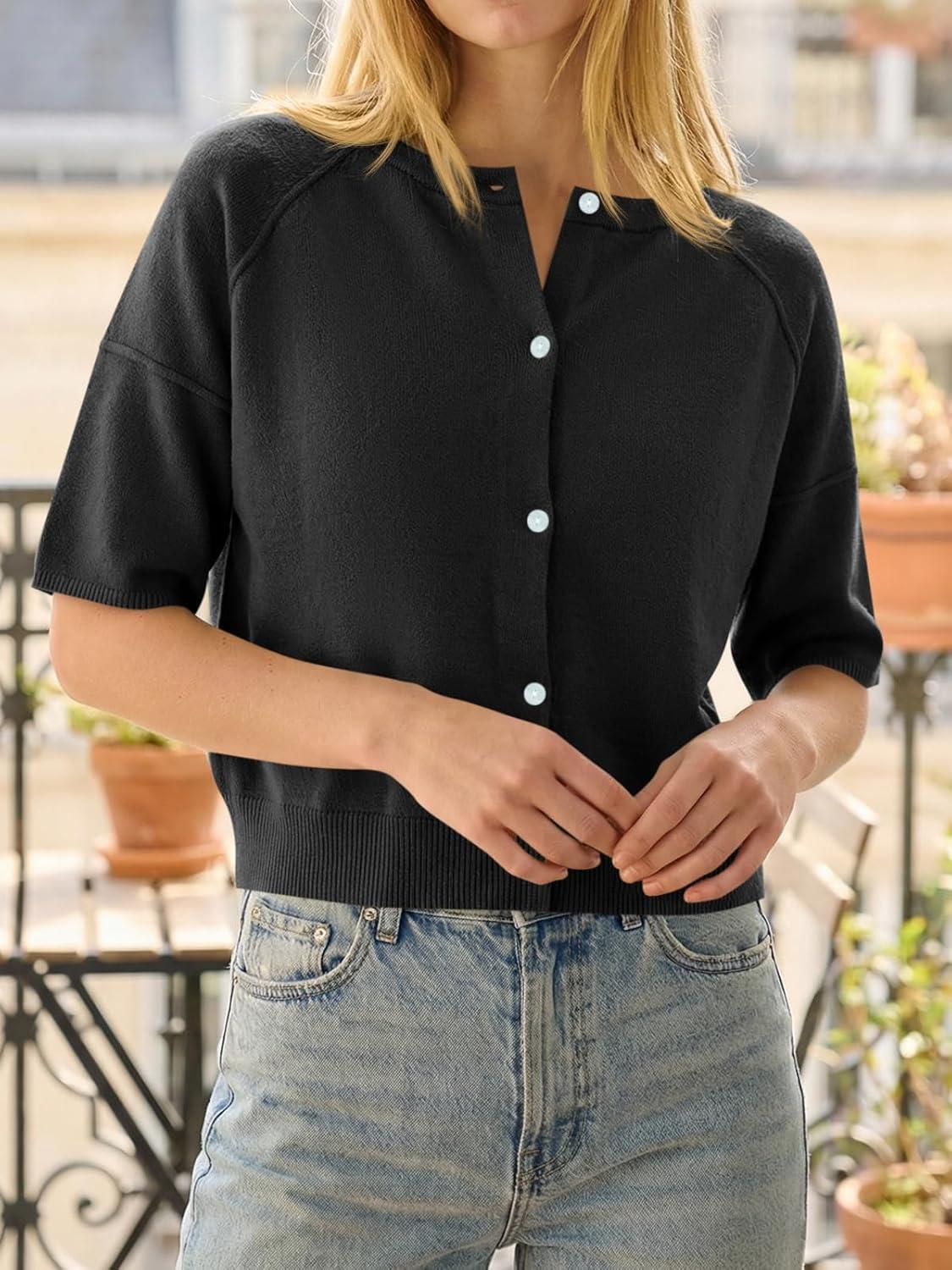 Cicy Bell Womens Short Sleeve Sweater Cardigan Casual Button Down Lightweight Cropped Ribbed Knit Tops(Black)