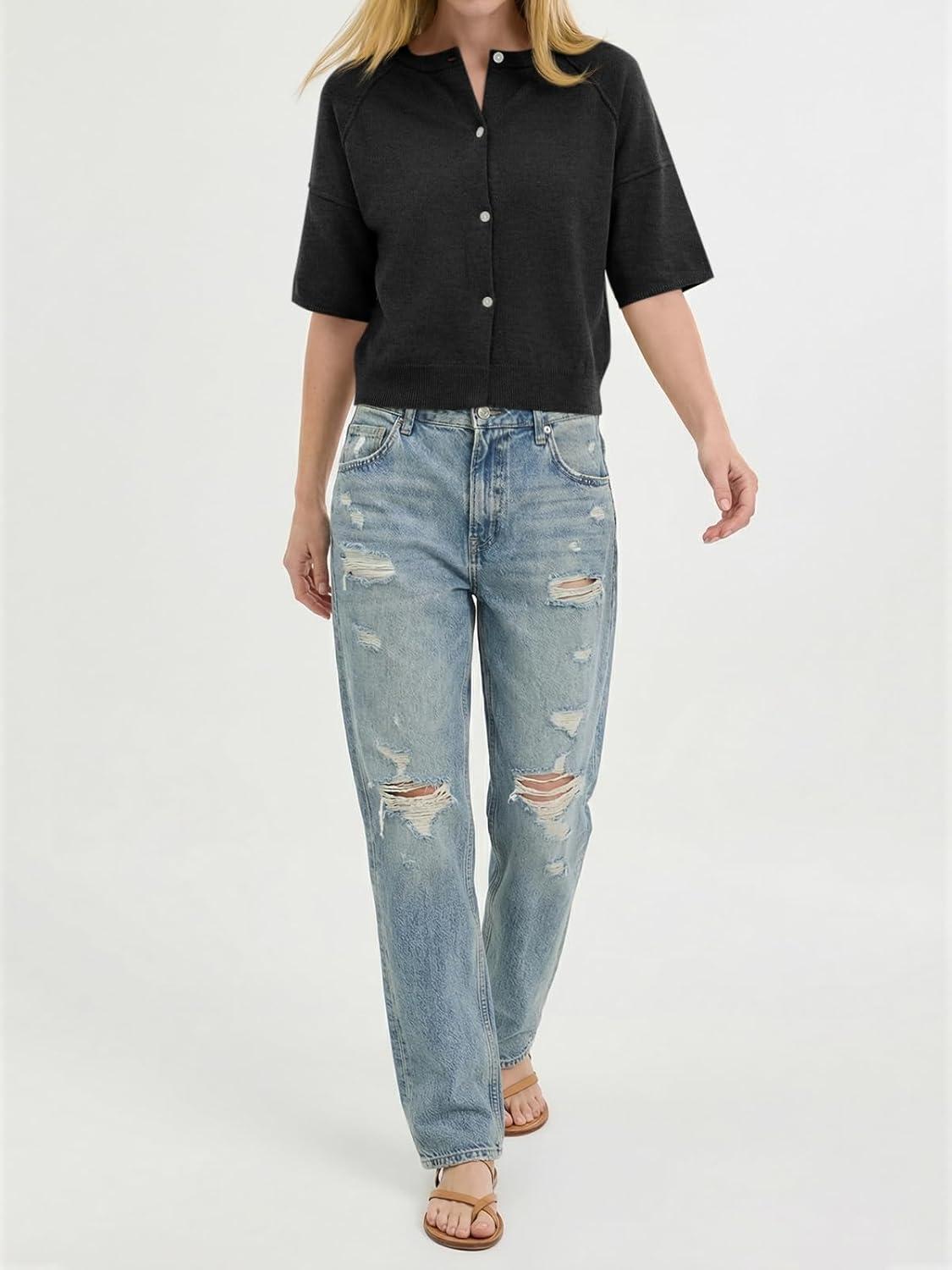 imageCicy Bell Womens Short Sleeve Sweater Cardigan Casual Button Down Lightweight Cropped Ribbed Knit TopsBlack