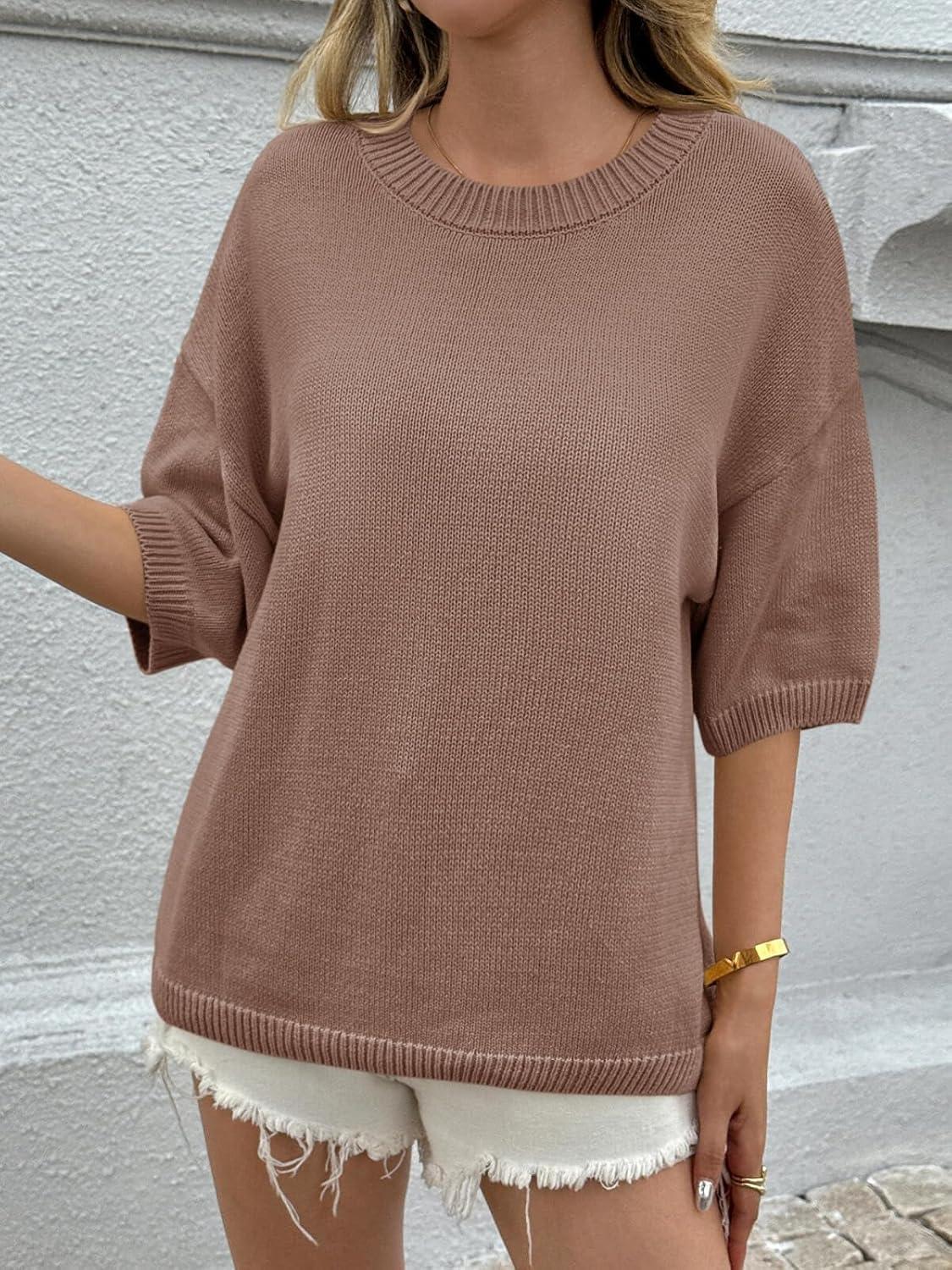 Cicy Bell Womens Short Sleeve Sweaters Oversized Crew Neck Knit Pullover Tops Summer Loose Fit Sweater(Brown)
