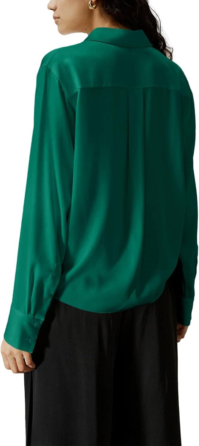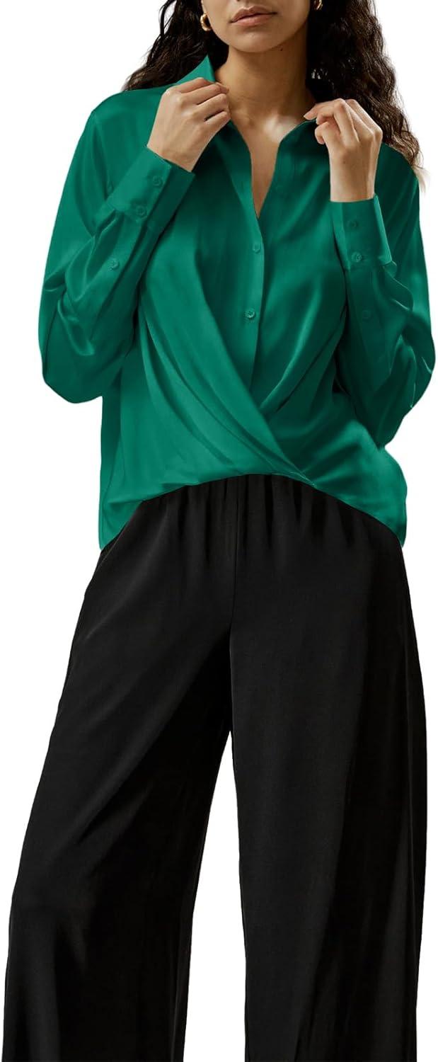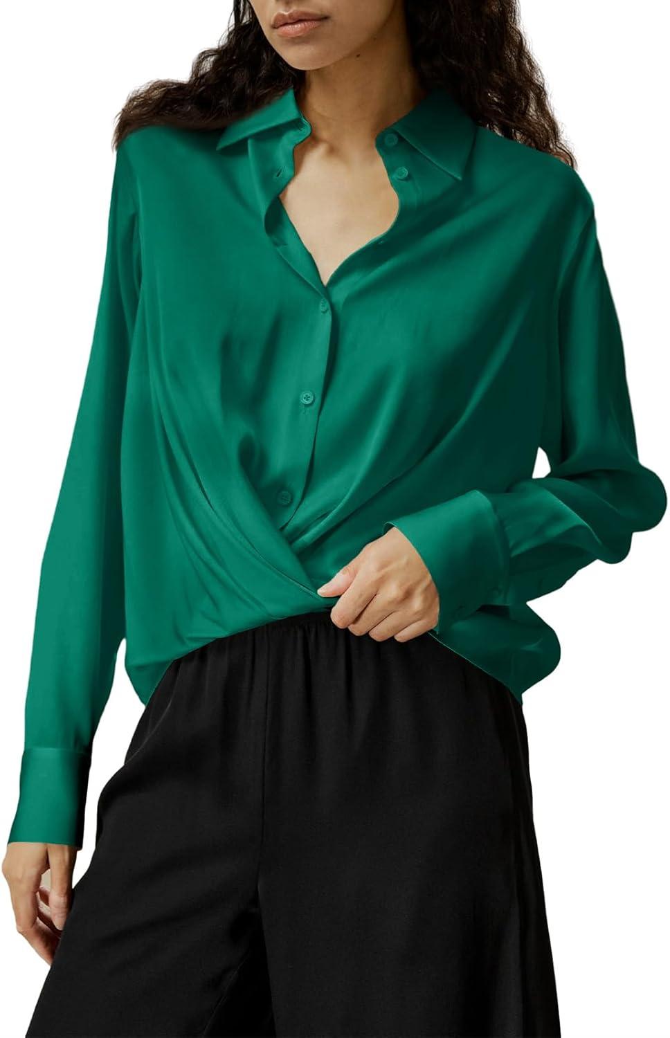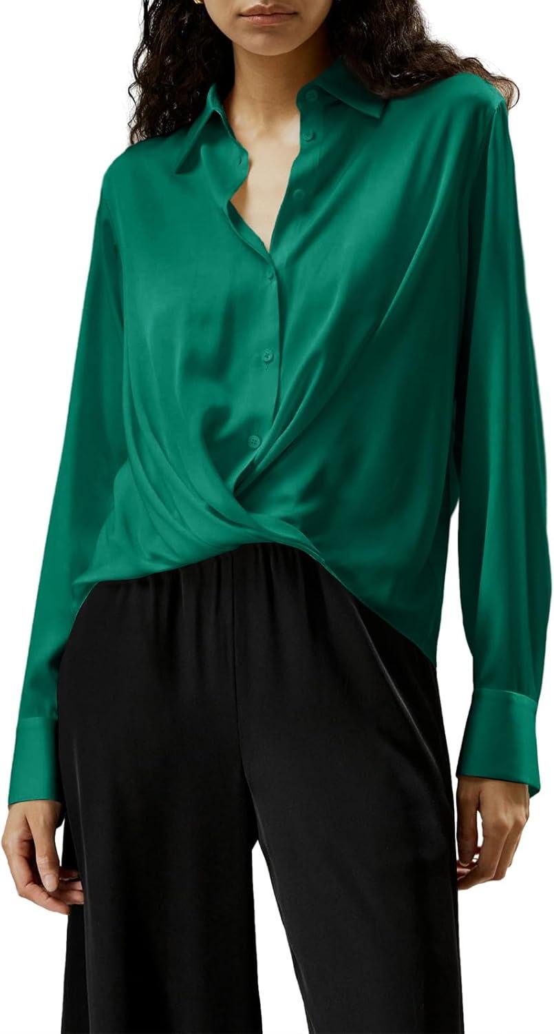 Cicy Bell Womens Silk Button Down Shirts Long Sleeve Dressy Work Casual Twist Front Satin Blouse Tops(Deep Green)
