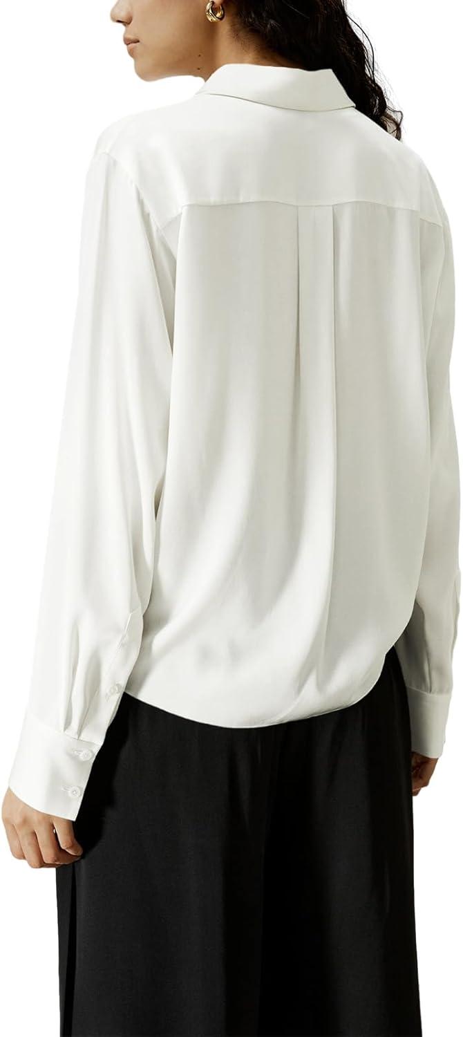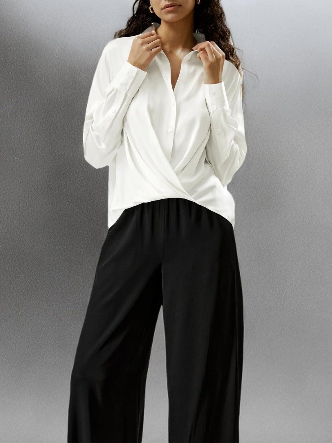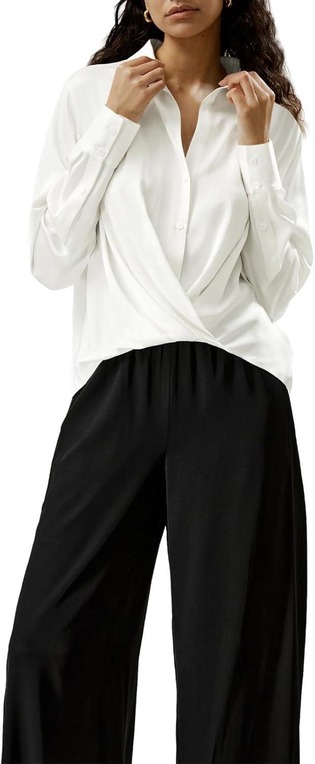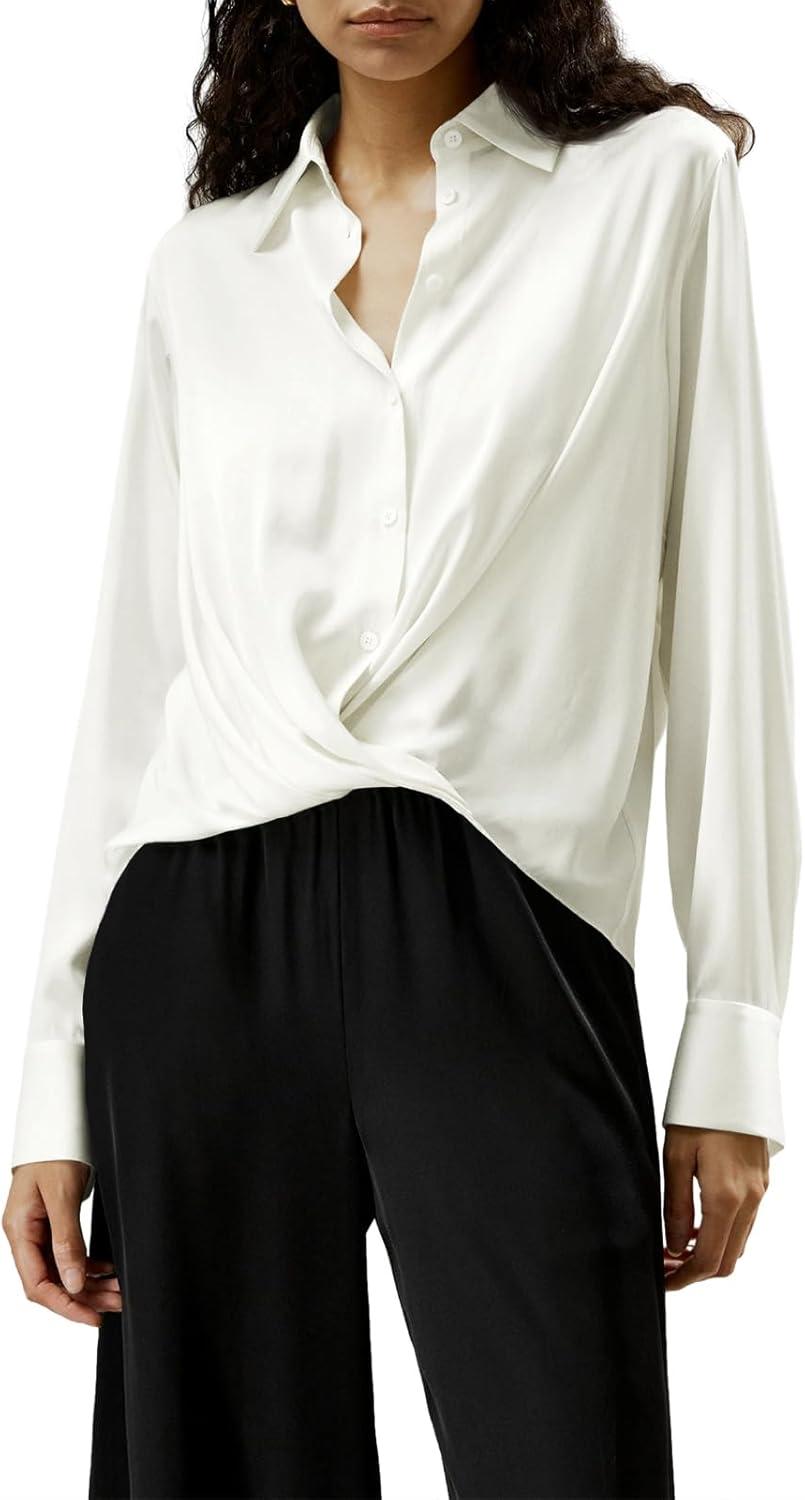 Cicy Bell Womens Silk Button Down Shirts Long Sleeve Dressy Work Casual Twist Front Satin Blouse Tops(White)