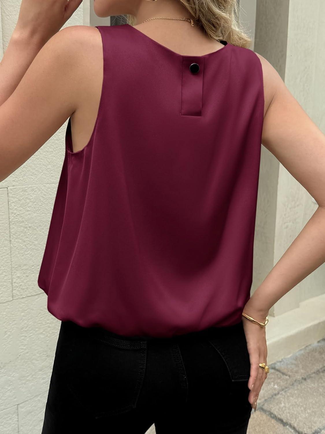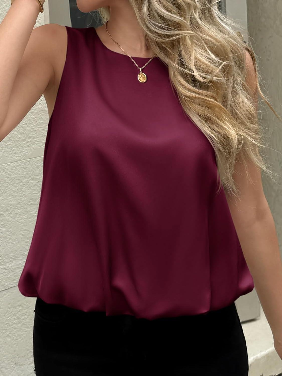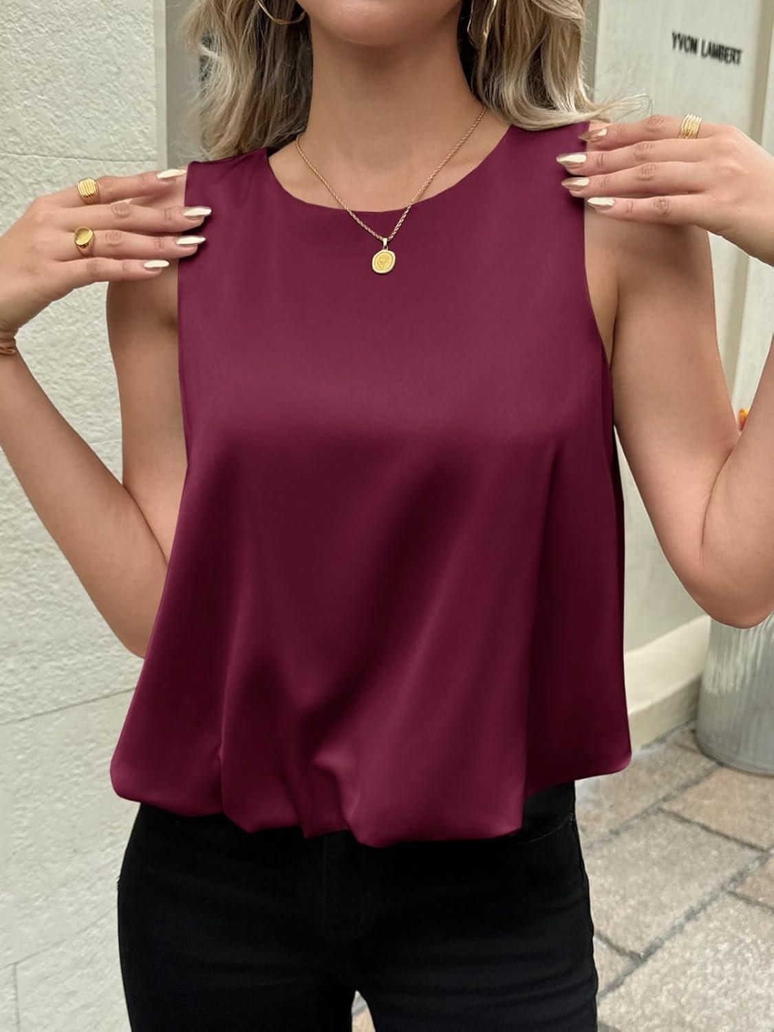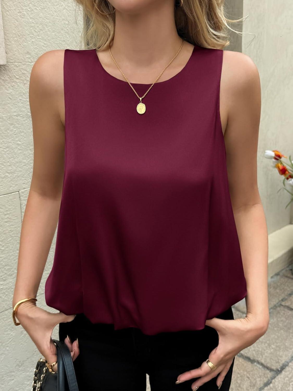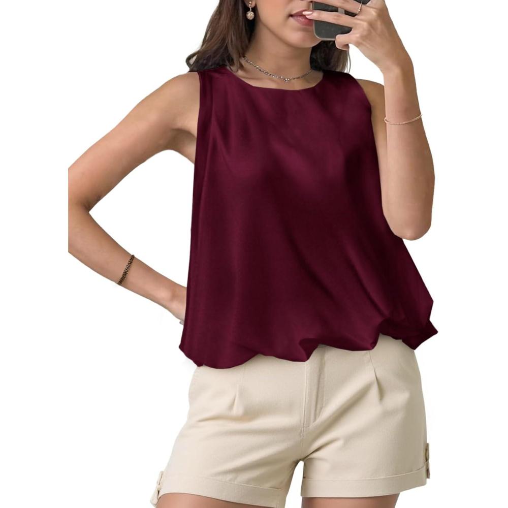 Cicy Bell Womens Silk Satin Cropped Tank Tops Bubble Hem Summer Trendy Sleeveless Shirts Crew Neck Loose Fit Blouses(Wine Red)