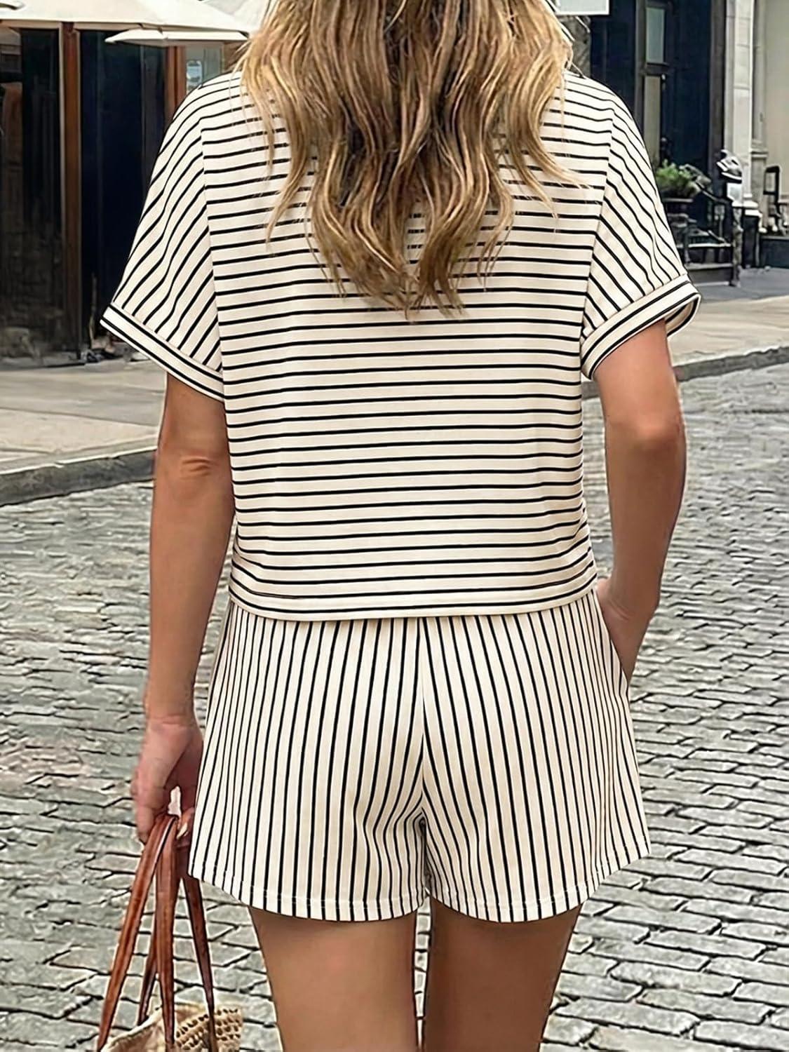 Cicy Bell Womens Striped 2 Piece Short Sets Summer Short Sleeve Collared V Neck Cropped Tops Vacation Casual Lounge Outfits(Black)