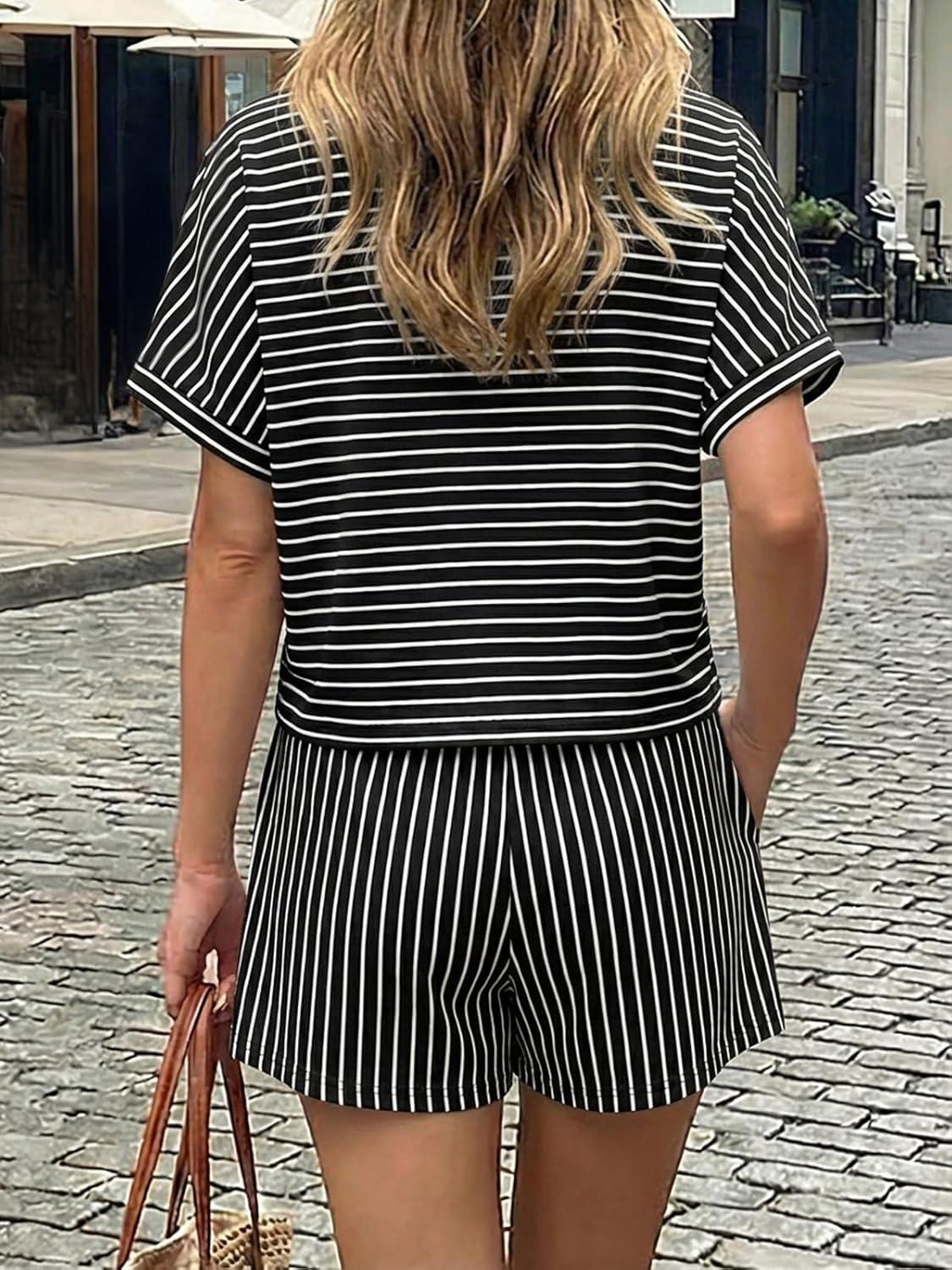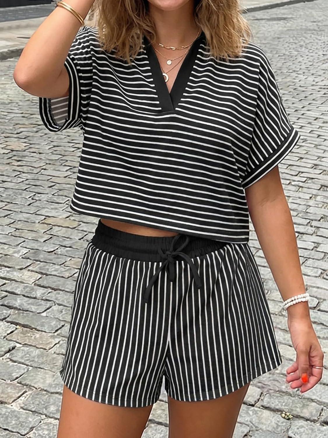 Cicy Bell Womens Striped 2 Piece Short Sets Summer Short Sleeve Collared V Neck Cropped Tops Vacation Casual Lounge Outfits(Black)