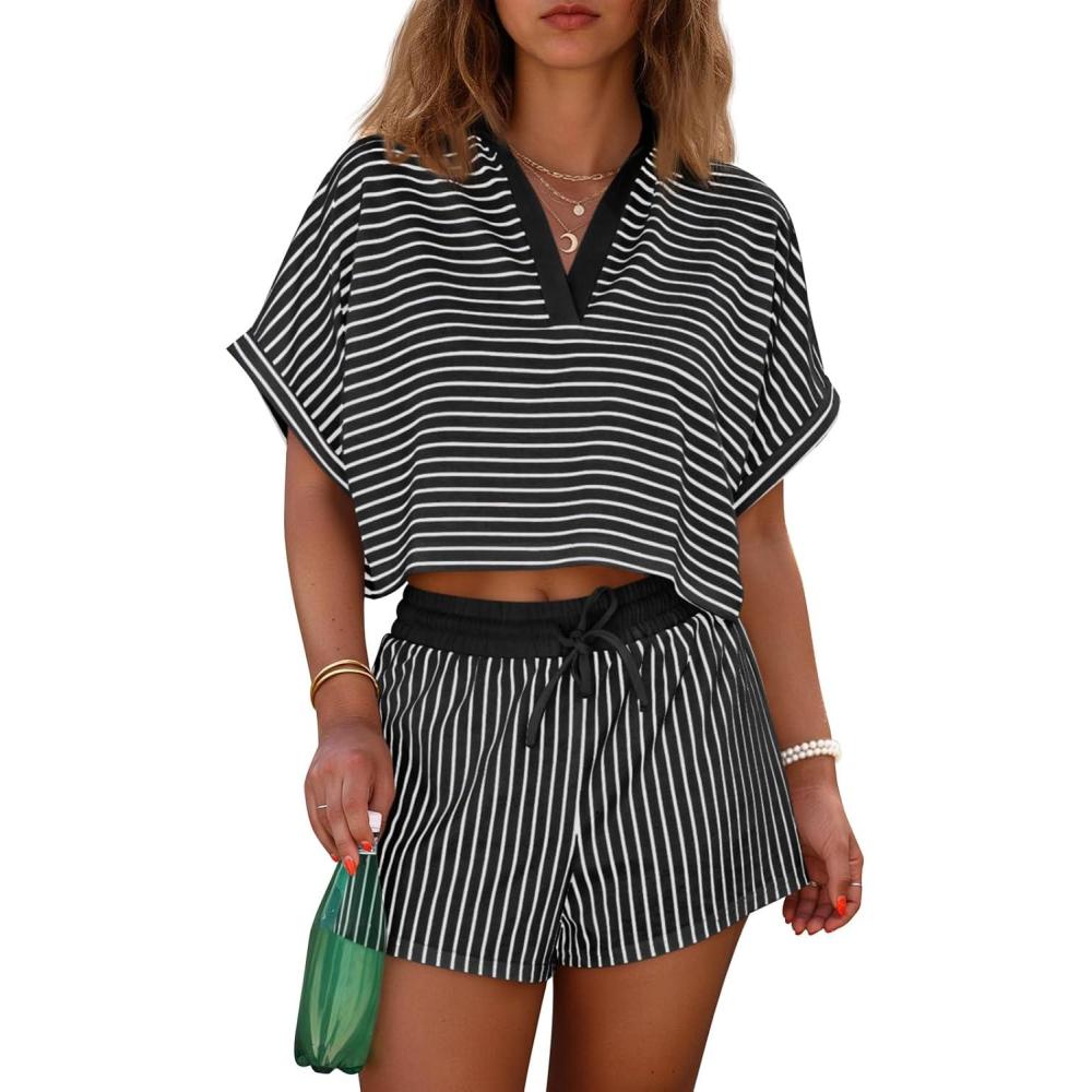imageCicy Bell Womens Striped 2 Piece Short Sets Summer Short Sleeve Collared V Neck Cropped Tops Vacation Casual Lounge OutfitsBlack