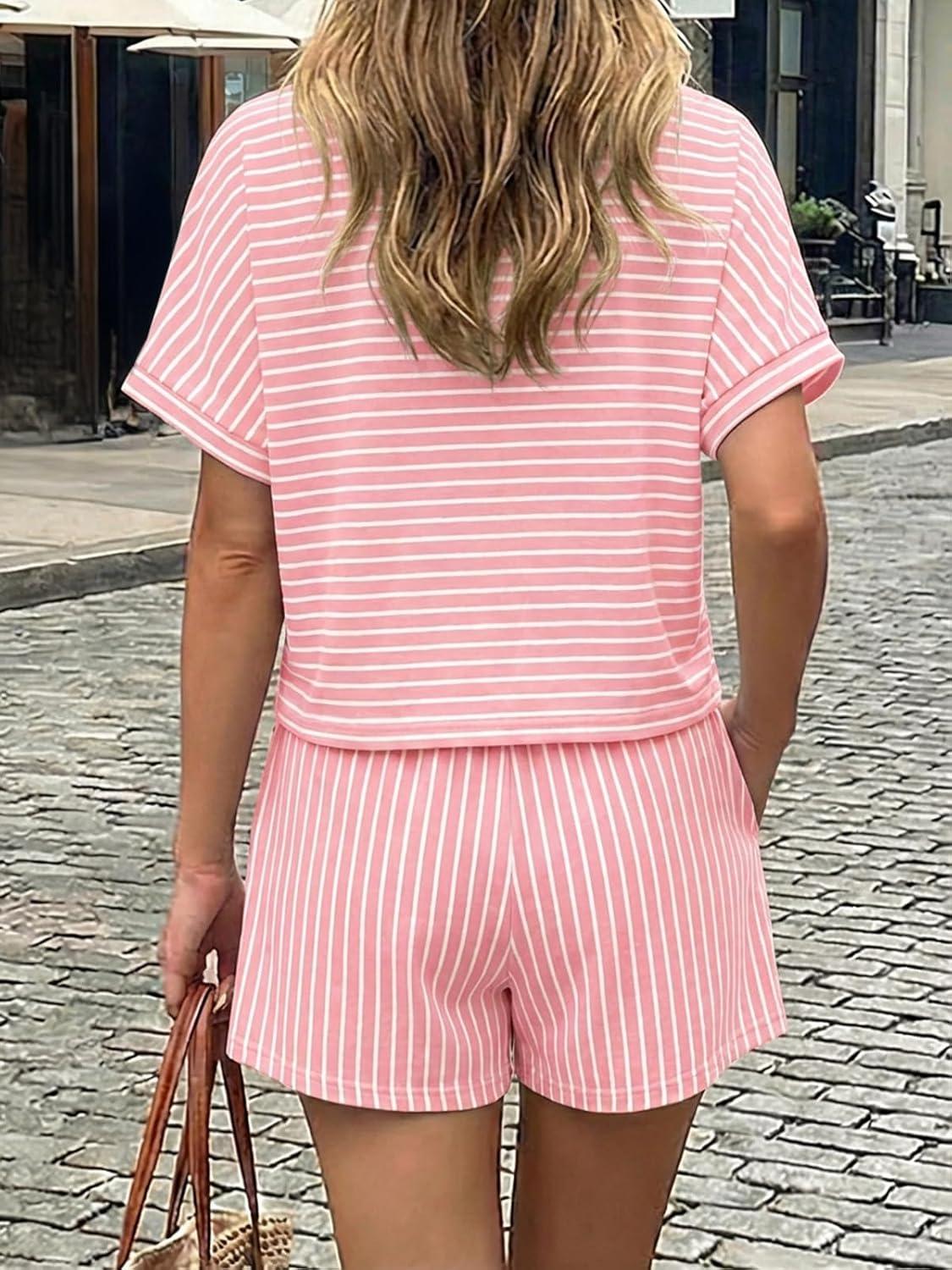 Cicy Bell Womens Striped 2 Piece Short Sets Summer Short Sleeve Collared V Neck Cropped Tops Vacation Casual Lounge Outfits(Pink)