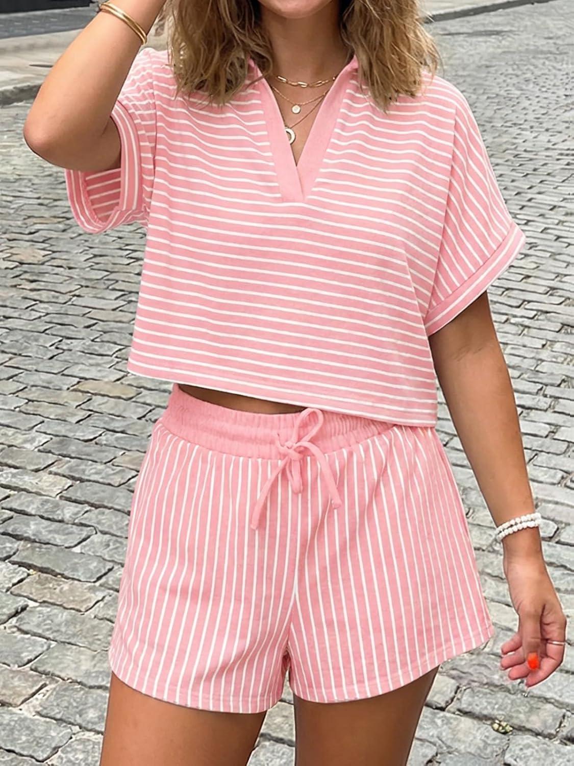 imageCicy Bell Womens Striped 2 Piece Short Sets Summer Short Sleeve Collared V Neck Cropped Tops Vacation Casual Lounge OutfitsPink