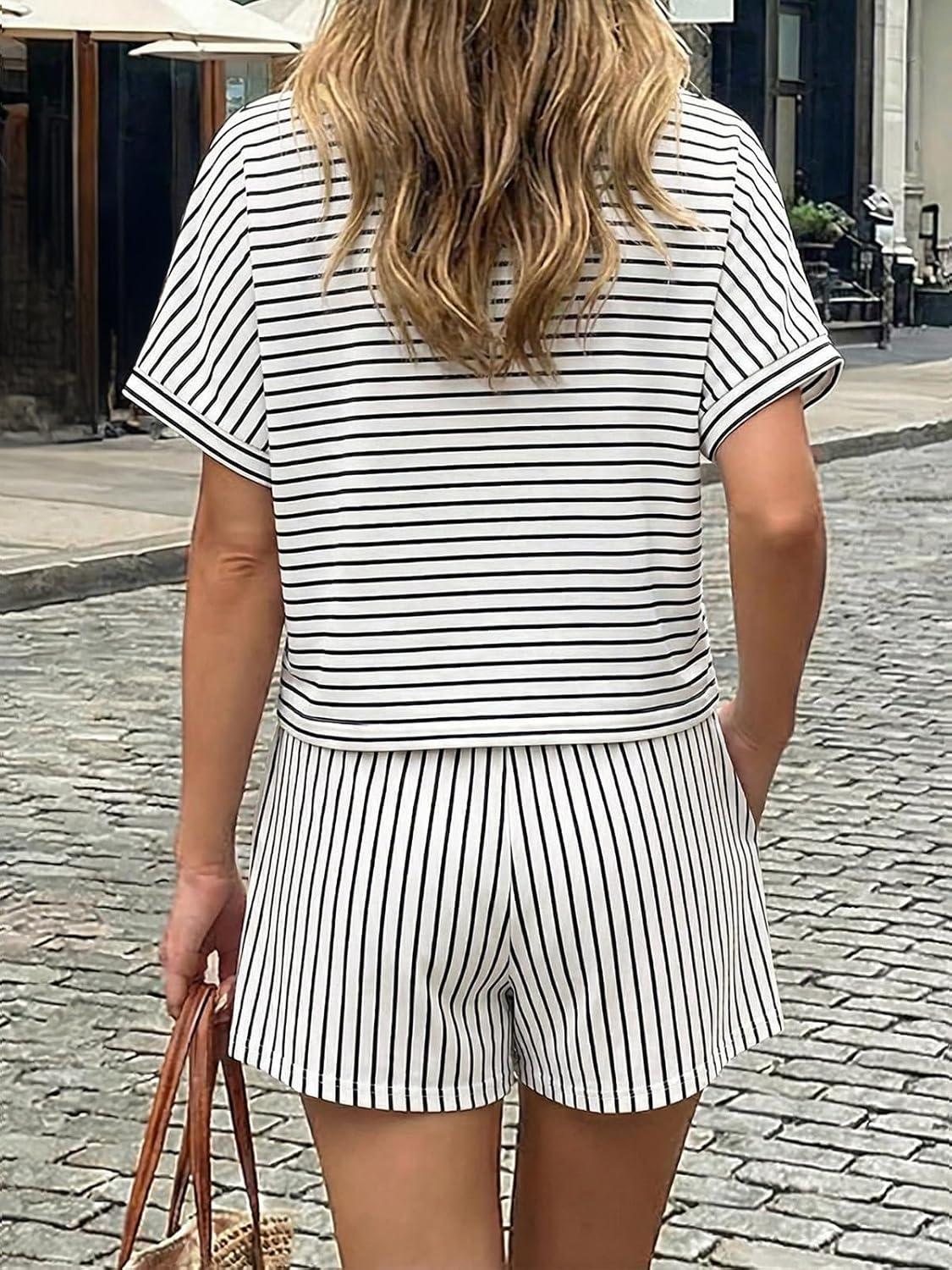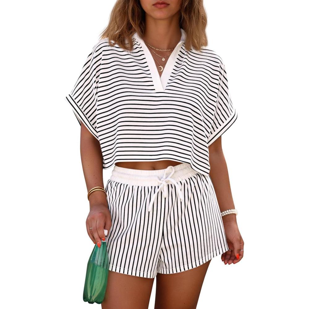 Cicy Bell Womens Striped 2 Piece Short Sets Summer Short Sleeve Collared V Neck Cropped Tops Vacation Casual Lounge Outfits(White)