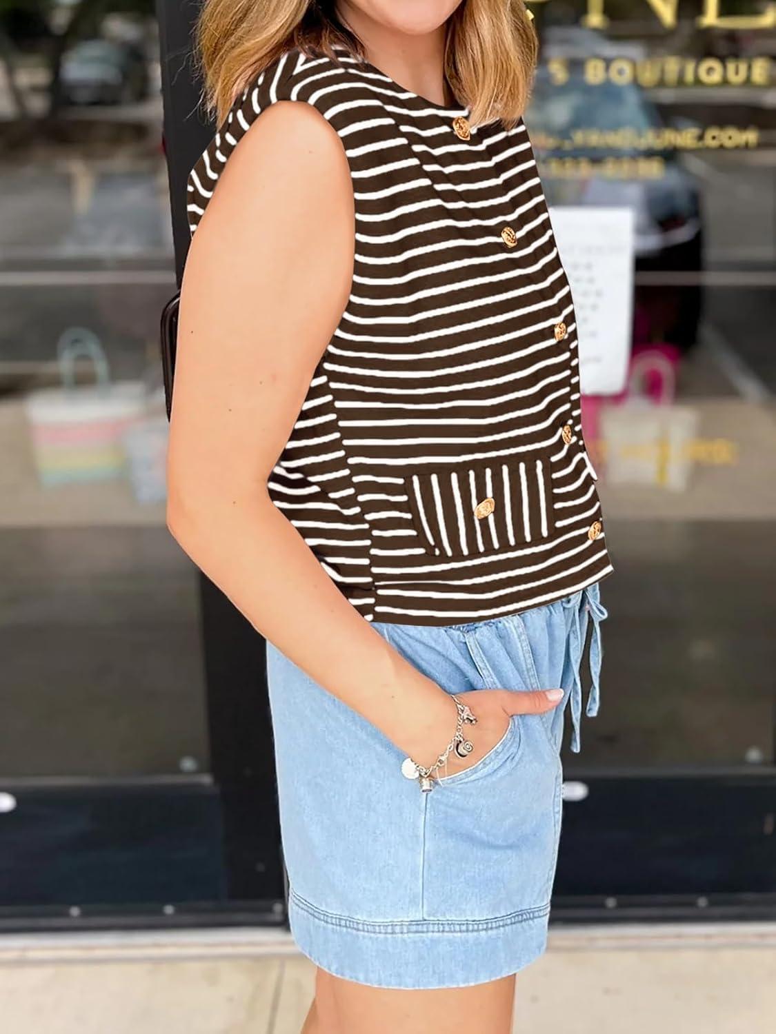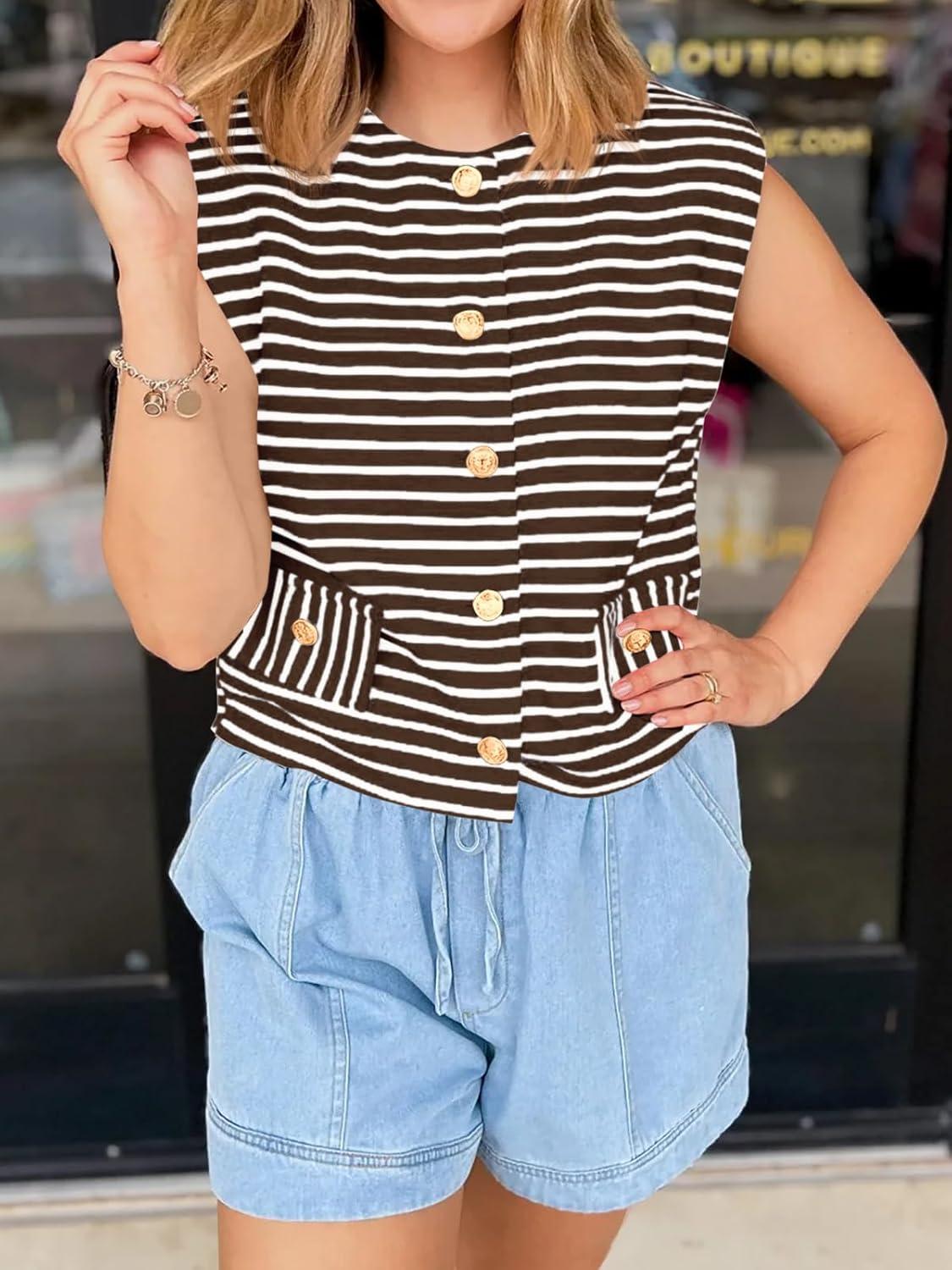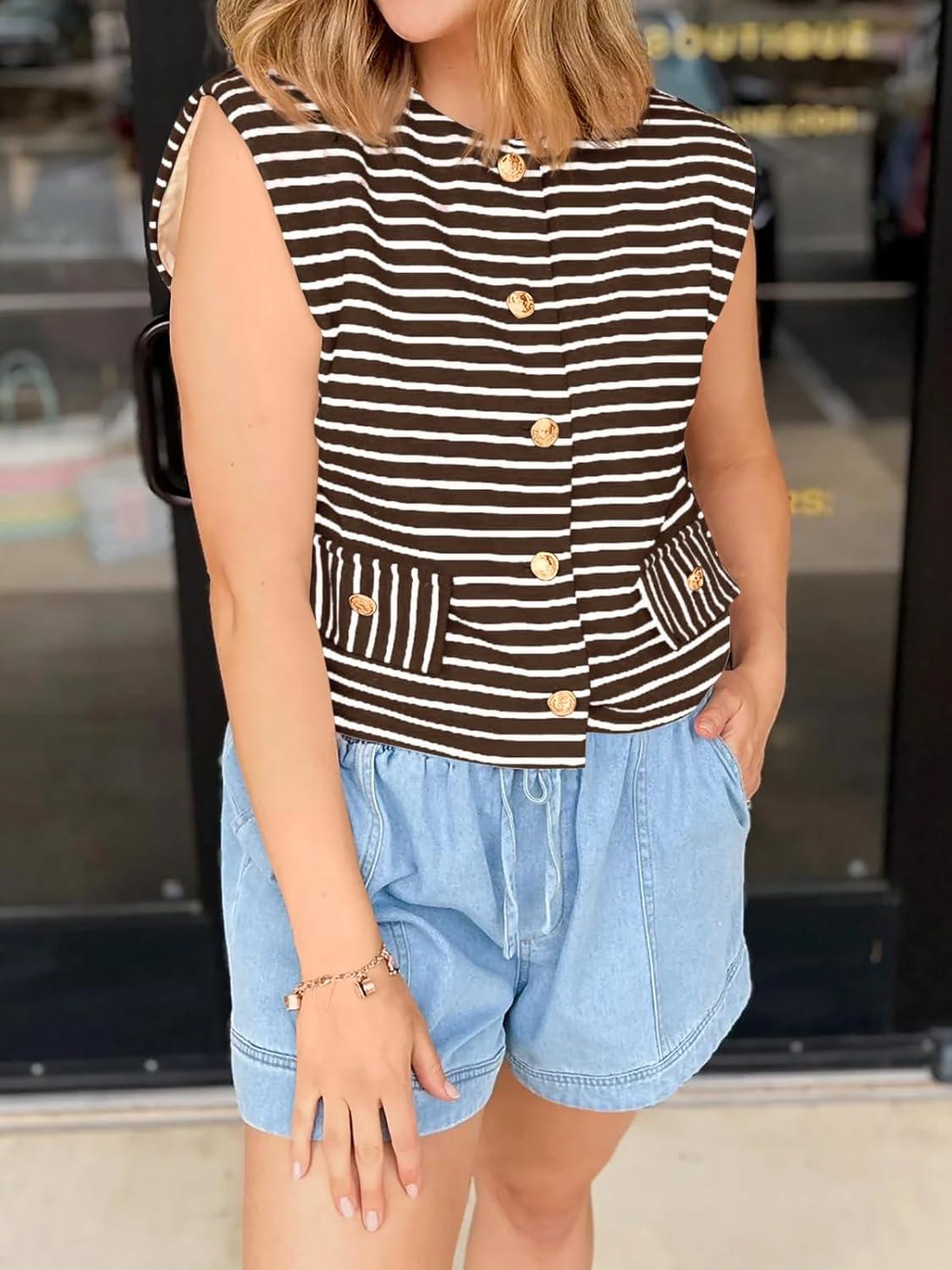 Cicy Bell Womens Striped Vest Summer Casual Button Down Cap Sleeve Tank Tops Crew Neck Sleeveless Cardigan(Brown)
