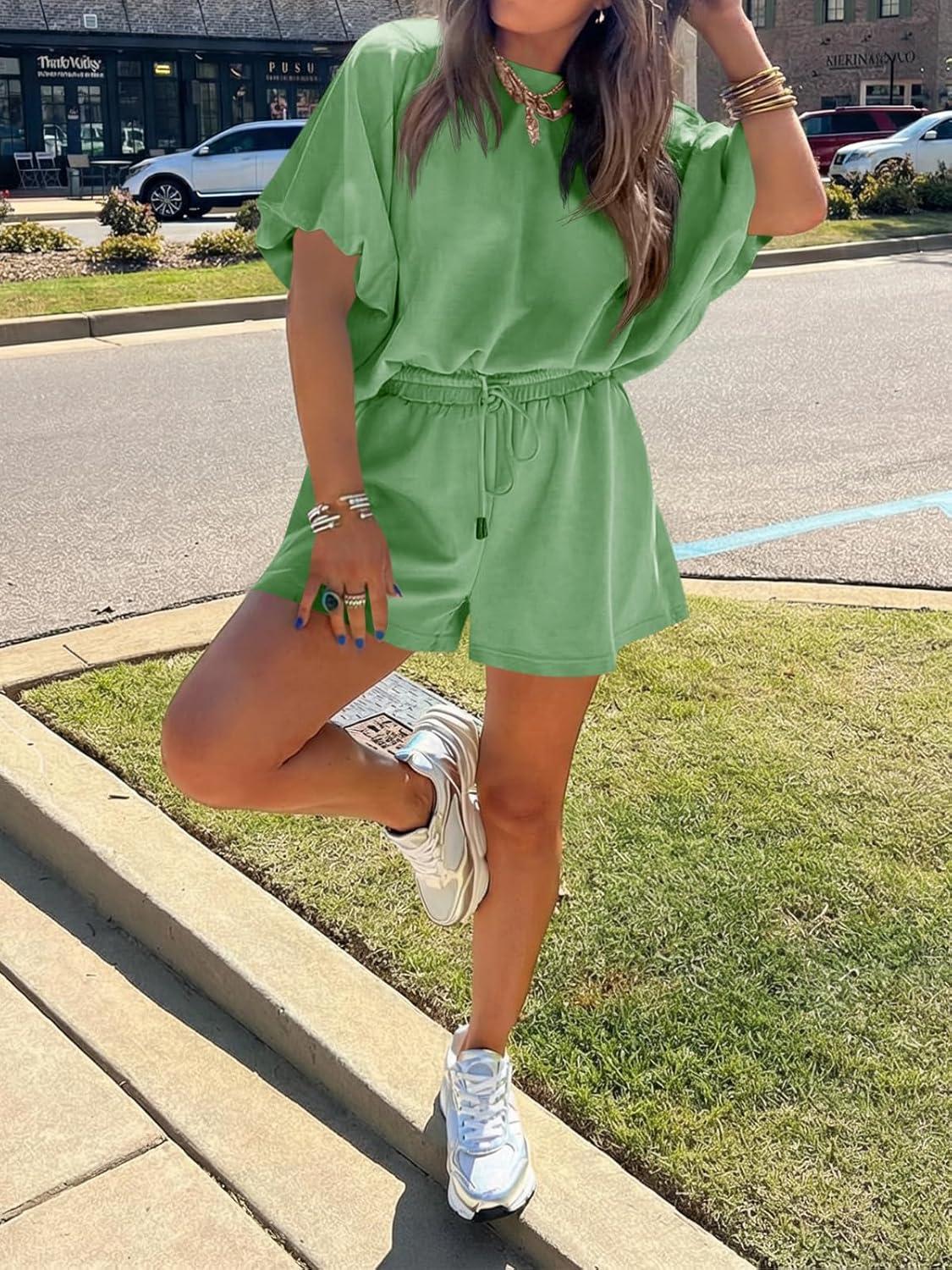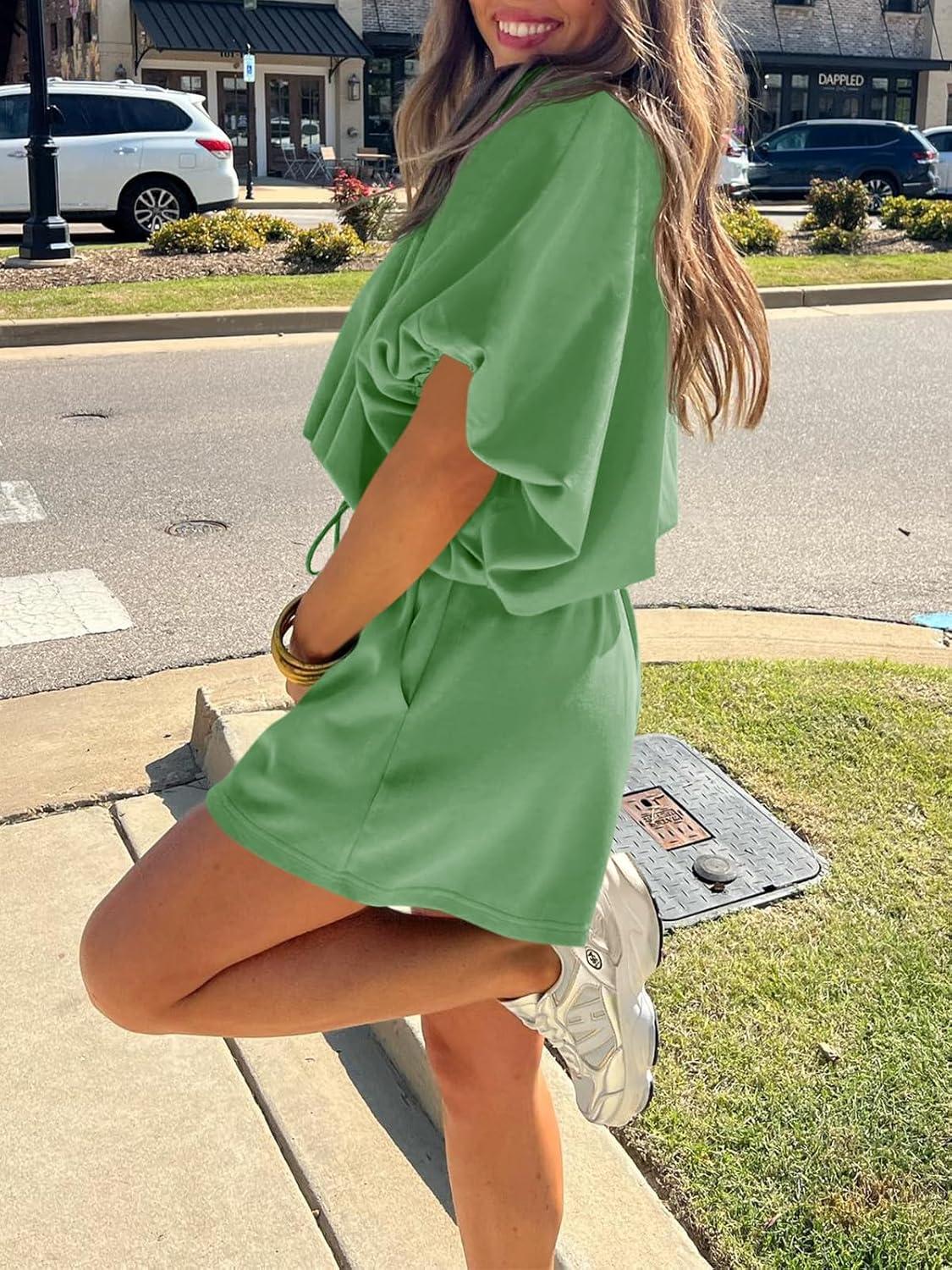 Cicy Bell Womens Summer 2 Piece Short Sets Puff Sleeve Cropped Tops and Shorts Casual Loose Outfits Comfy Lounge Sets(Army Green)