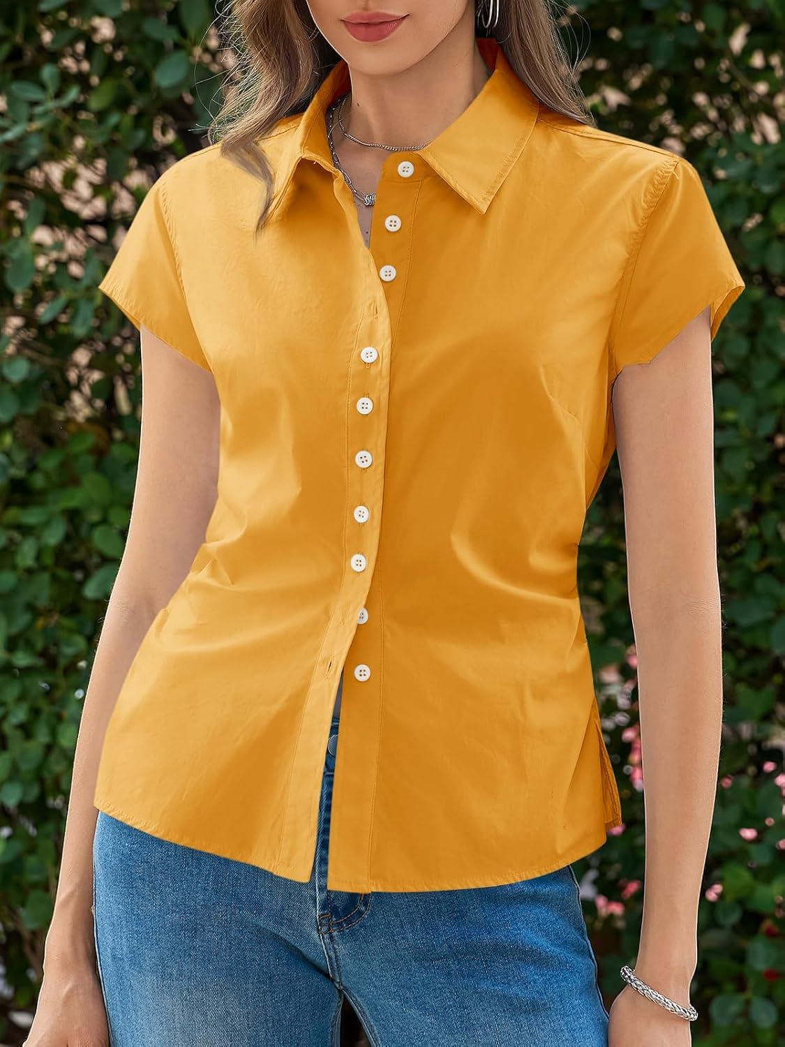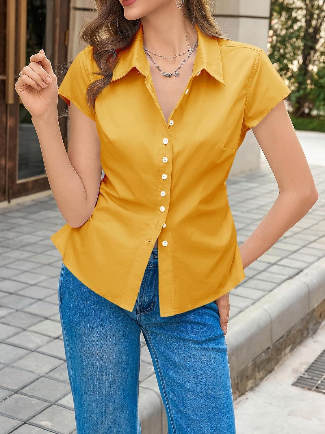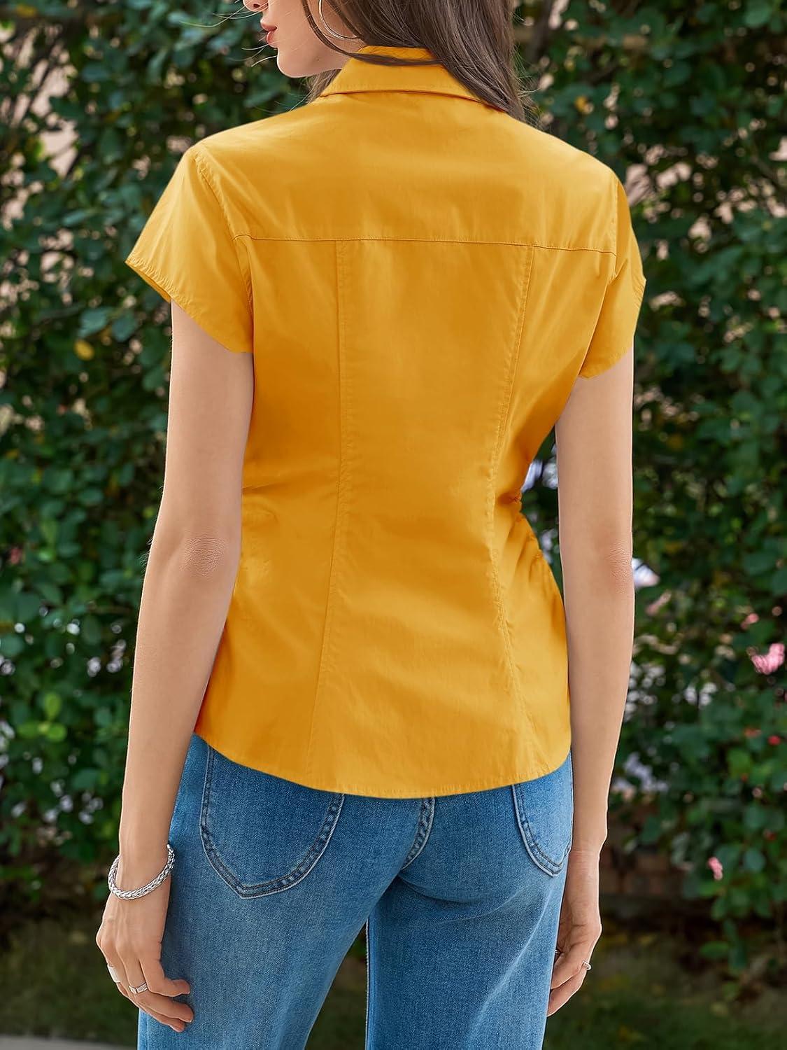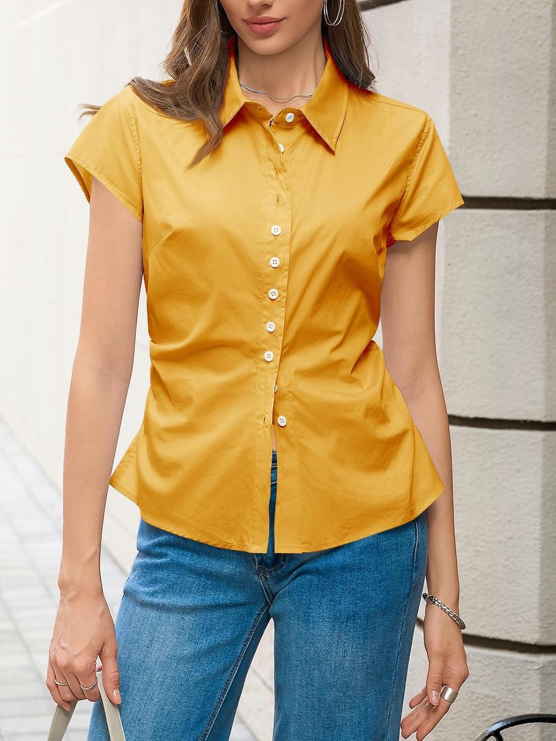 Cicy Bell Womens Summer Button Down Shirts Short Sleeve Slim Fit Ruched Cotton Blouses Cute Going Out Tops(Turmeric Yellow)