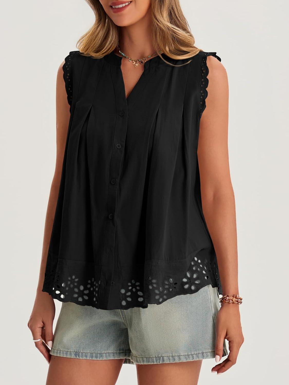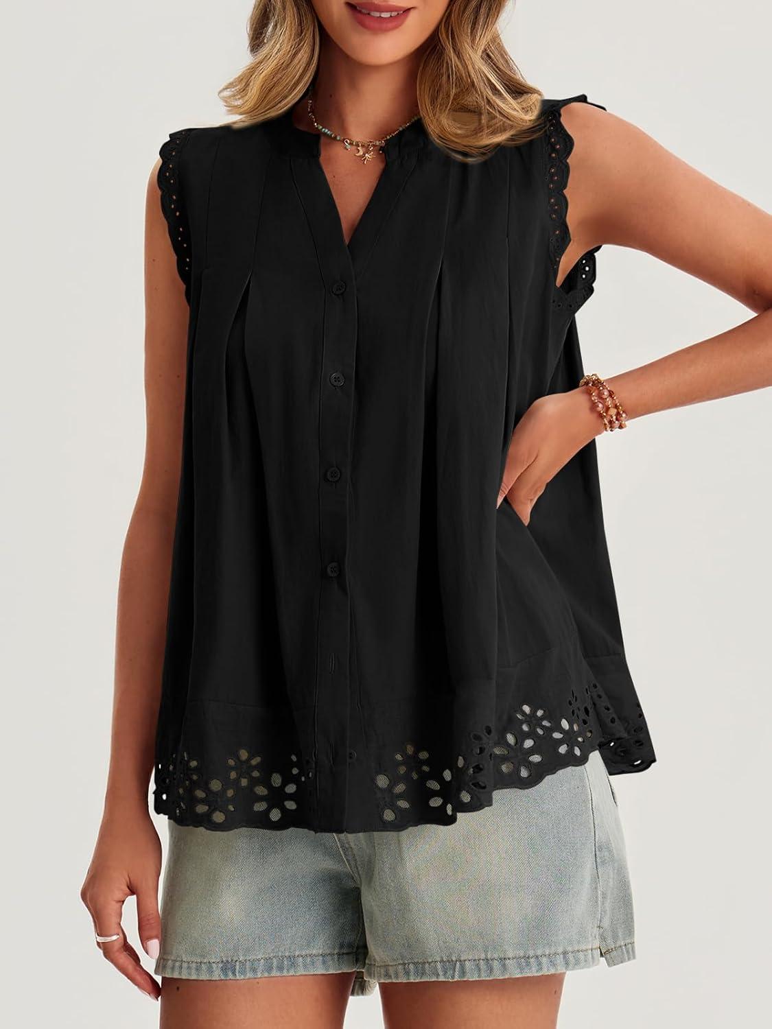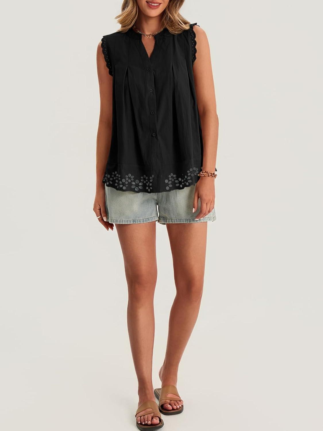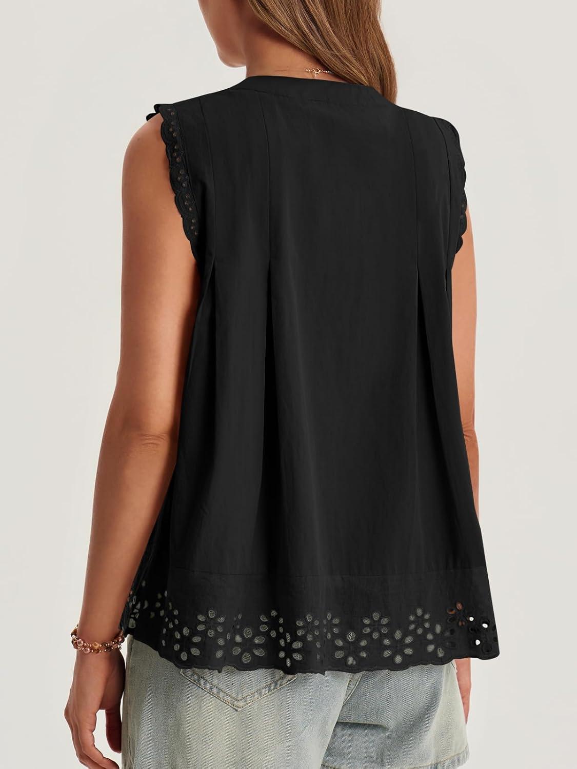 Cicy Bell Womens Summer Eyelet Tank Tops V Neck Ruffle Sleeveless Button Down Shirts Casual Cotton Loose Fit Tees(Black)