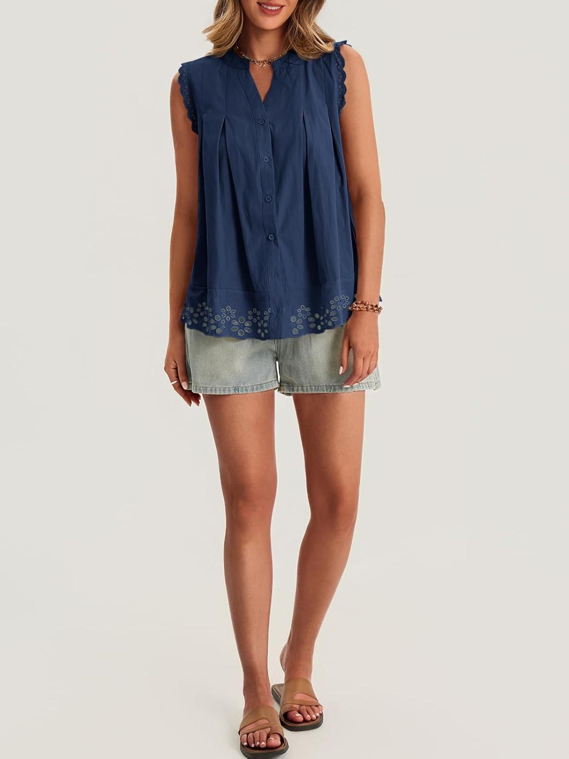 Cicy Bell Womens Summer Eyelet Tank Tops V Neck Ruffle Sleeveless Button Down Shirts Casual Cotton Loose Fit Tees(Navy)