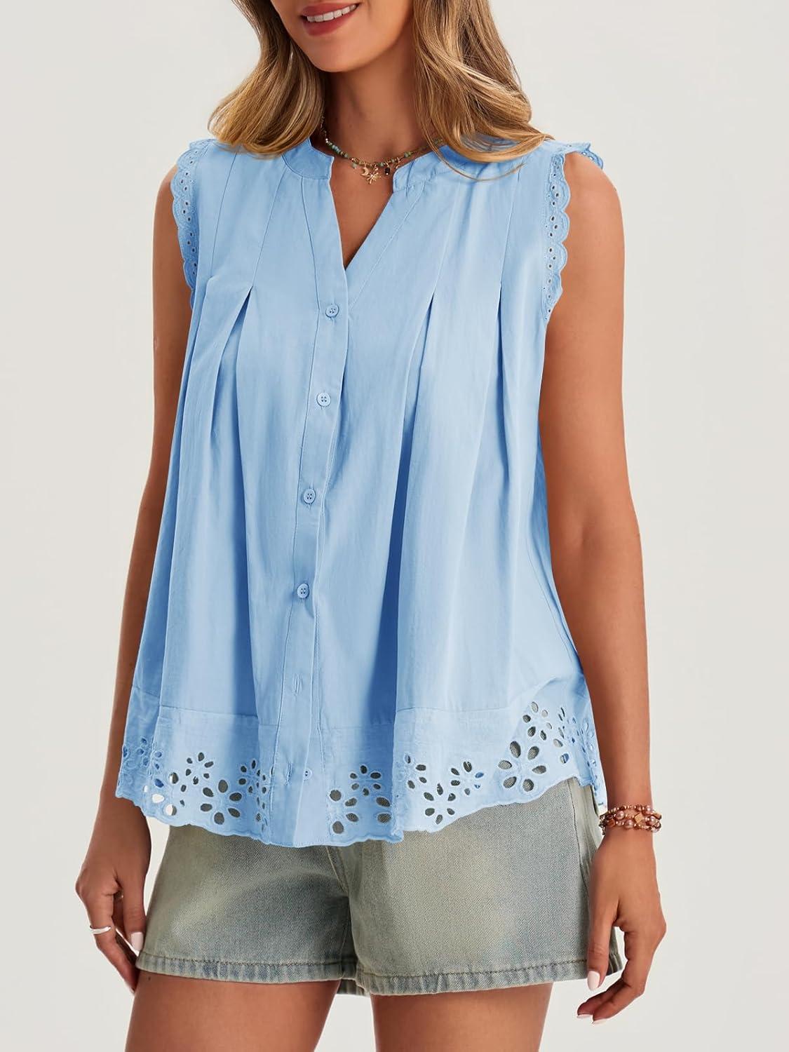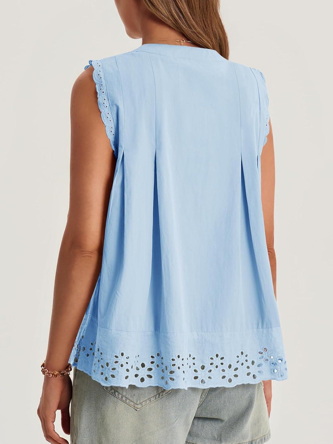 Cicy Bell Womens Summer Eyelet Tank Tops V Neck Ruffle Sleeveless Button Down Shirts Casual Cotton Loose Fit Tees(Sky Blue)