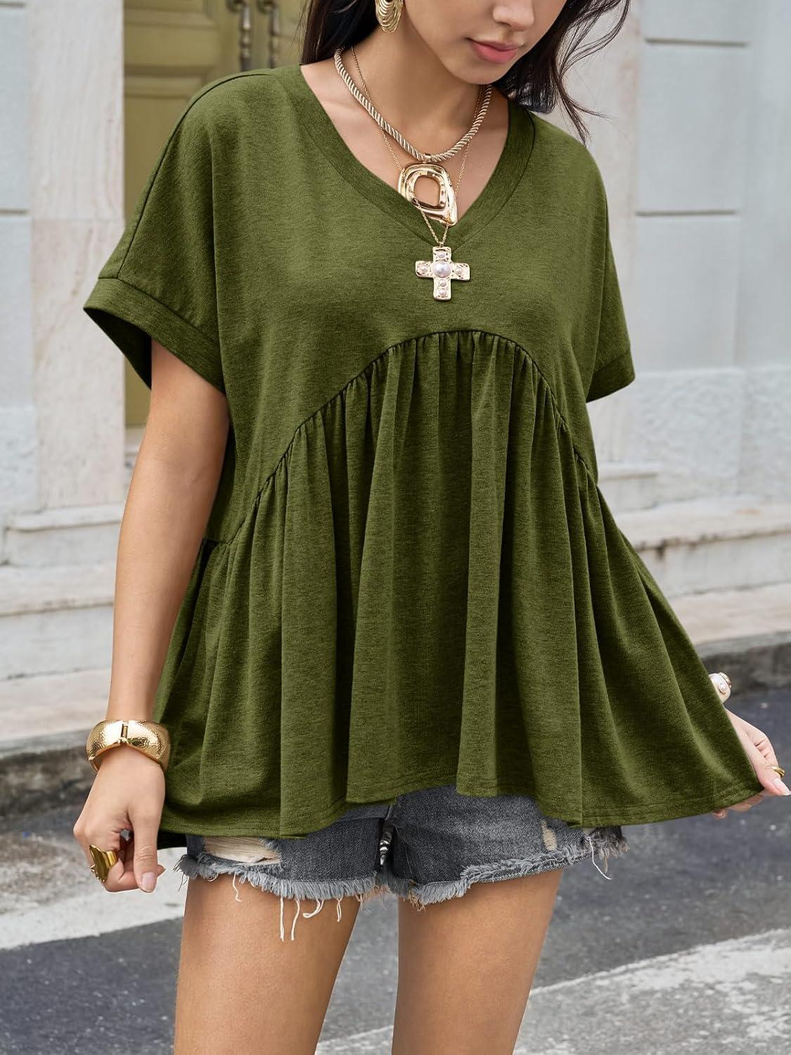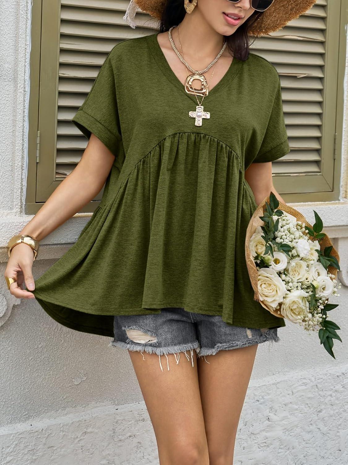 Cicy Bell Womens Summer Peplum Tops Oversized Babydoll Short Sleeve V Neck T Shirts Casual Loose Pleated Swing Blouse(Army Green)