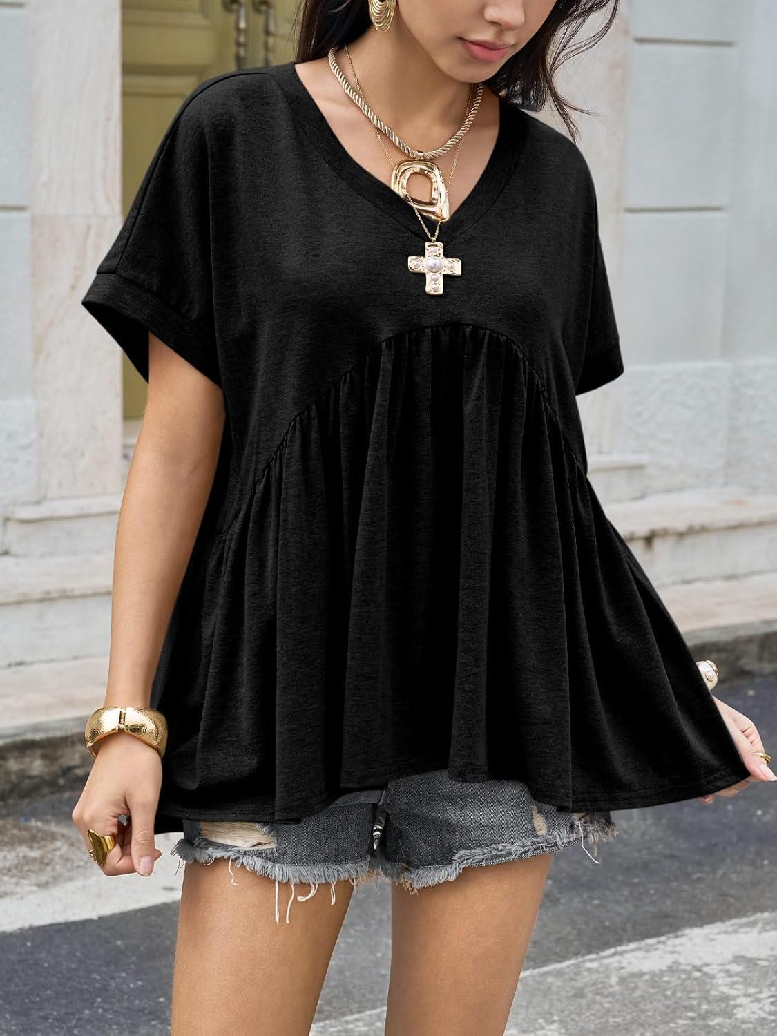 Cicy Bell Womens Summer Peplum Tops Oversized Babydoll Short Sleeve V Neck T Shirts Casual Loose Pleated Swing Blouse(Black)